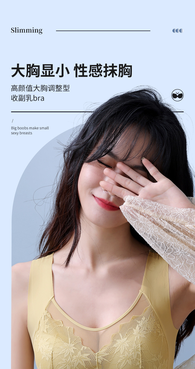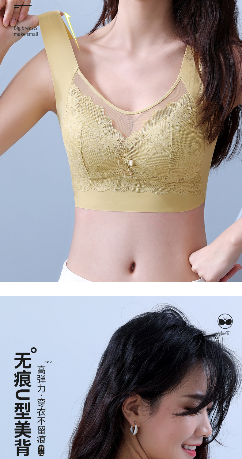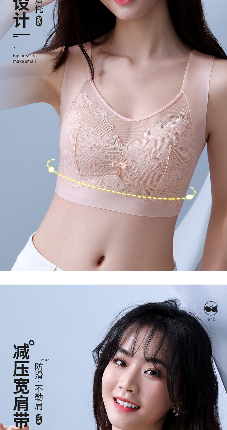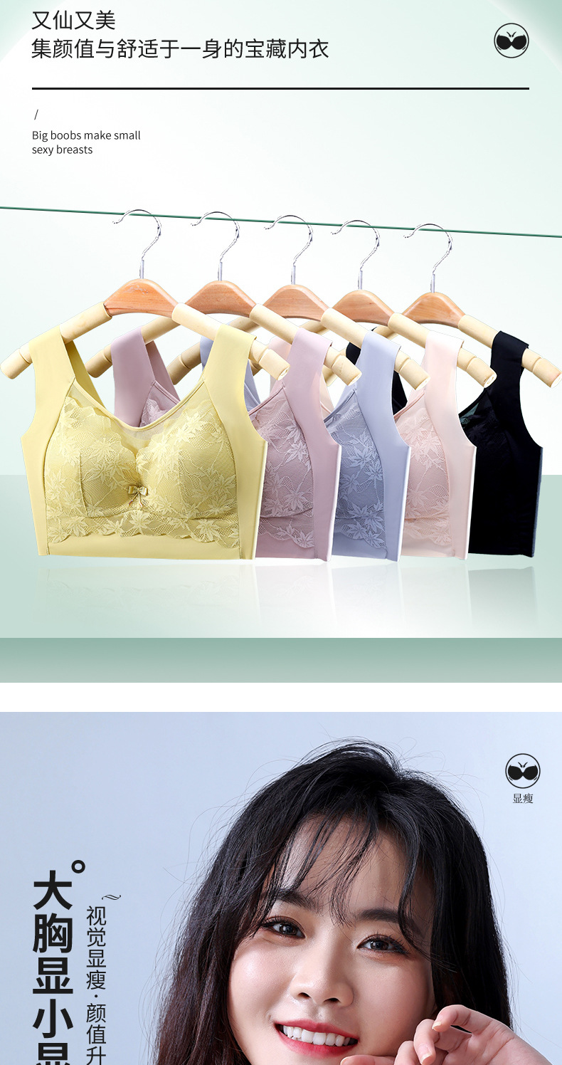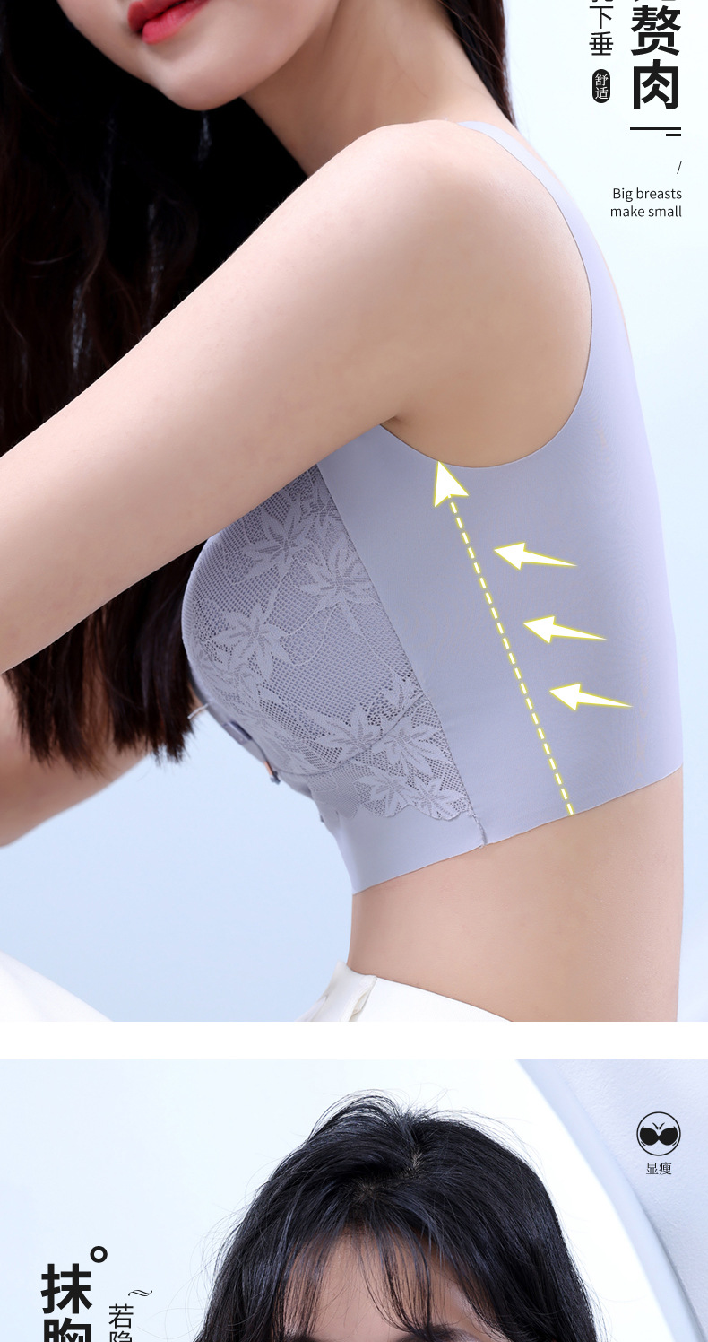 Chaleco envuelto en el pecho con encaje y espalda hermosa, sin anillo de acero, copa fija, leche auxiliar, anti-brillo, sujetador envuelto en el pecho sin costuras de gran tamaño