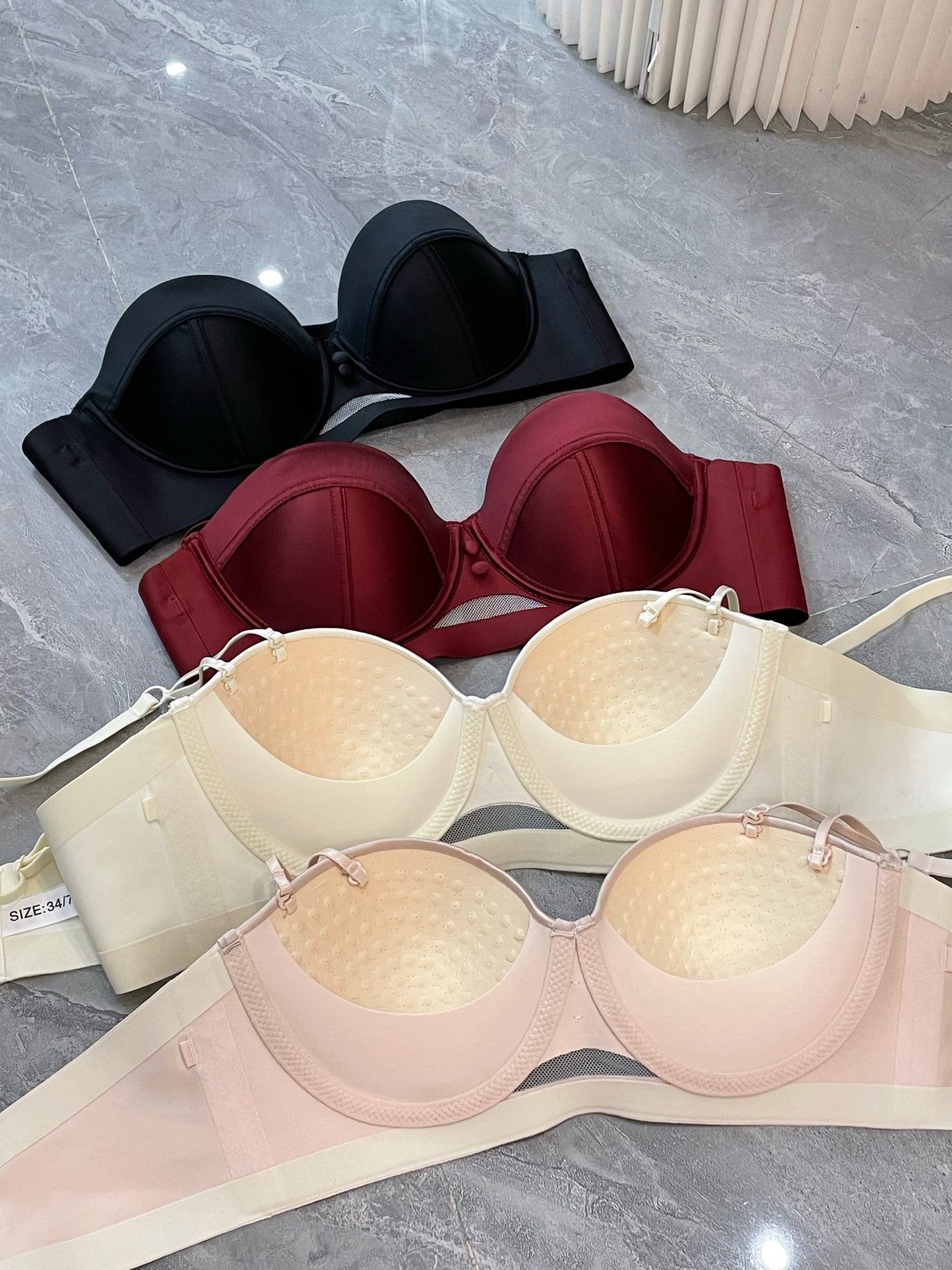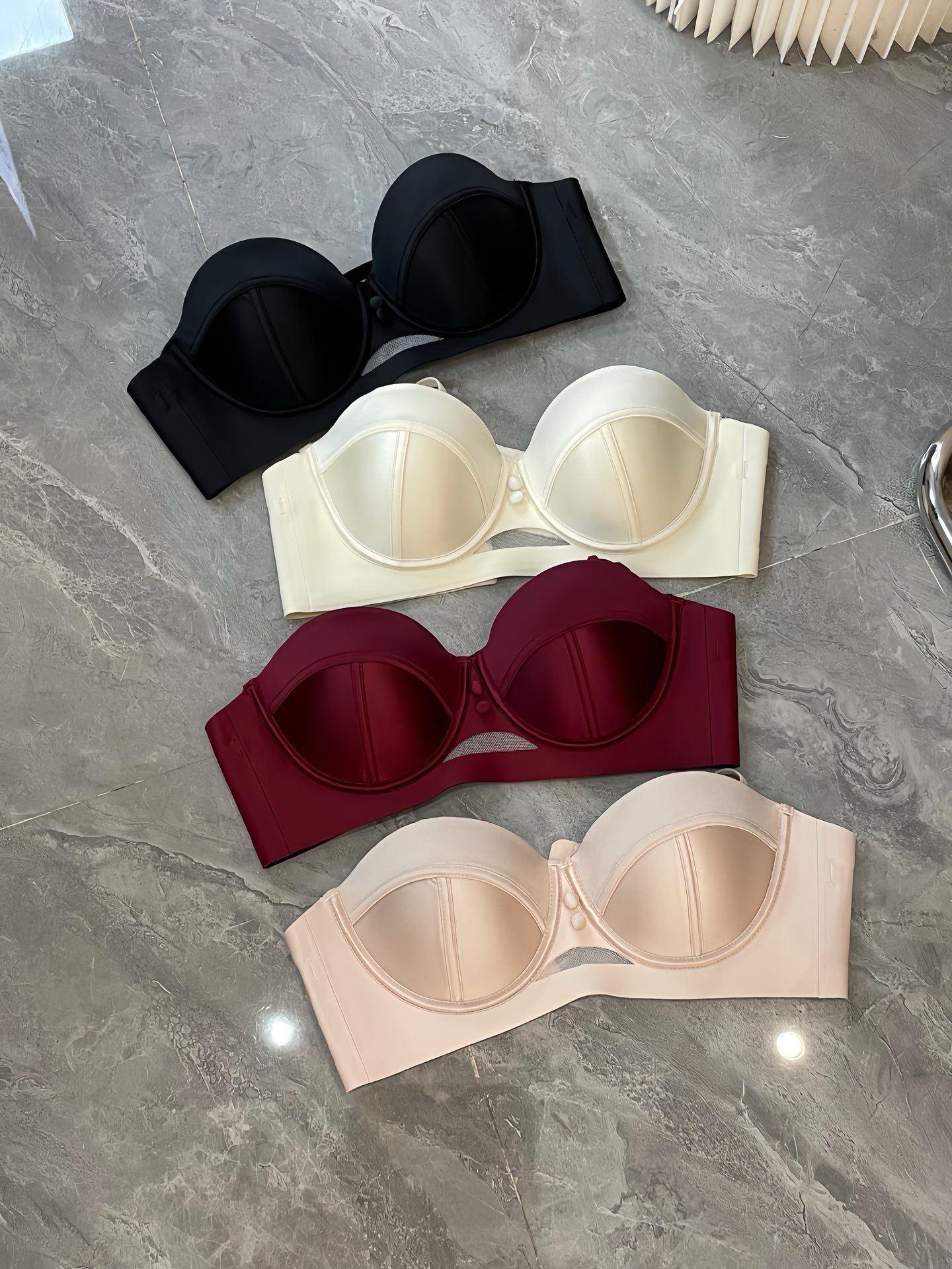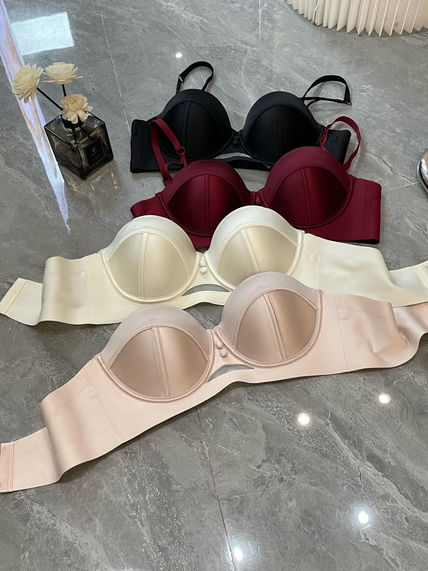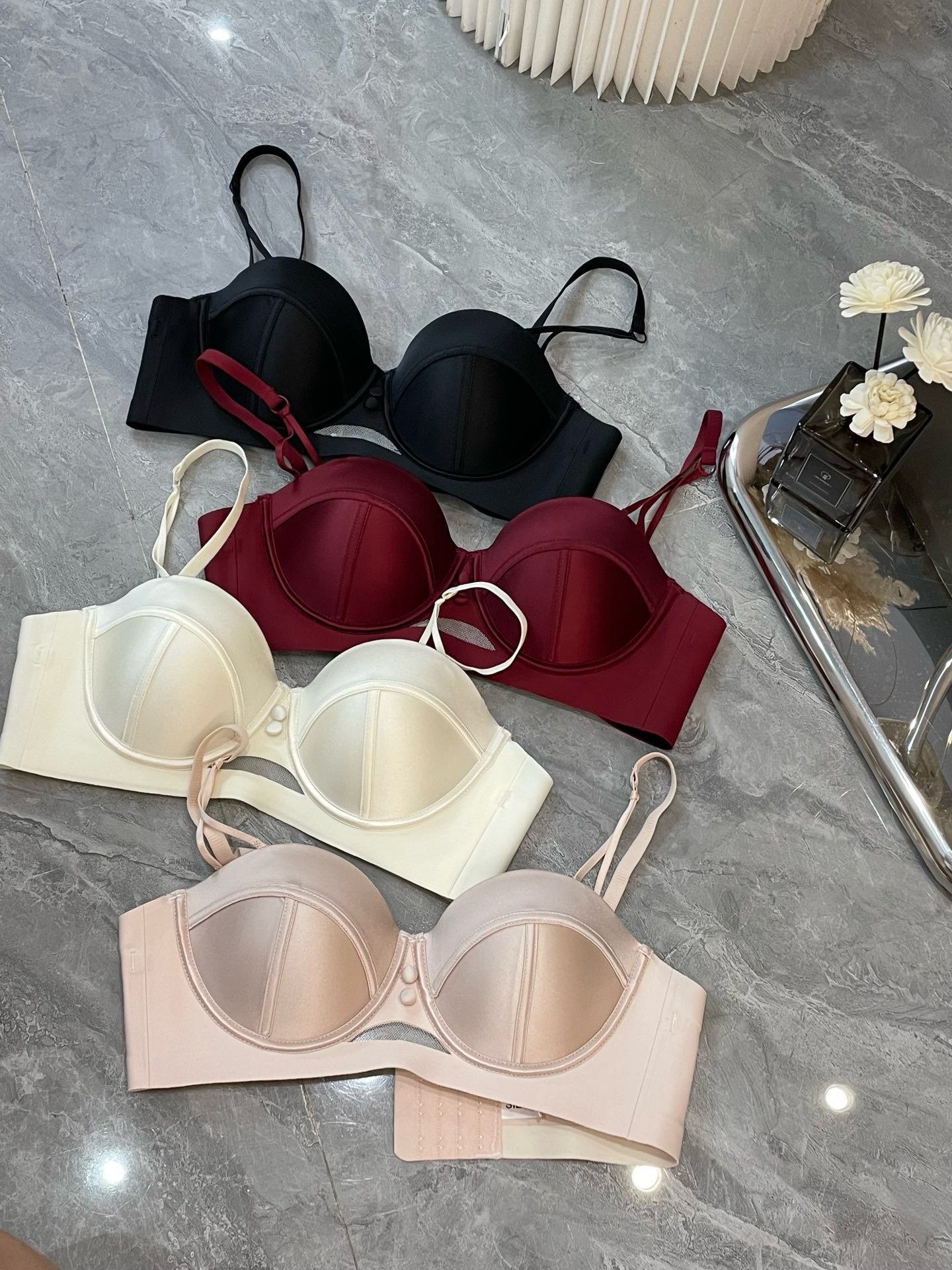 2898 Taza de masaje de pecho pequeño de satén nacarado de alta gama francesa, ropa interior súper fruncida, sujetador anti-flacidez superior para mujer