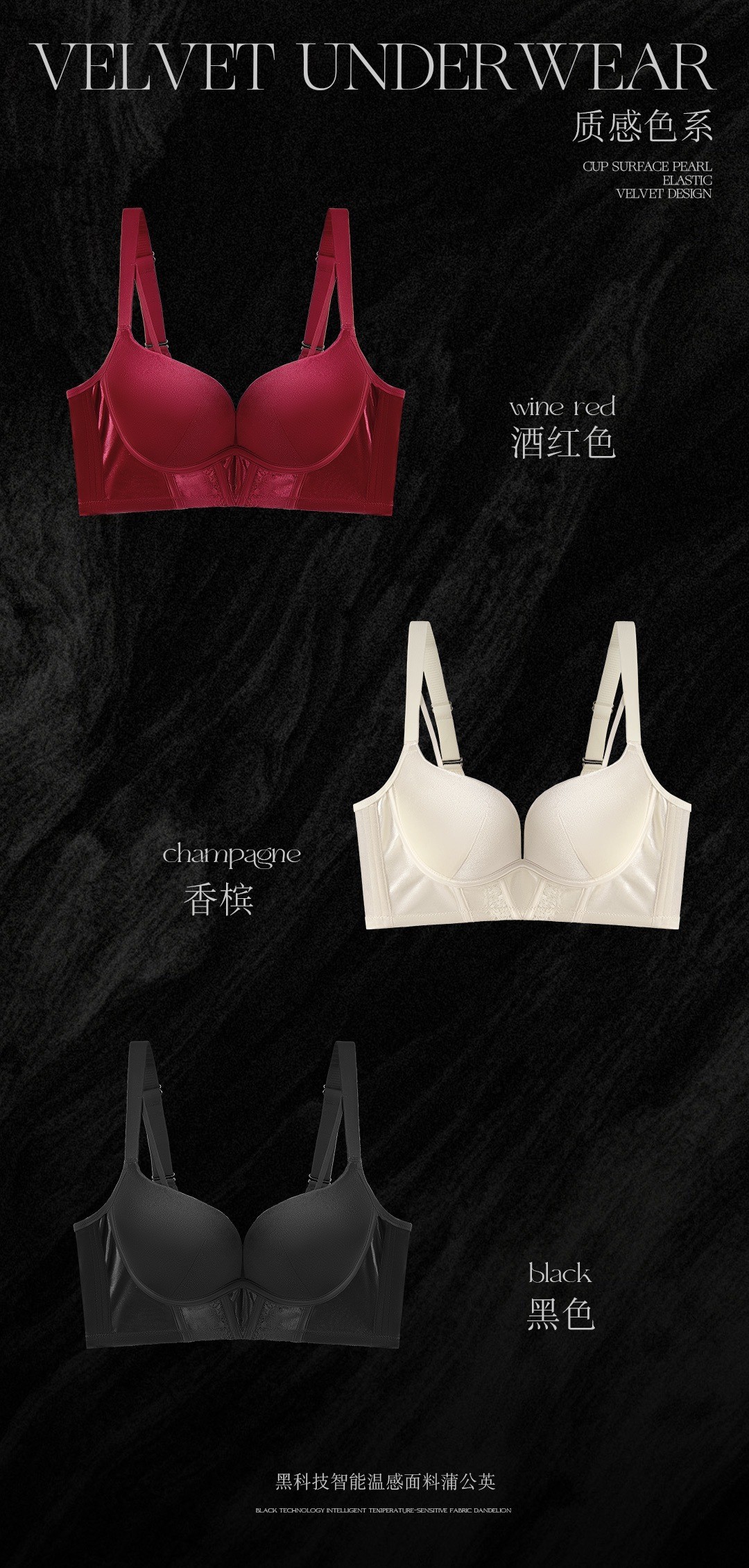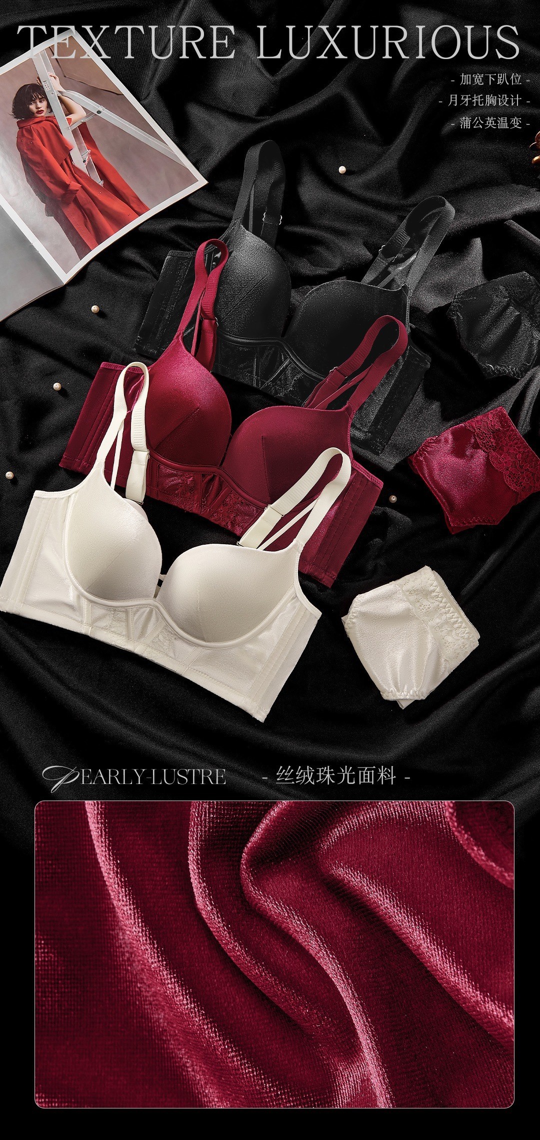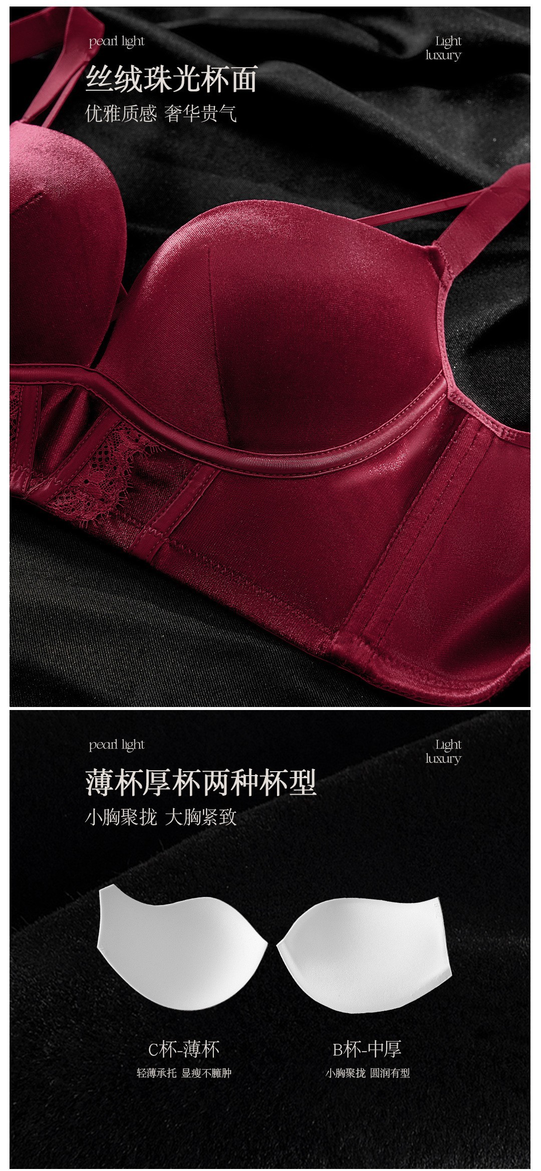 8788 Conjunto de ropa interior térmica de terciopelo elástico nacarado de lujo Cómodo sin anillo de acero, sujetador de colección lateral de grosor medio