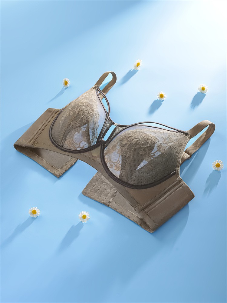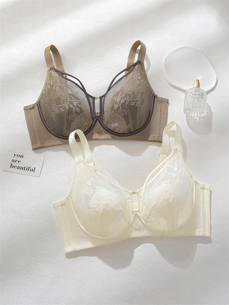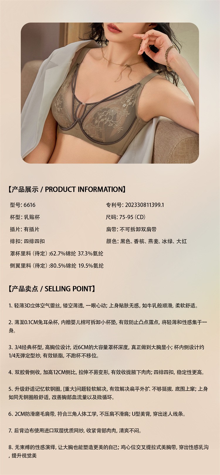 6616 Sujetador de encaje sexy con anillo de acero suave francés, orejas de conejo ligeras, pechos grandes, memoria pequeña, ropa interior ajustable de titanio