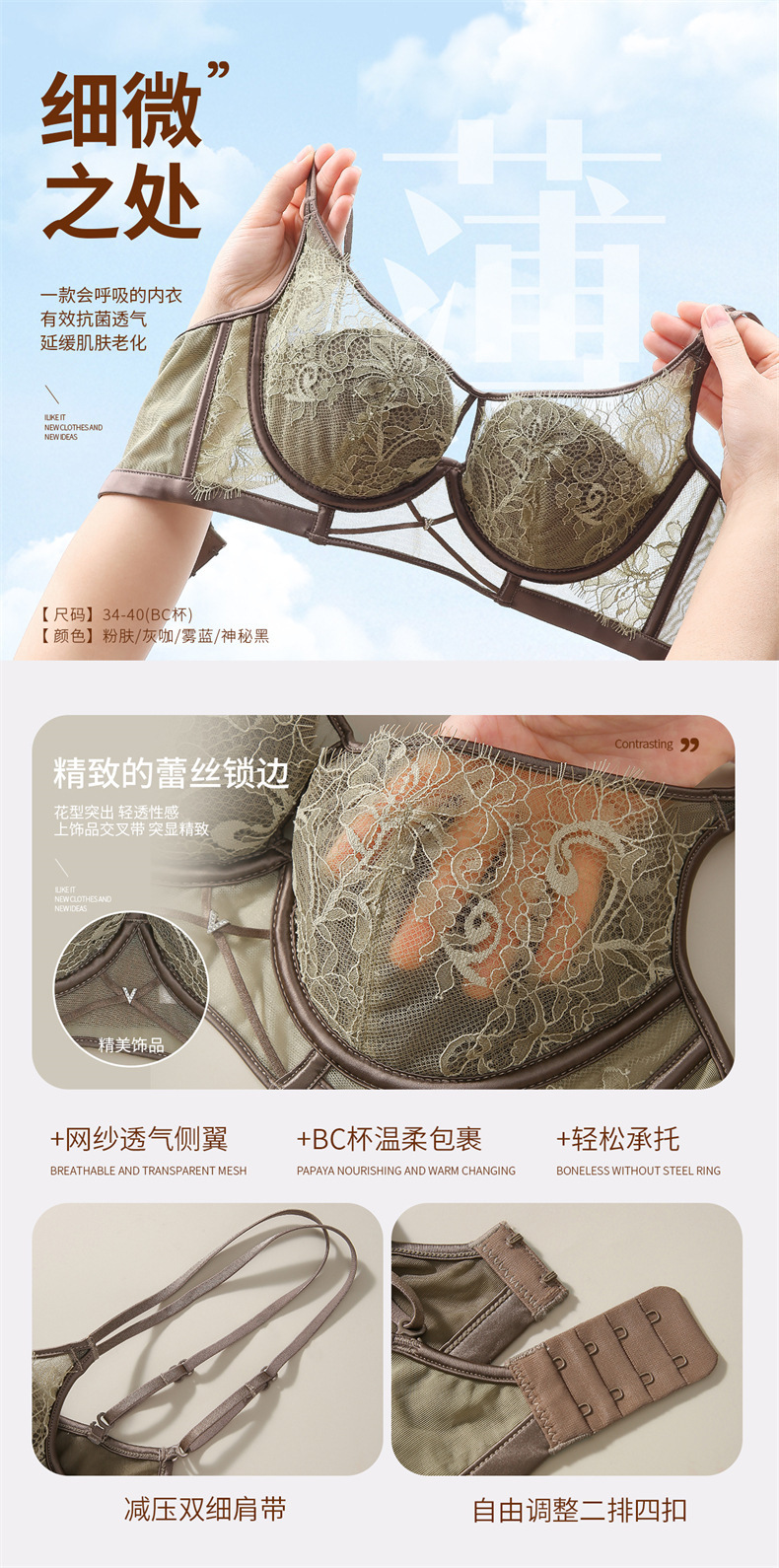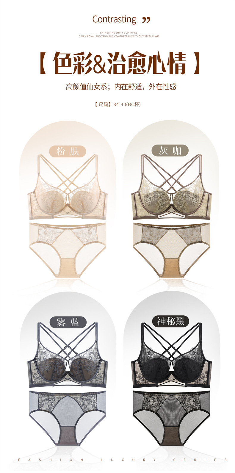 8738 Encaje de alta gama y pasado transpirable ropa interior hueca sexy pecho pequeño recogido sujetador de espalda hermoso anti-caída