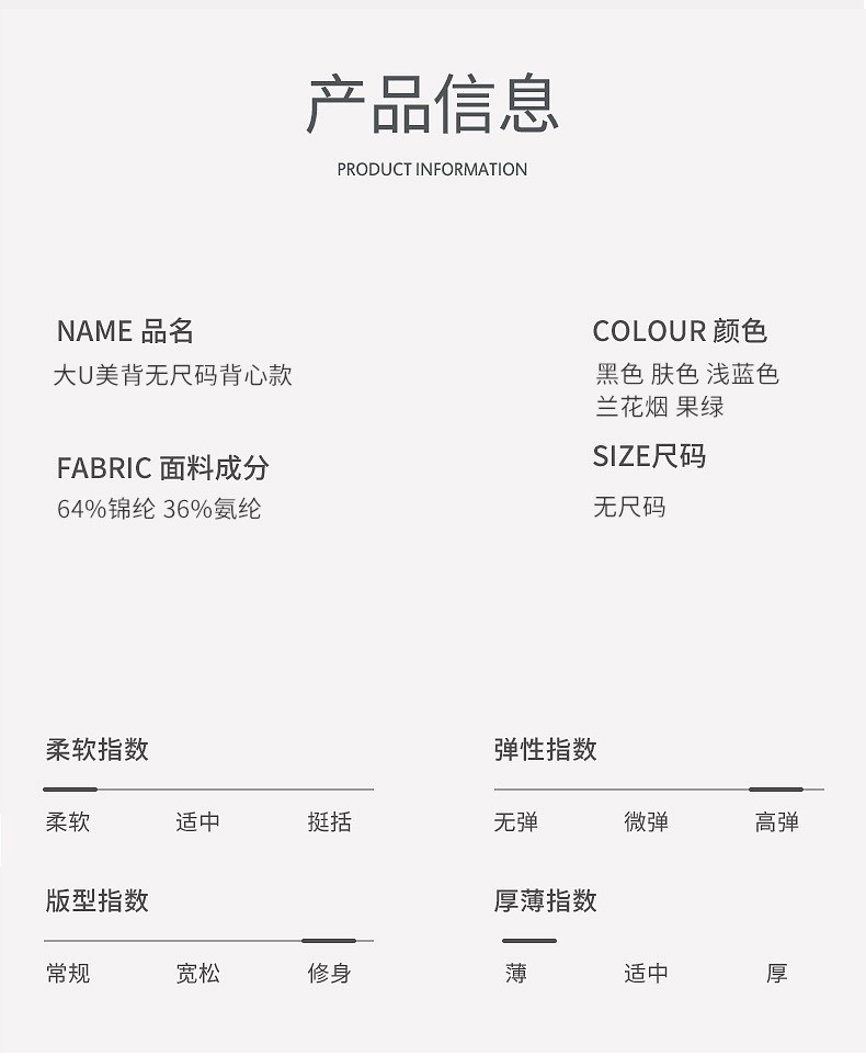 | Color | Wide U espalda (negro),Amplia espalda en U (color de piel),Wide U espalda (rosa),Amplia espalda U (azul claro),Amplia espalda en U (fruta verde) |