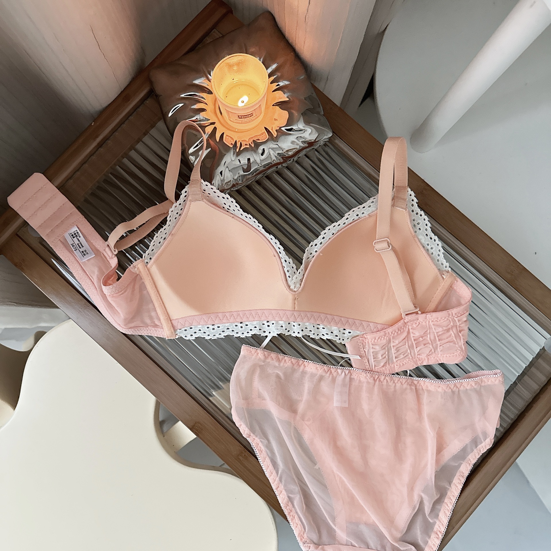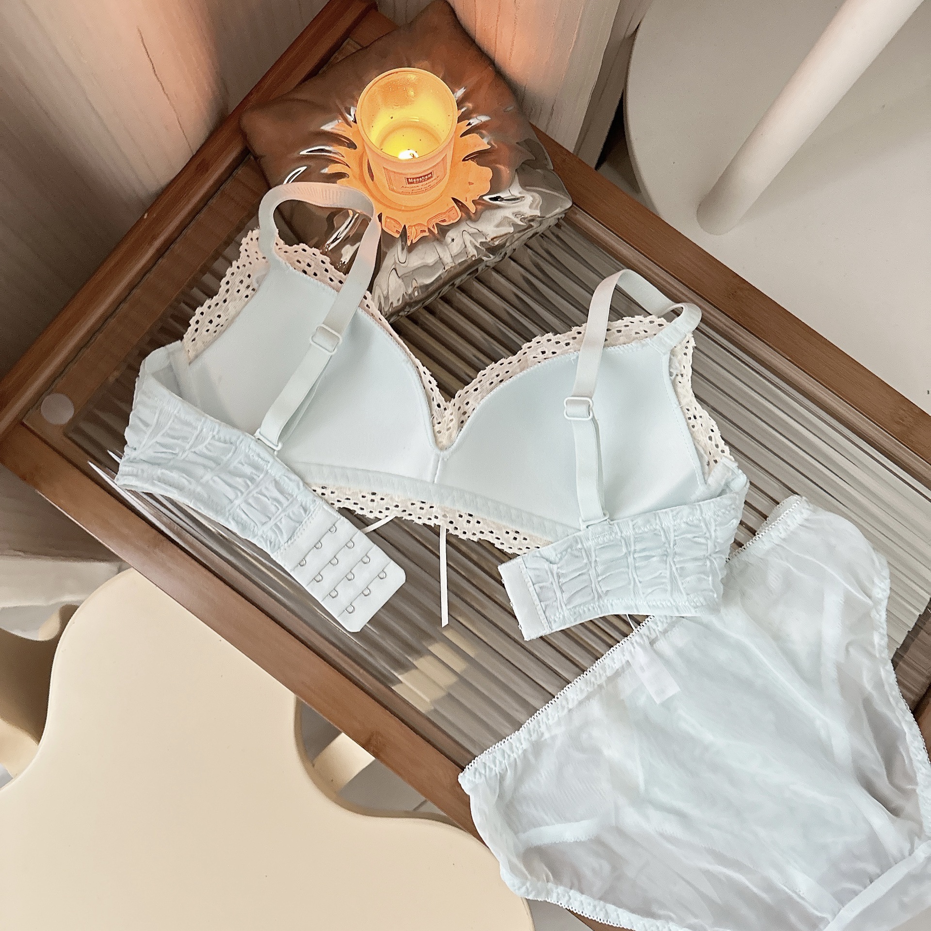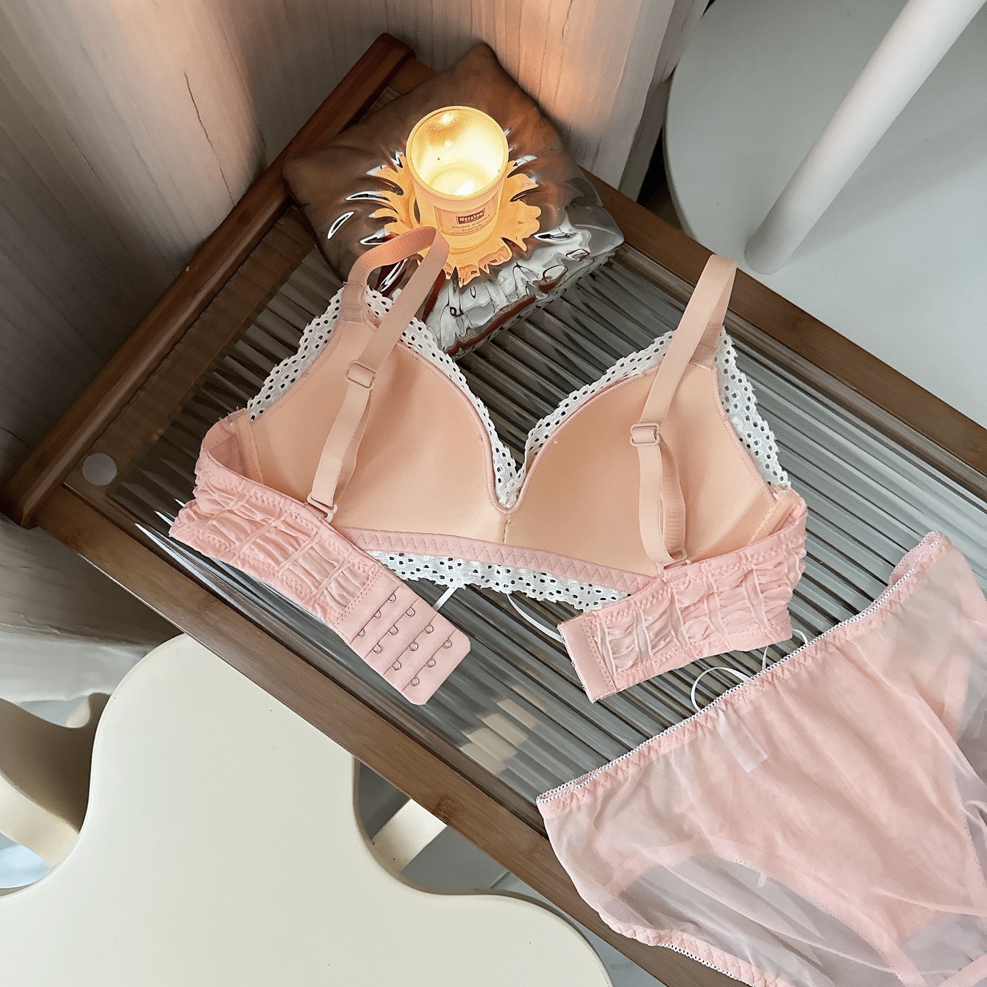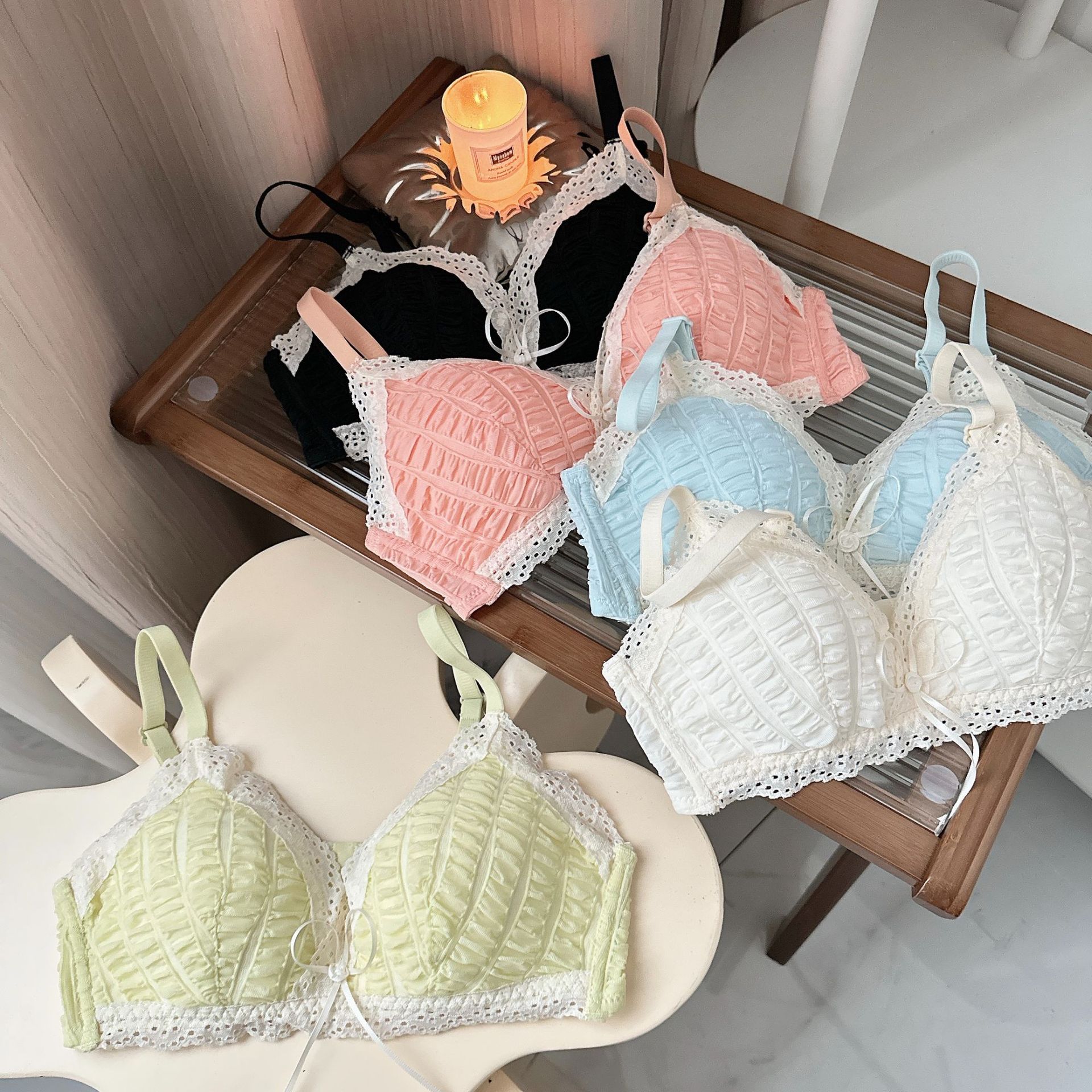 Ropa interior femenina francesa de copa triangular en V profunda, sujetador fruncido sin anillo de acero, sujetador delgado, cómodo y transpirable sin costuras