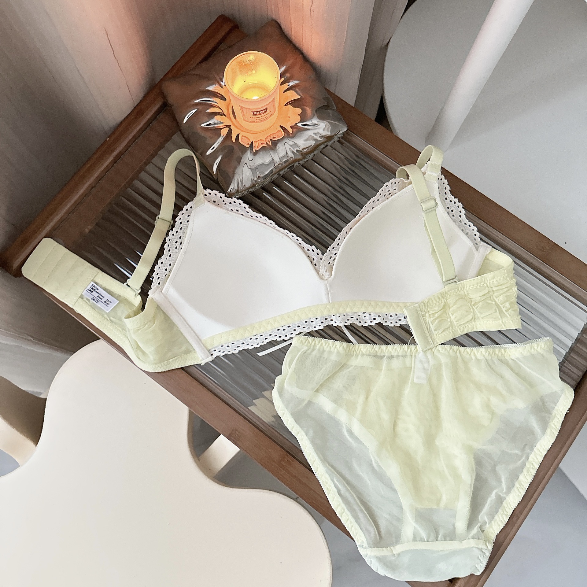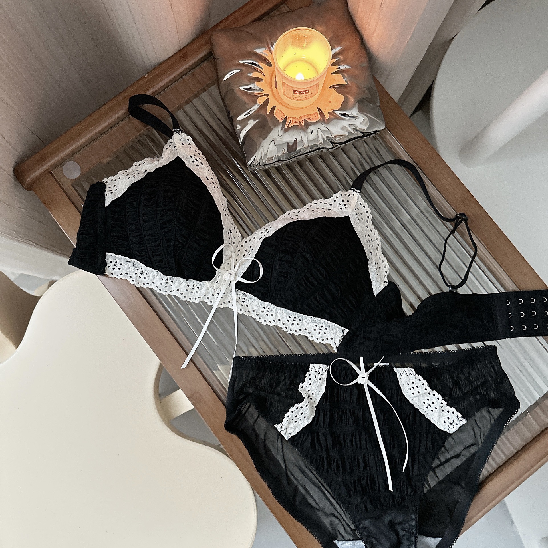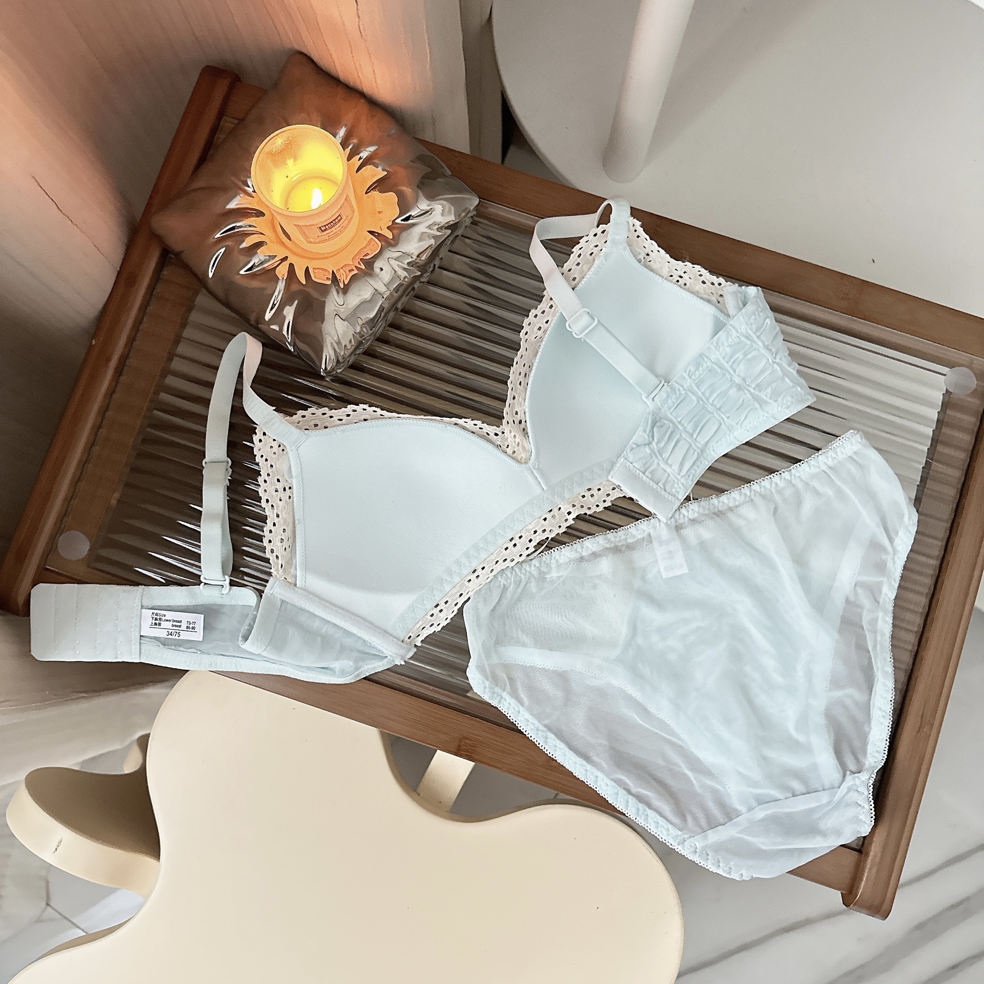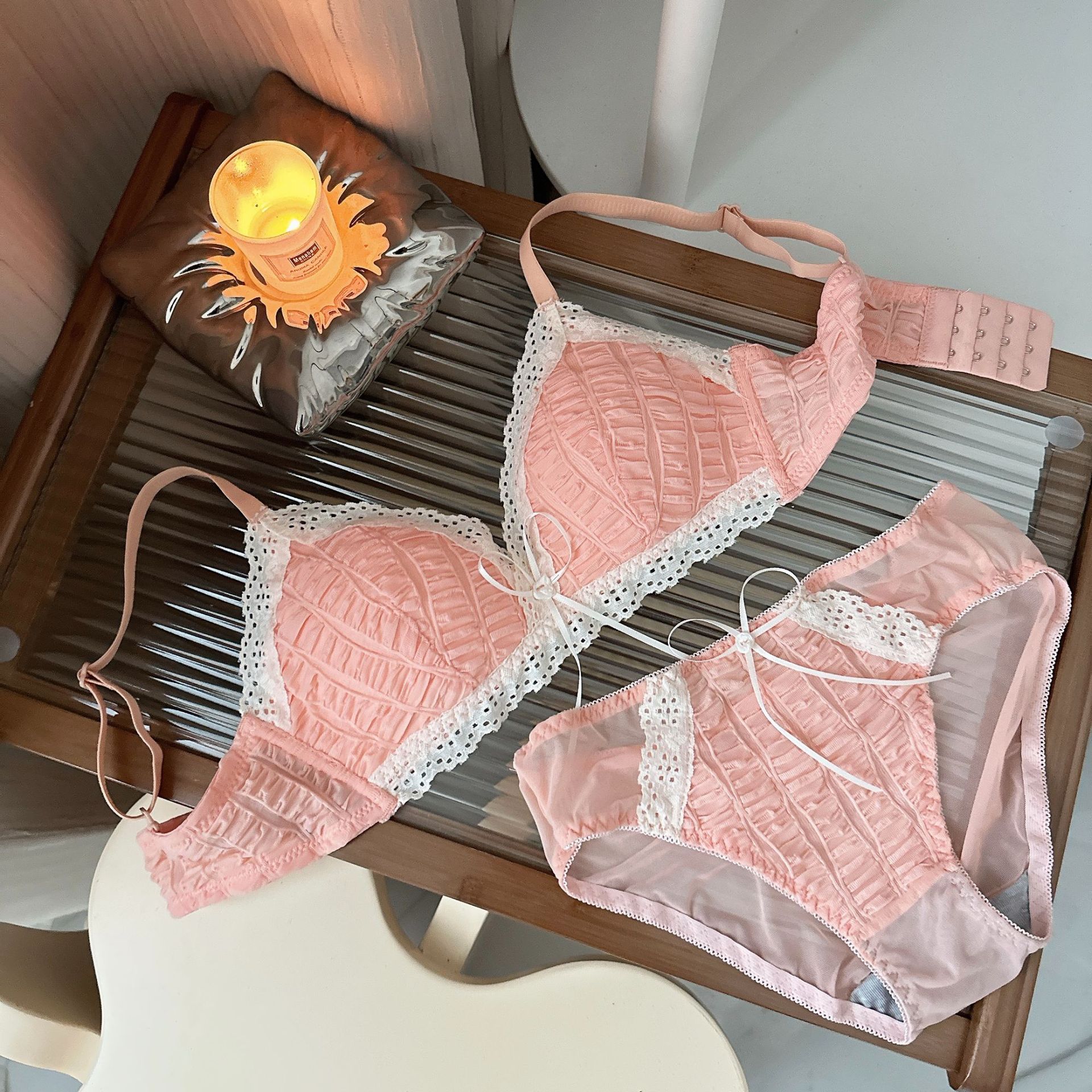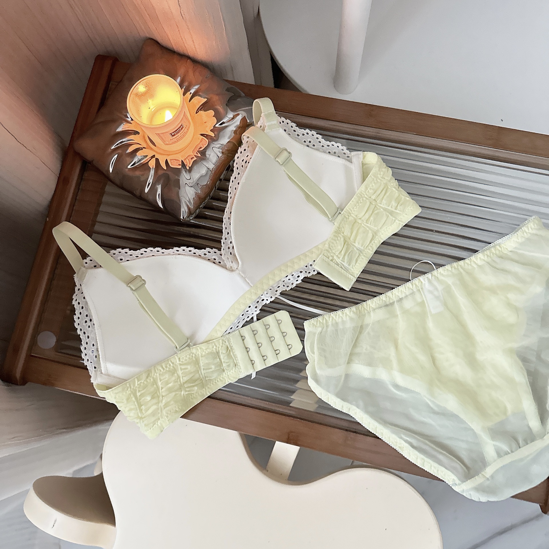 Ropa interior femenina francesa de copa triangular en V profunda, sujetador fruncido sin anillo de acero, sujetador delgado, cómodo y transpirable sin costuras