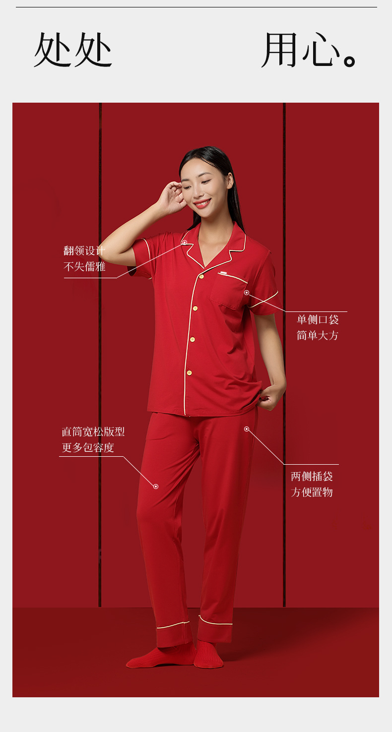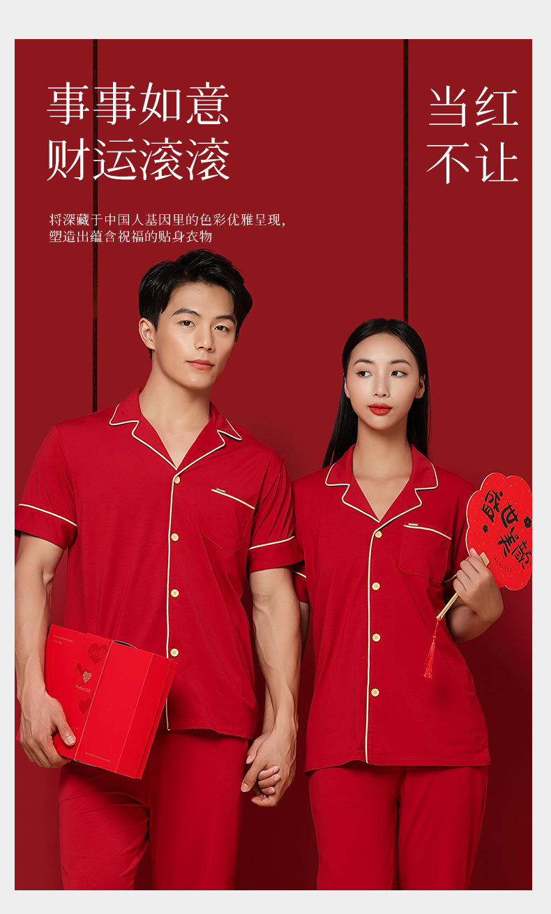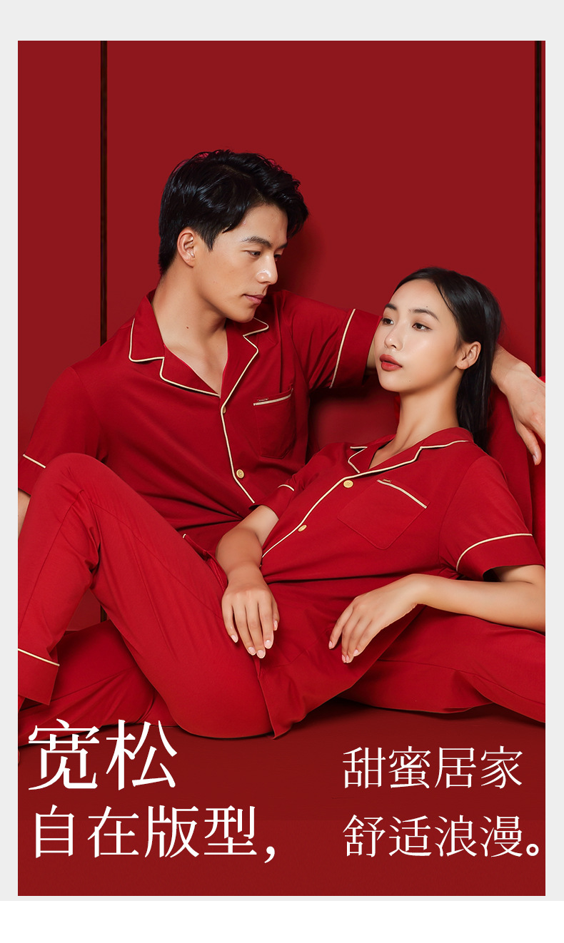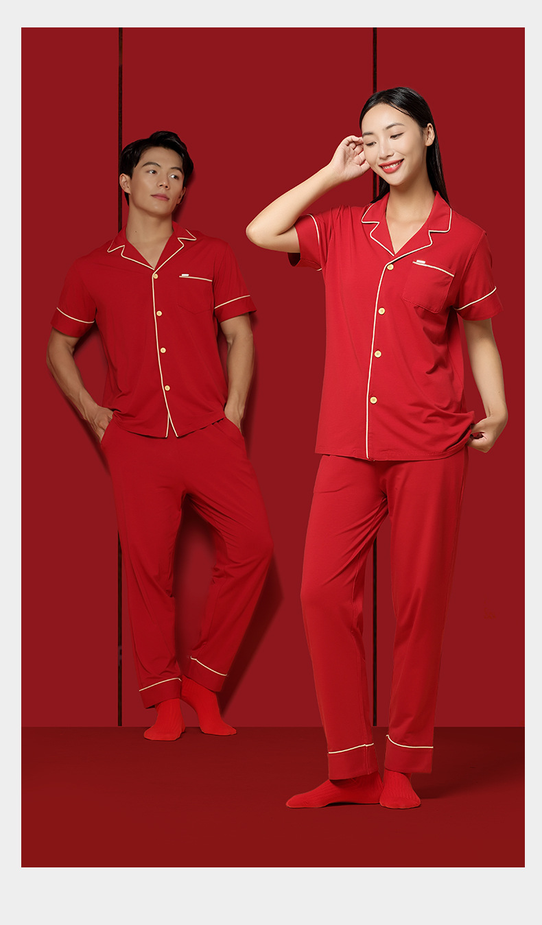 Nuevo conjunto de ropa de estar en casa de manga corta con cárdigan rojo de boda para parejas, de algodón modal, de 60 unidades, transfronterizo, en stock.