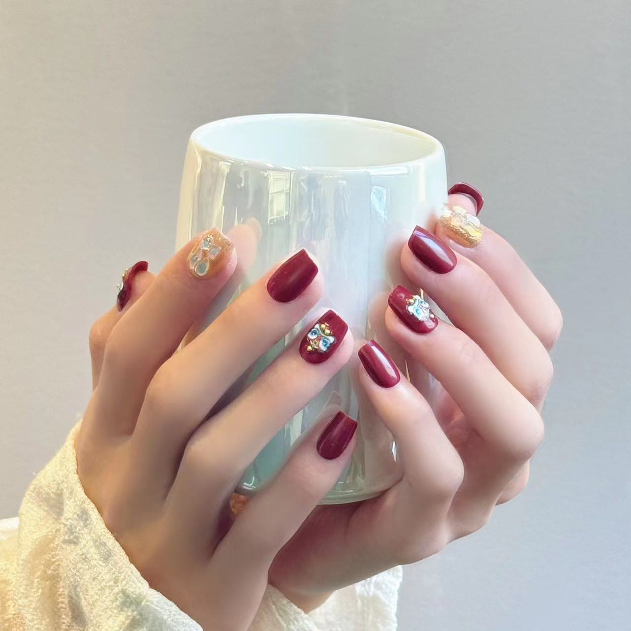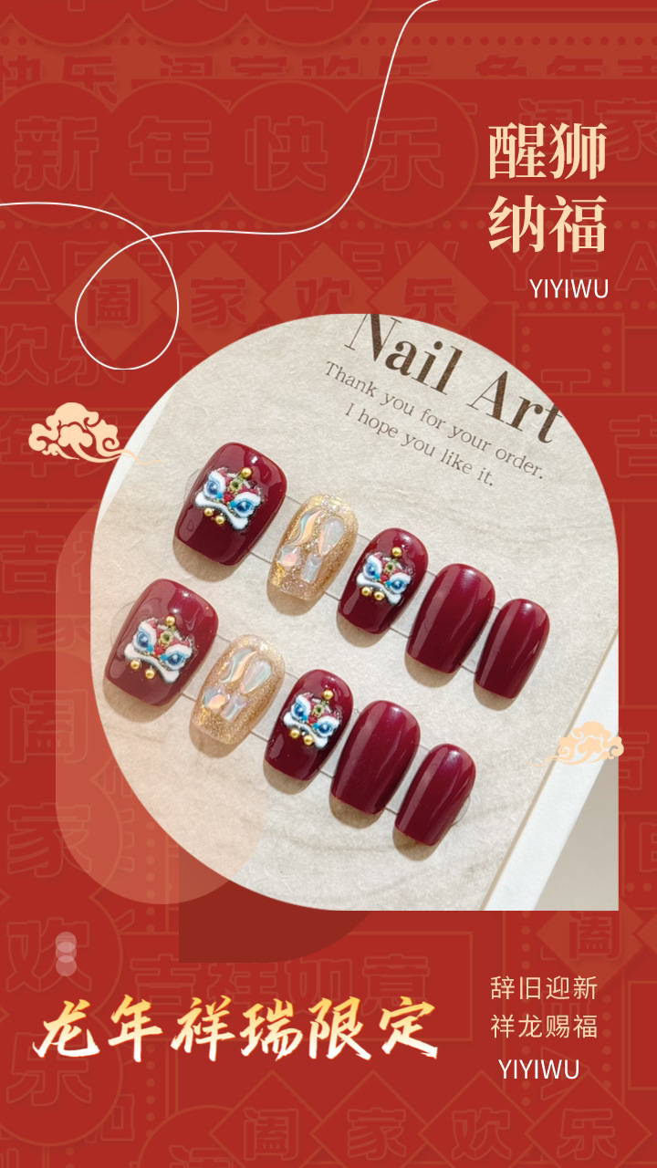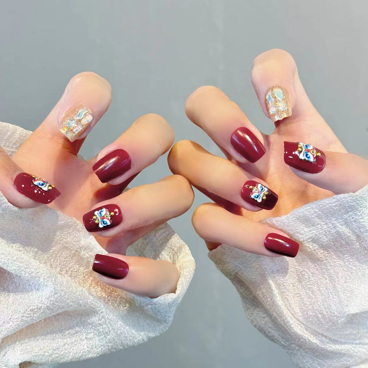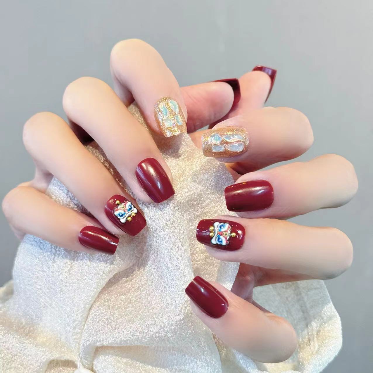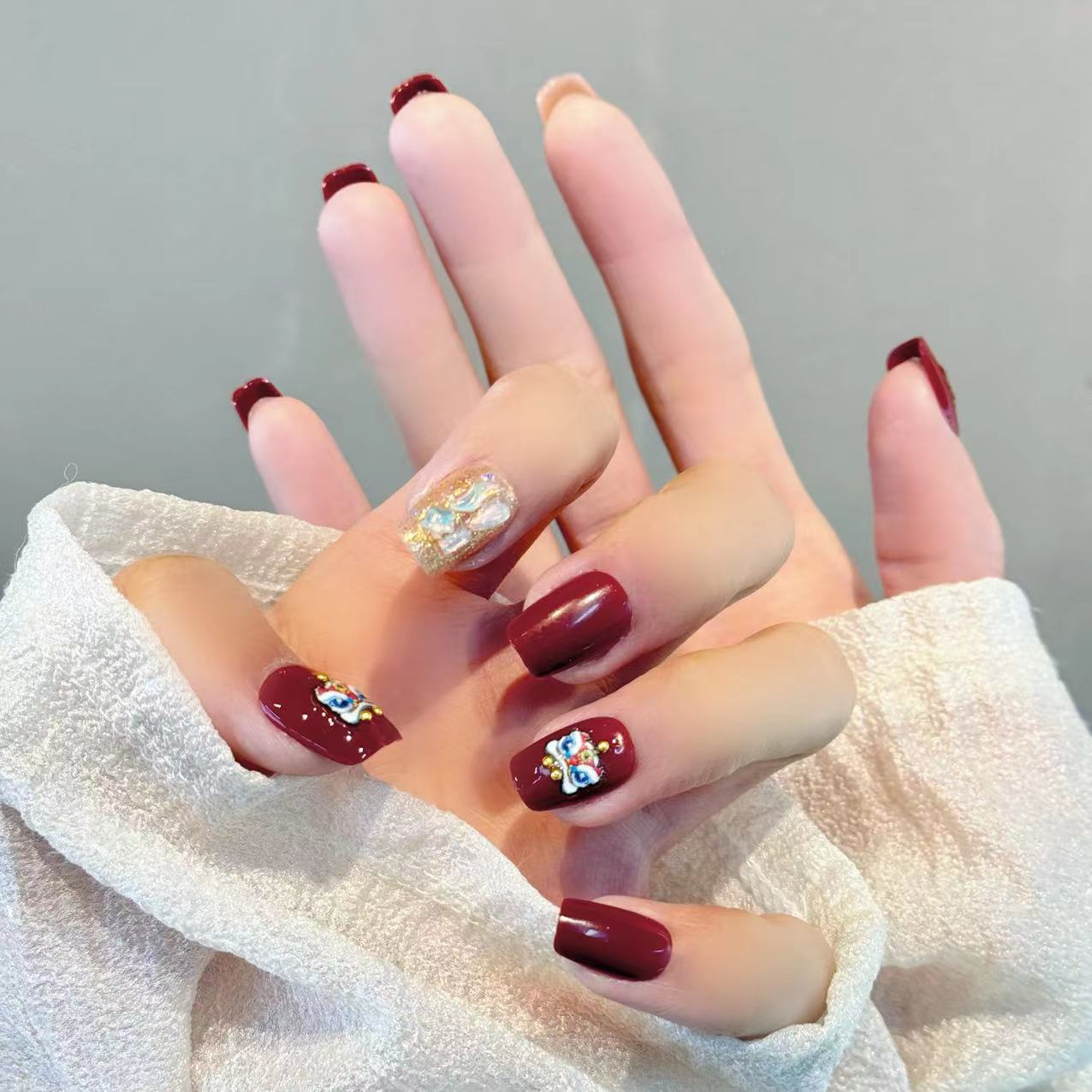 ¡Xingshi NAFU! Año nuevo armadura Lucky Flash con diamantes uñas falsas blanco corto estilo chino Año Nuevo