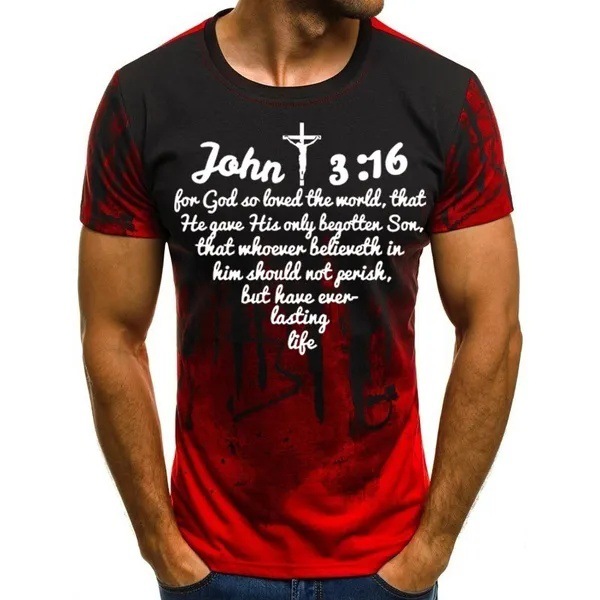 Verano casual suelto cuello redondo manga corta hombro transpirable camiseta de hombre Pascua Jesús gradiente lema 3D impresión