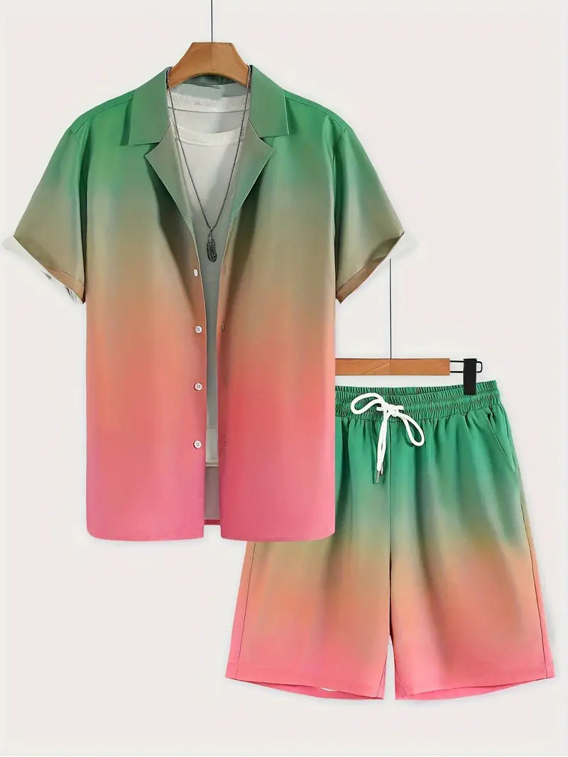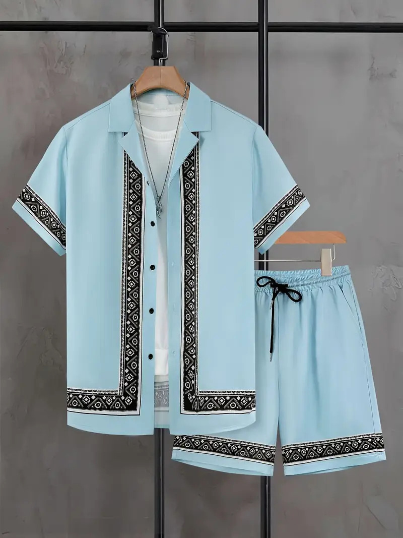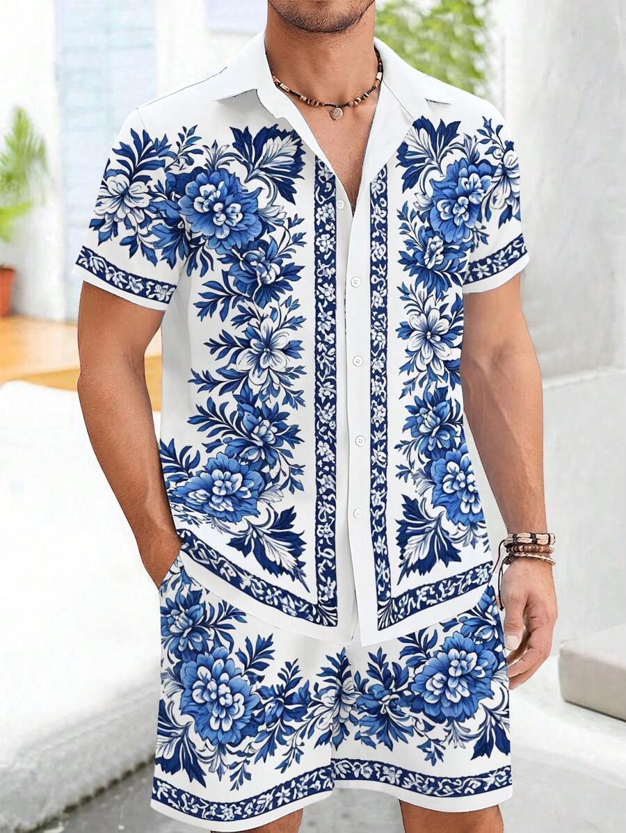 Transfronterizo 2024 nuevo estilo Amazon moda europea y americana casual todo fósforo manga corta cuello cubano pantalones cortos traje MB05 MA1