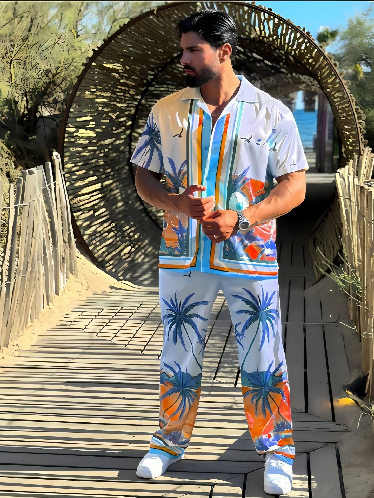Traje de pantalones de manga corta con cuello cubano cómodo de estilo casual de vacaciones junto al mar hawaiano para hombre MB5-MR10