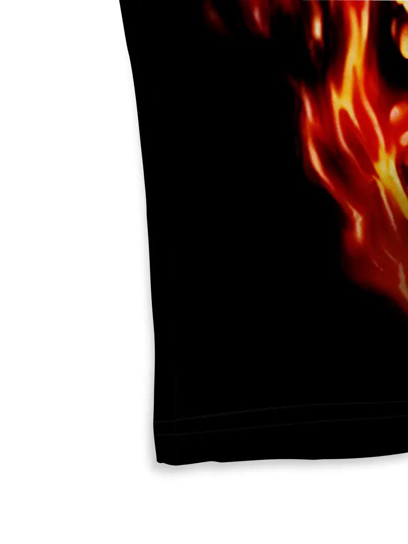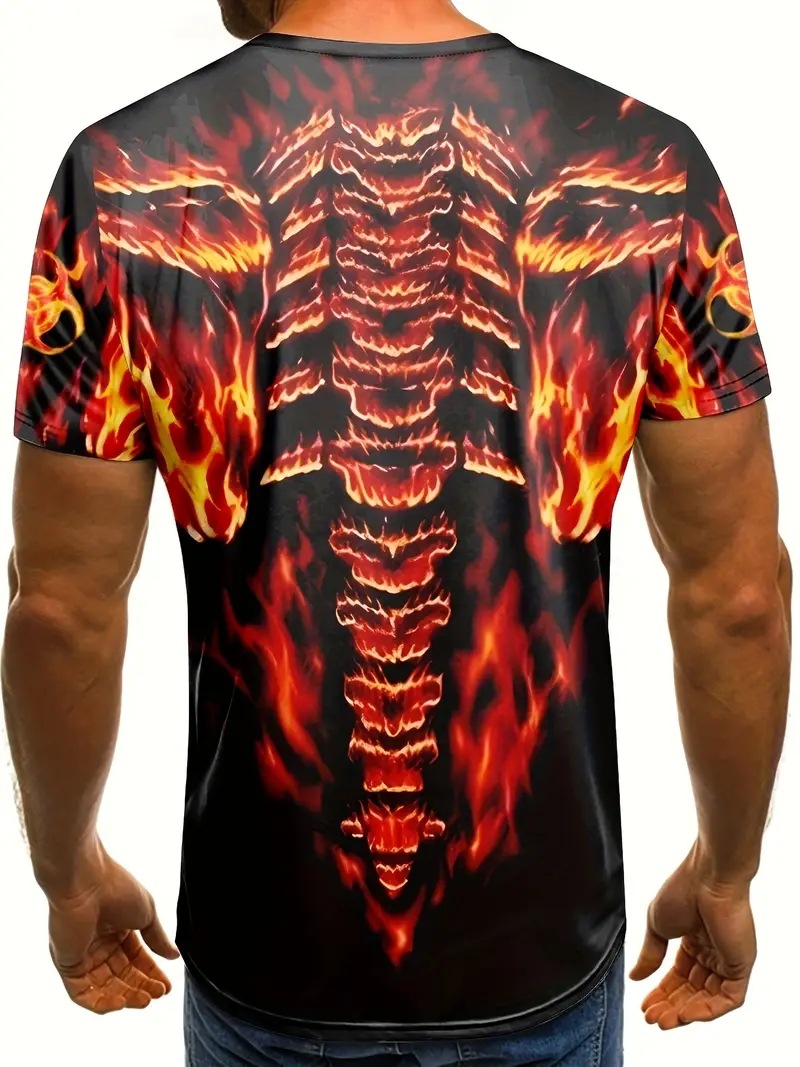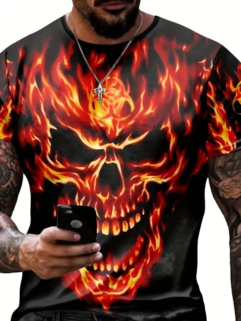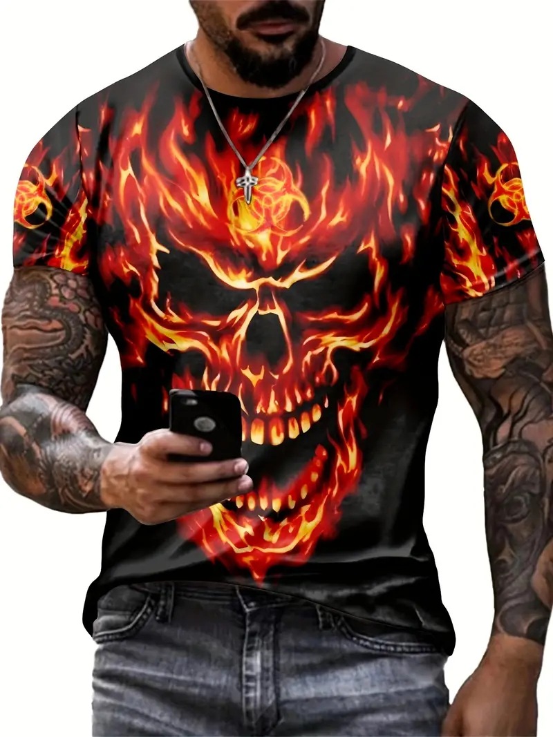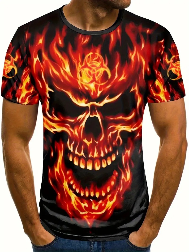 Hellfire Skull 3D Impresión digital de los hombres Verano suelto de malla de la calle alta transpirable de manga corta con cuello redondo camiseta en stock