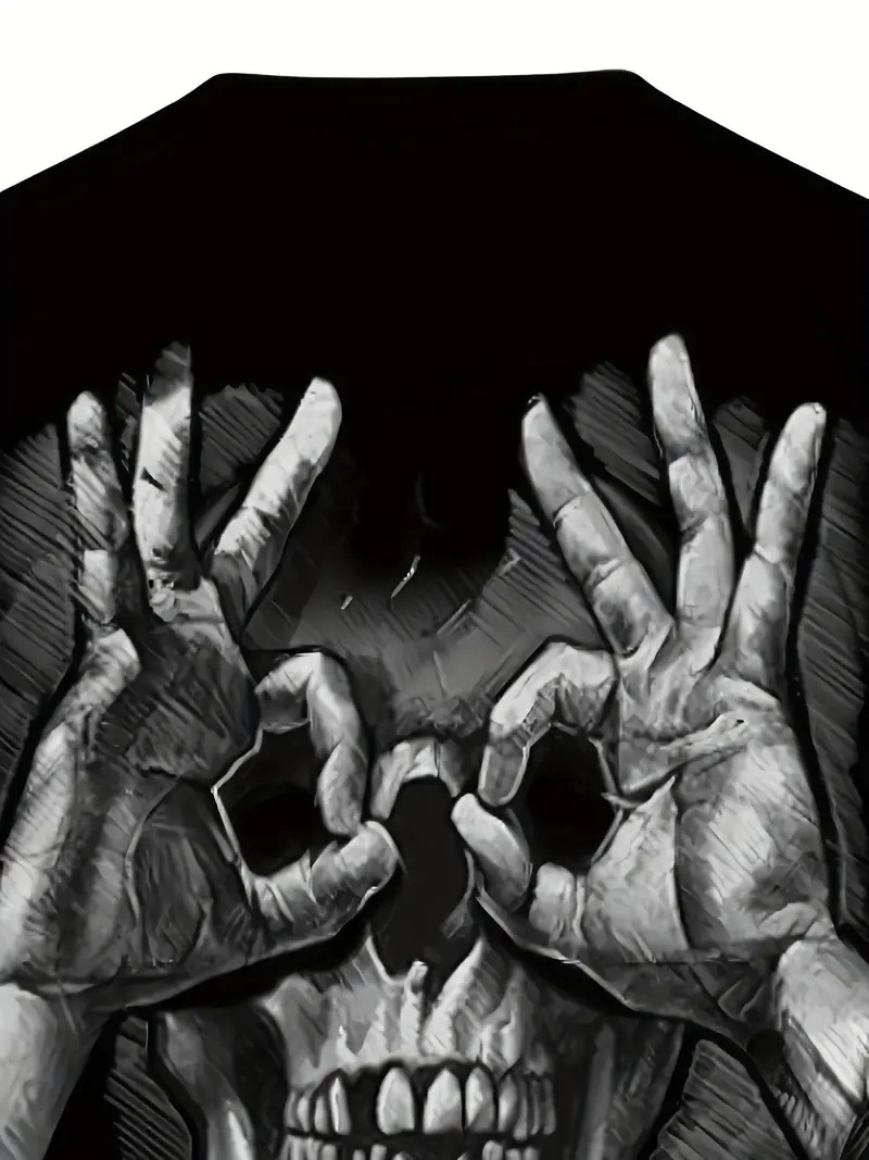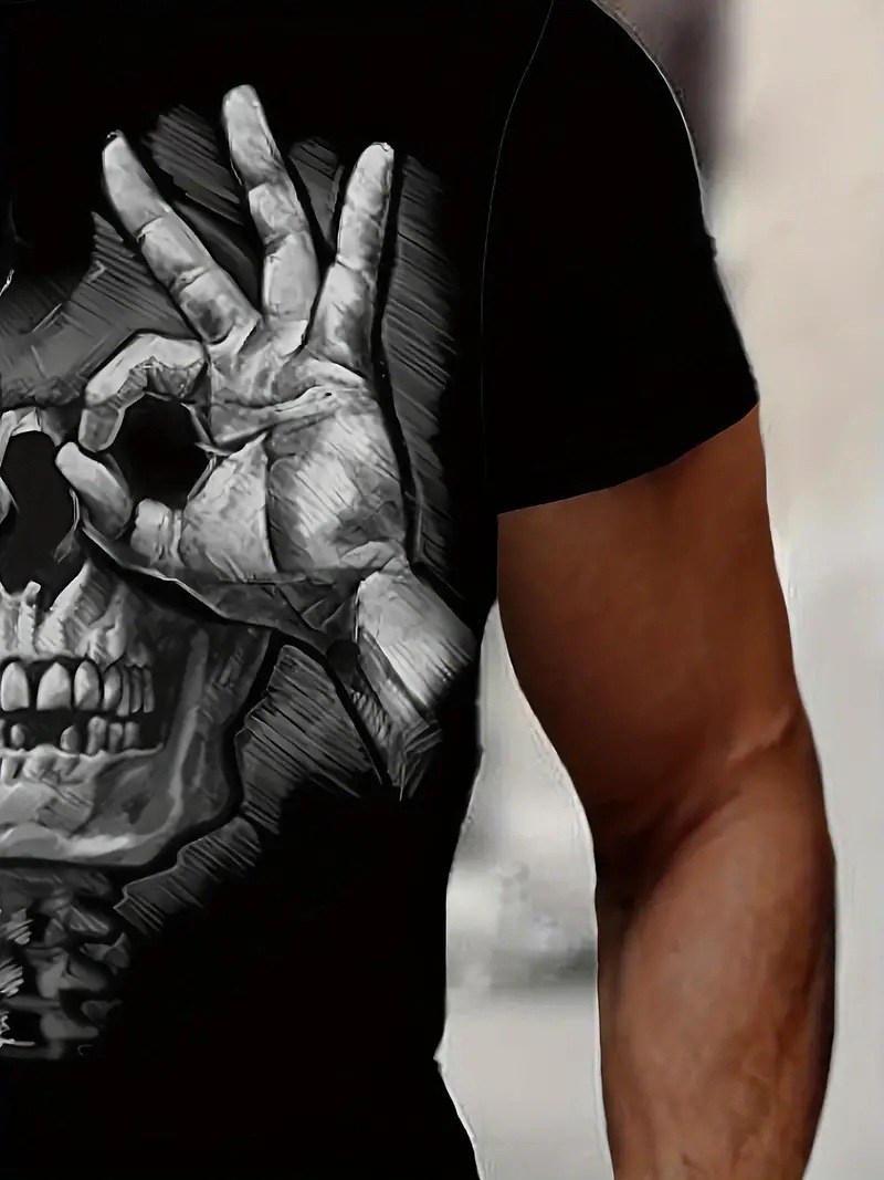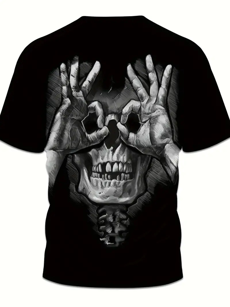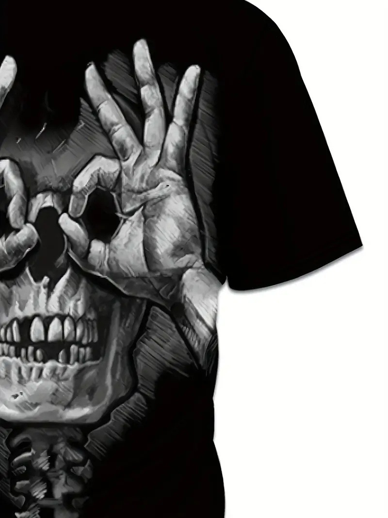Gestos divertidos y divertidos Skeleton estampado 3D para hombre, malla suelta, manga corta transpirable, camiseta de cuello redondo