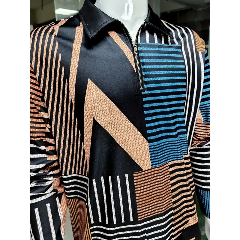 Camisa POLO con cremallera de manga larga y suelta con estampado 3D a rayas geométricas abstractas simples y versátiles para hombres