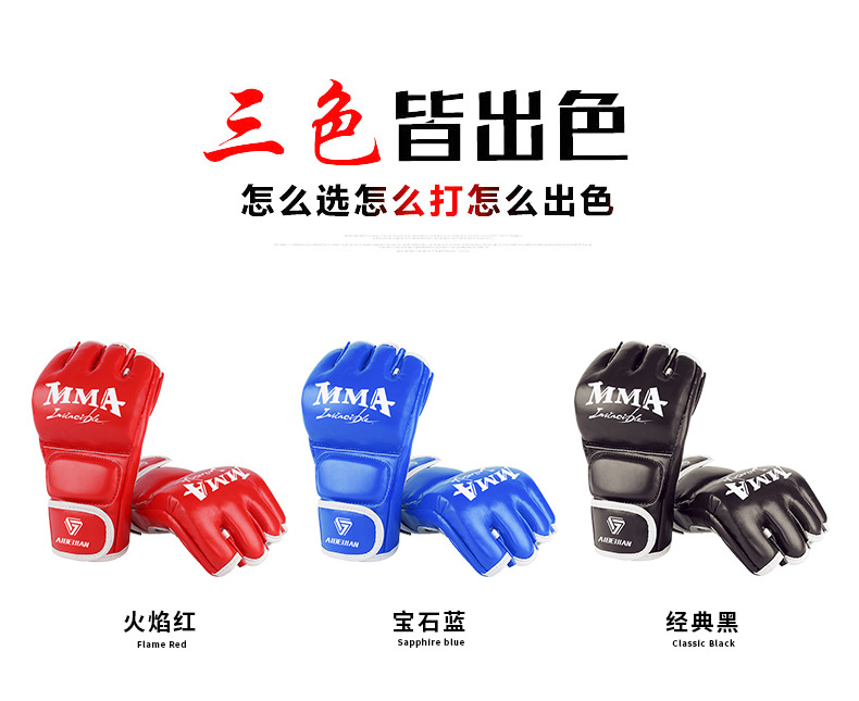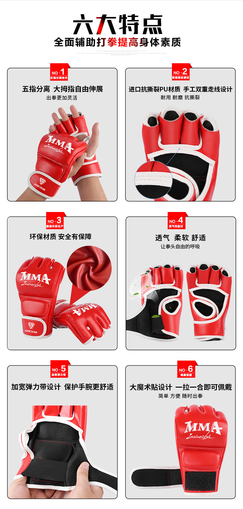 | Colores | MMA [medio dedo adulto] guante rojo,MMA [medio dedo adulto] guante azul,MMA [medio dedo para adultos] guante negro,MMA [medio dedo para niños] guante rojo,MMA [medio dedo para niños] guante azul,MMA [medio dedo para niños] guante negro,Sin LOGOTIPO [medio dedo para niños] guante negro,Niños garra de tigre azul |