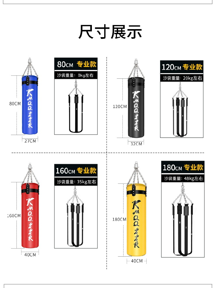 | Colores | Bolsa de arena Muay Thai de 80cm [tenga en cuenta el color],Bolsa de arena Muay Thai de 100cm [tenga en cuenta el color],Bolsa de arena Muay Thai de 120cm [tenga en cuenta el color],Saco de arena Muay Thai de 140cm [Tenga en cuenta el color],Saco de arena Muay Thai de 160cm [Tenga en cuenta el color],Bolsa de arena Muay Thai de 180cm [tenga en cuenta el color] |