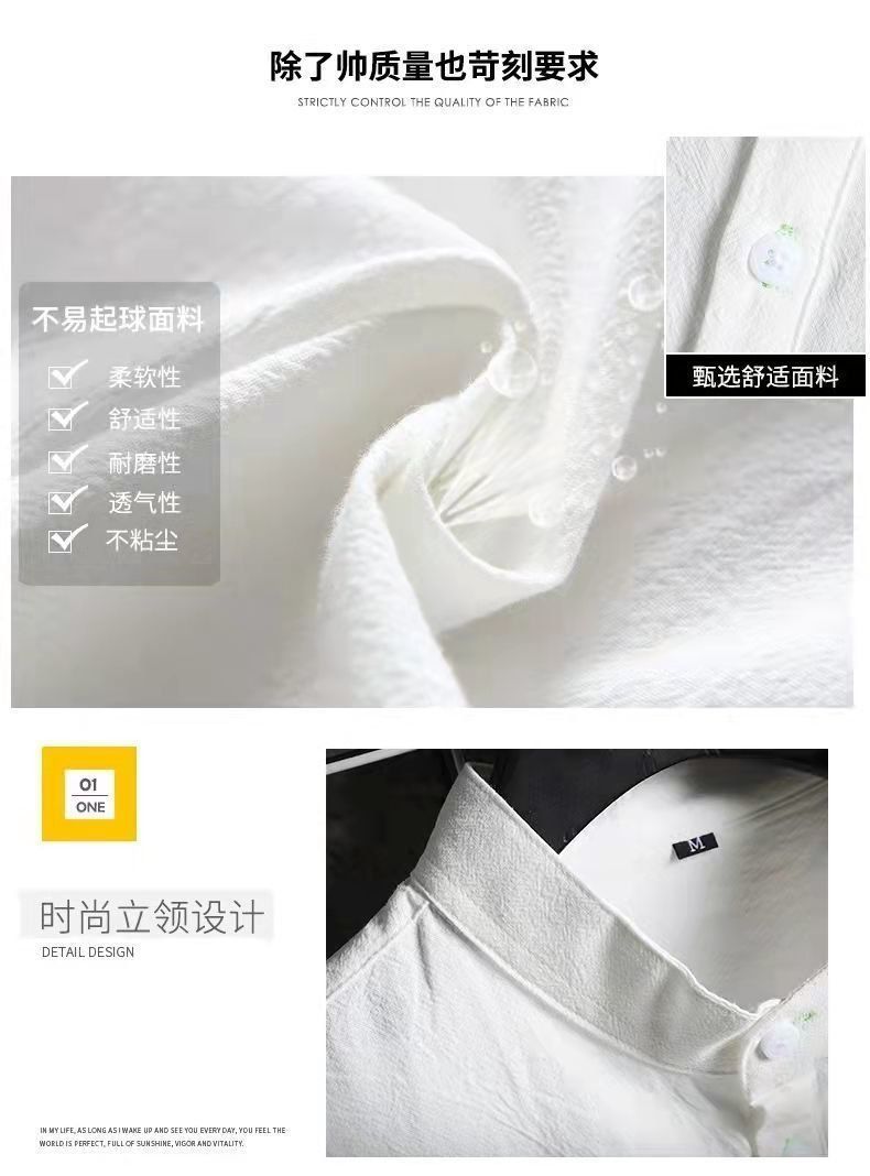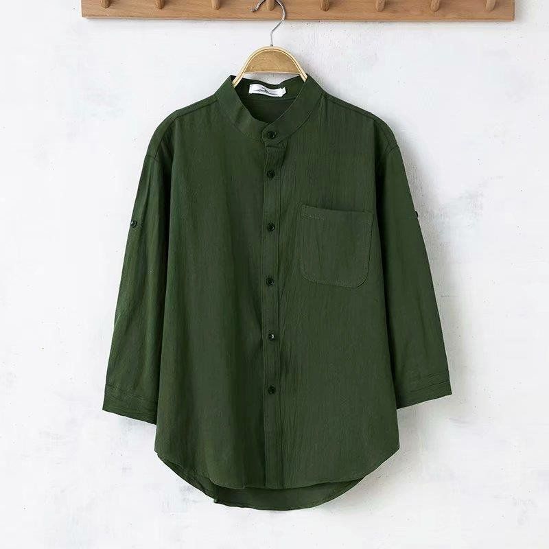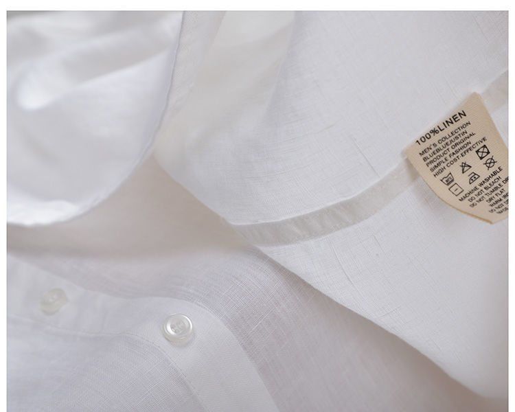 Camisa de seda de hielo para hombre con mangas tres cuartos, nuevo estilo de verano, suelta, delgada, transpirable, camisa de lino y algodón de color sólido, manga media blanca para hombre