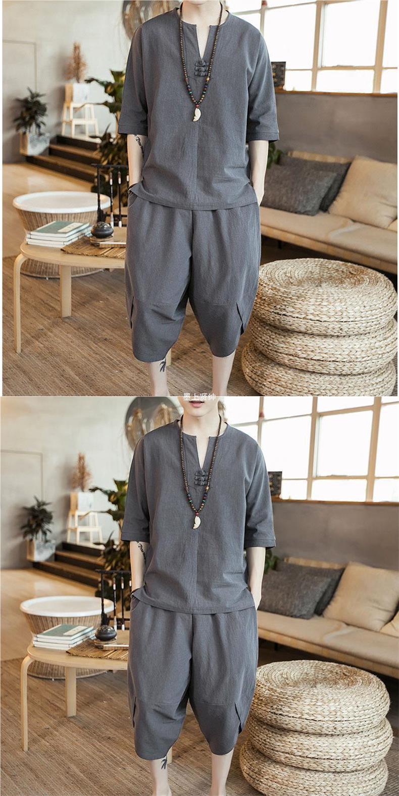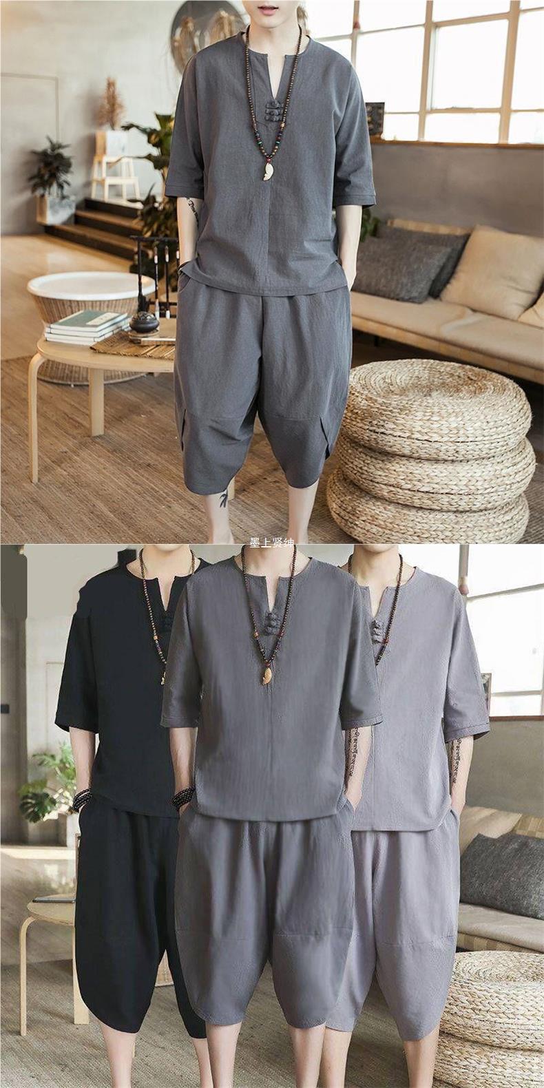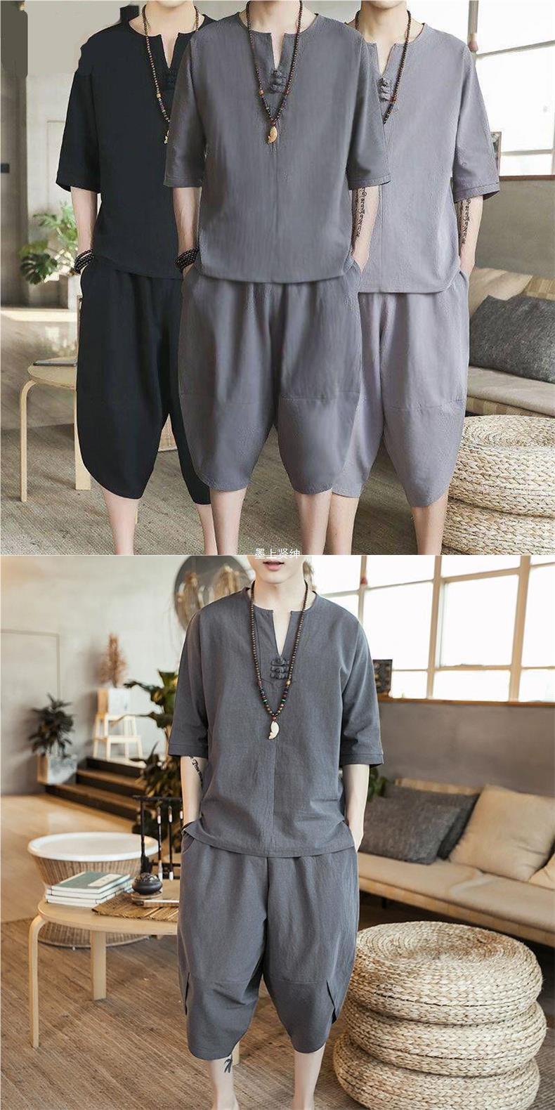 Nuevo traje de lino de verano para hombre Camiseta de estilo chino de manga corta de dos piezas de gran tamaño pantalones recortados sueltos para hombre