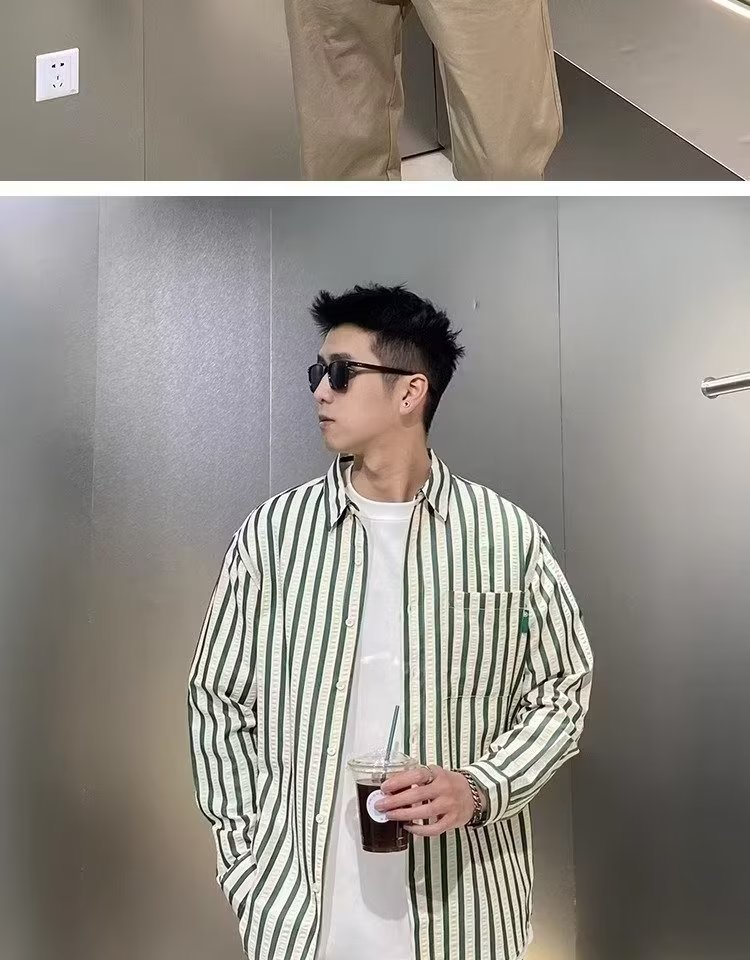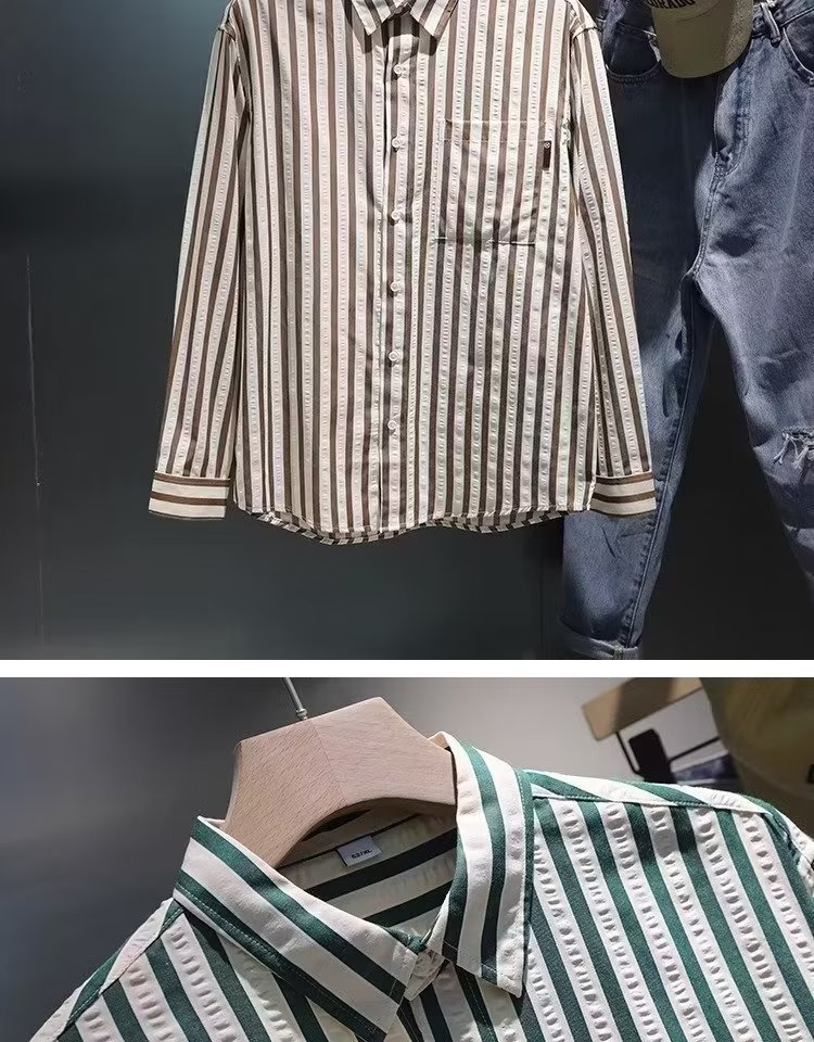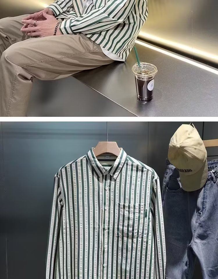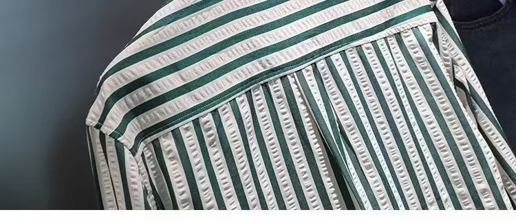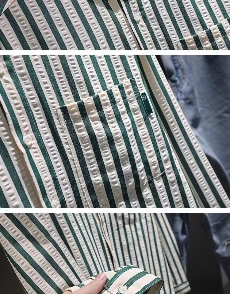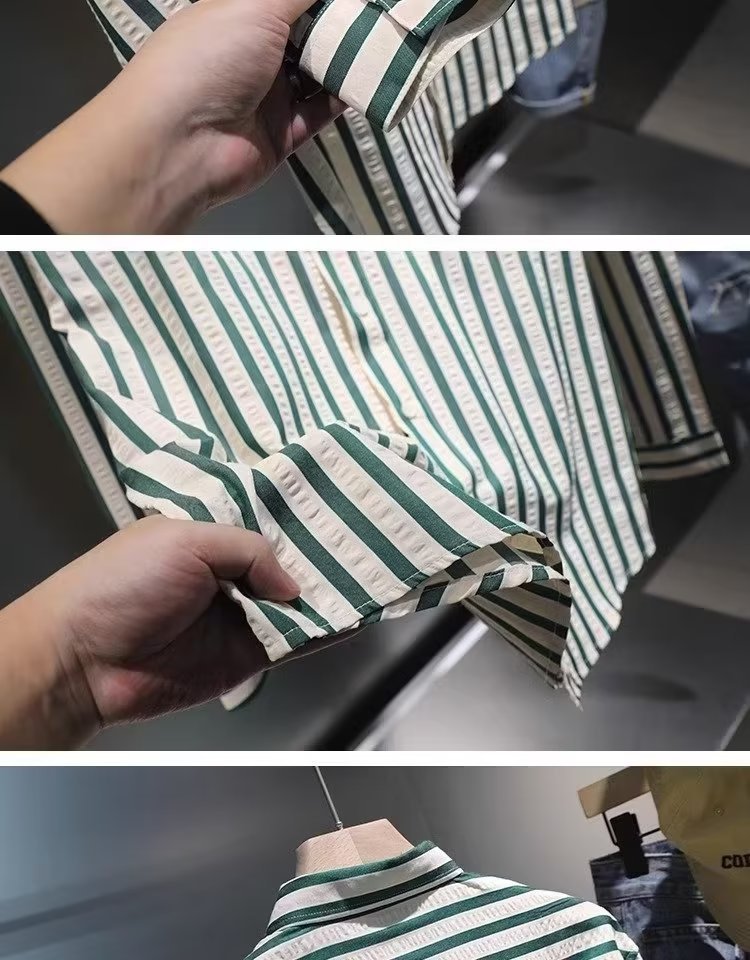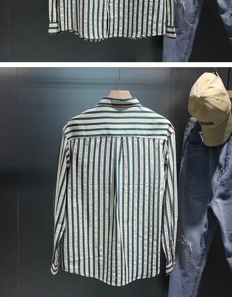 Camisa de manga larga con costuras a rayas verdes de estilo cocido ligero para hombre