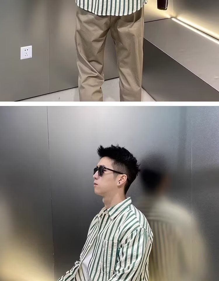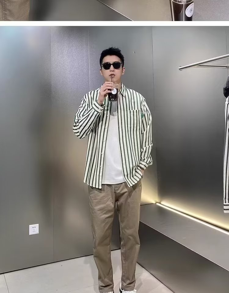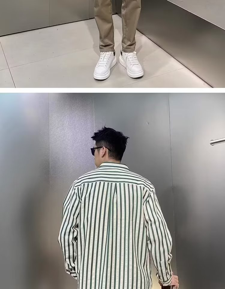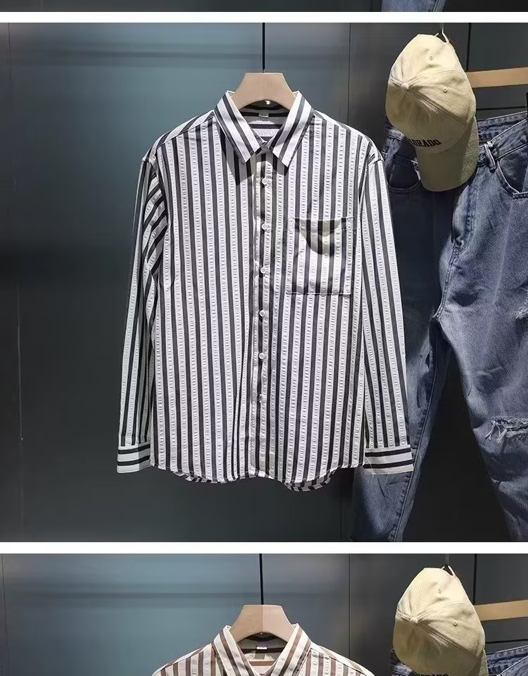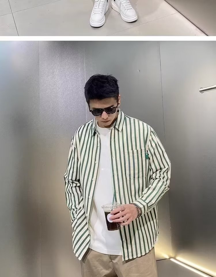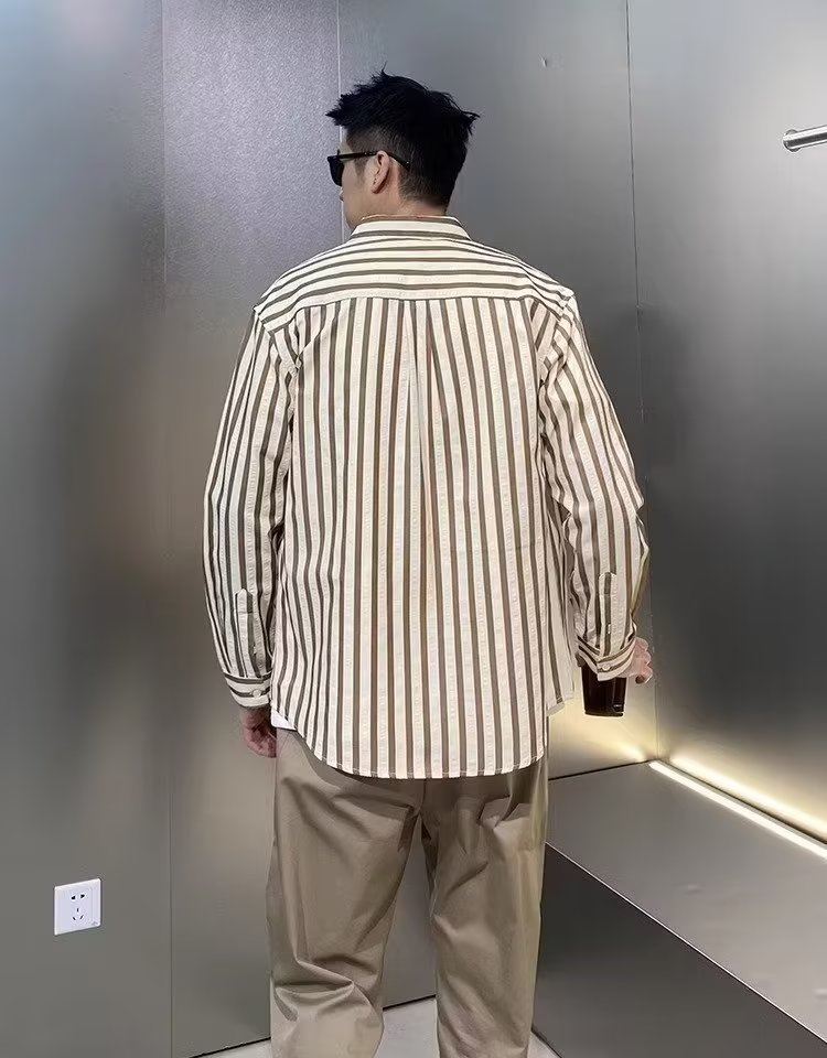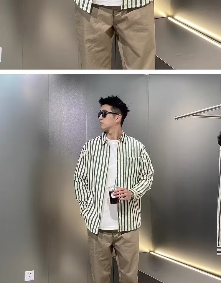 Camisa de manga larga con costuras a rayas verdes de estilo cocido ligero para hombre