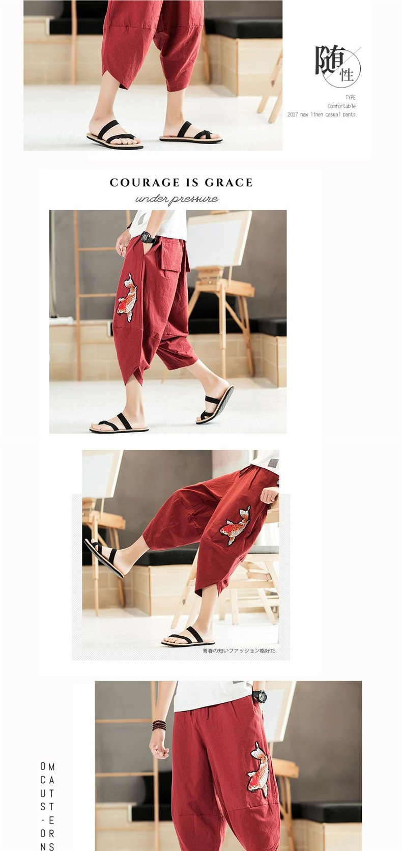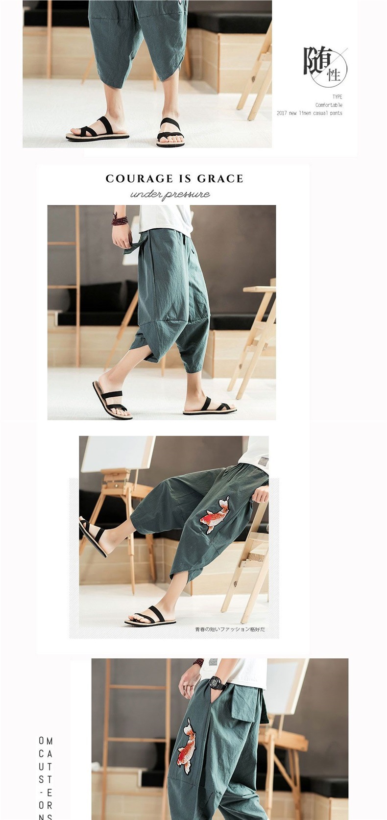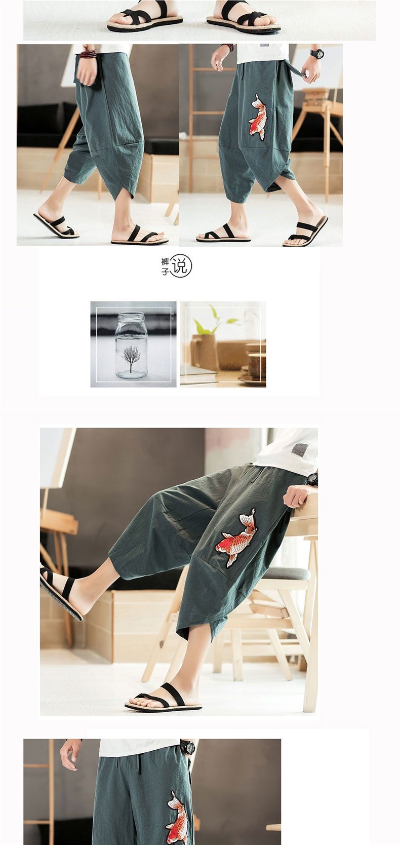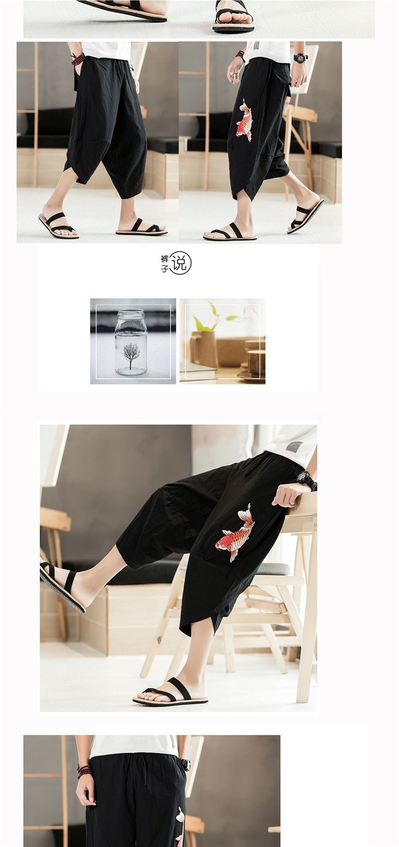 Pantalones cortos, pantalones cortos de lino, pantalones de playa con bordado de carpa suelta de estilo chino para hombres, pantalones de harén de pierna ancha de tendencia, pantalones de linterna