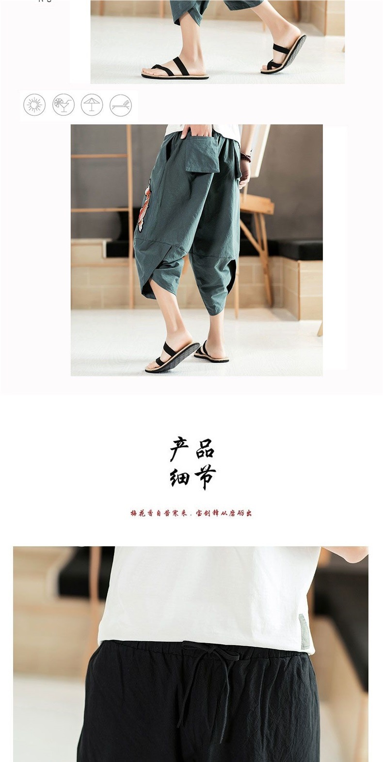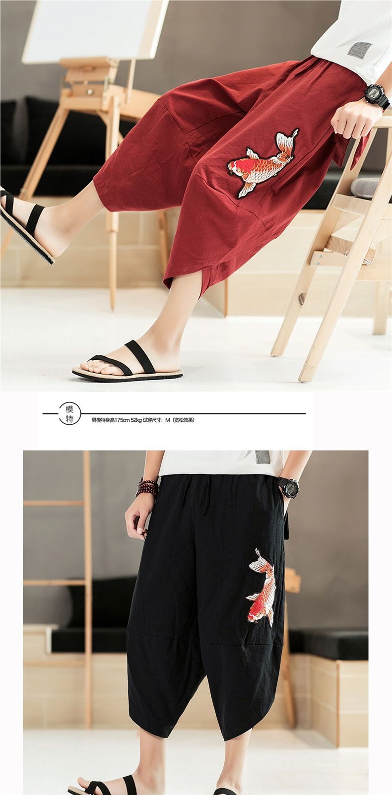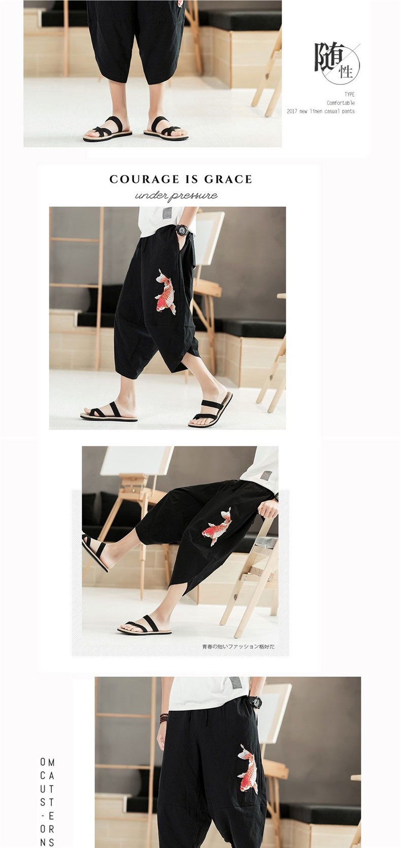 Pantalones cortos, pantalones cortos de lino, pantalones de playa con bordado de carpa suelta de estilo chino para hombres, pantalones de harén de pierna ancha de tendencia, pantalones de linterna