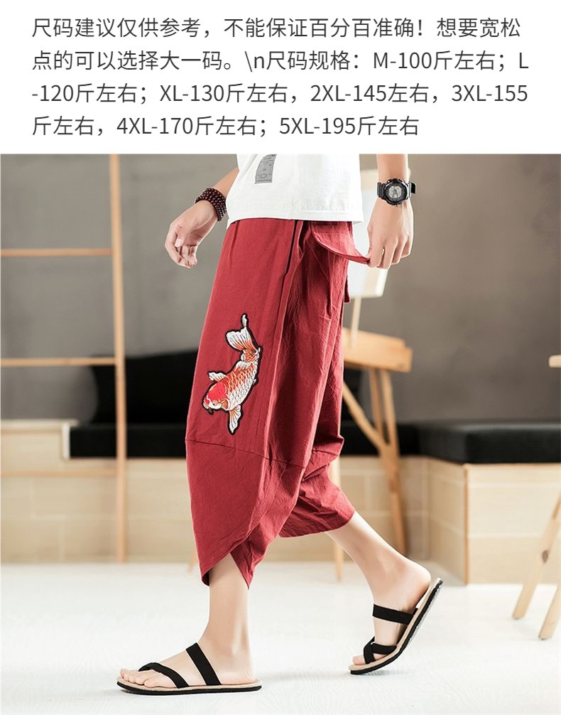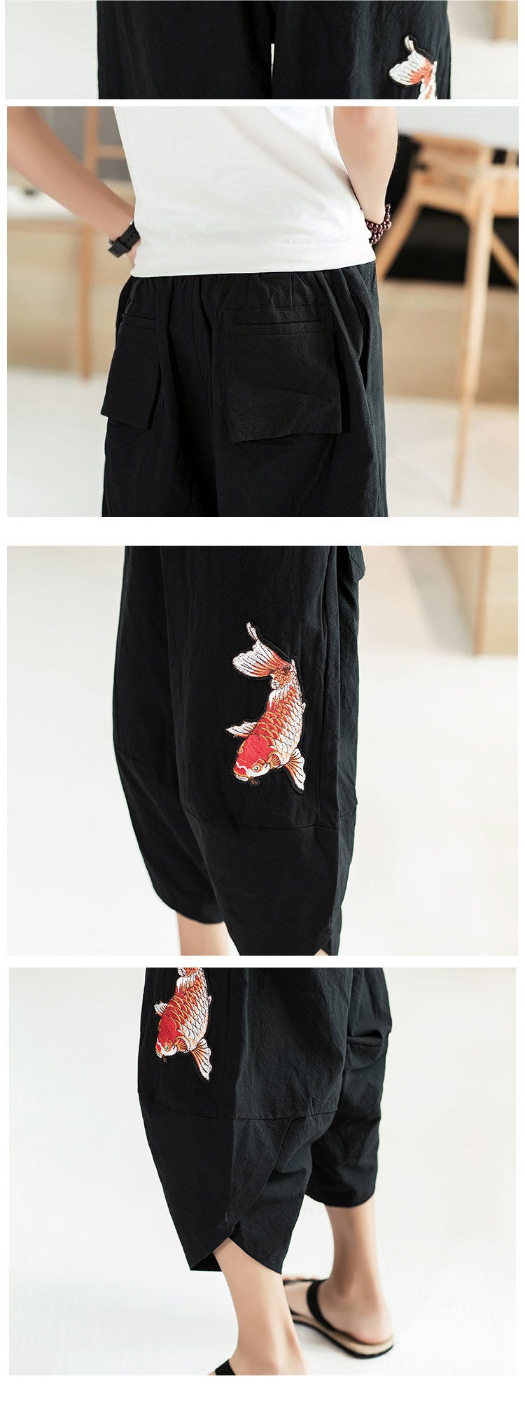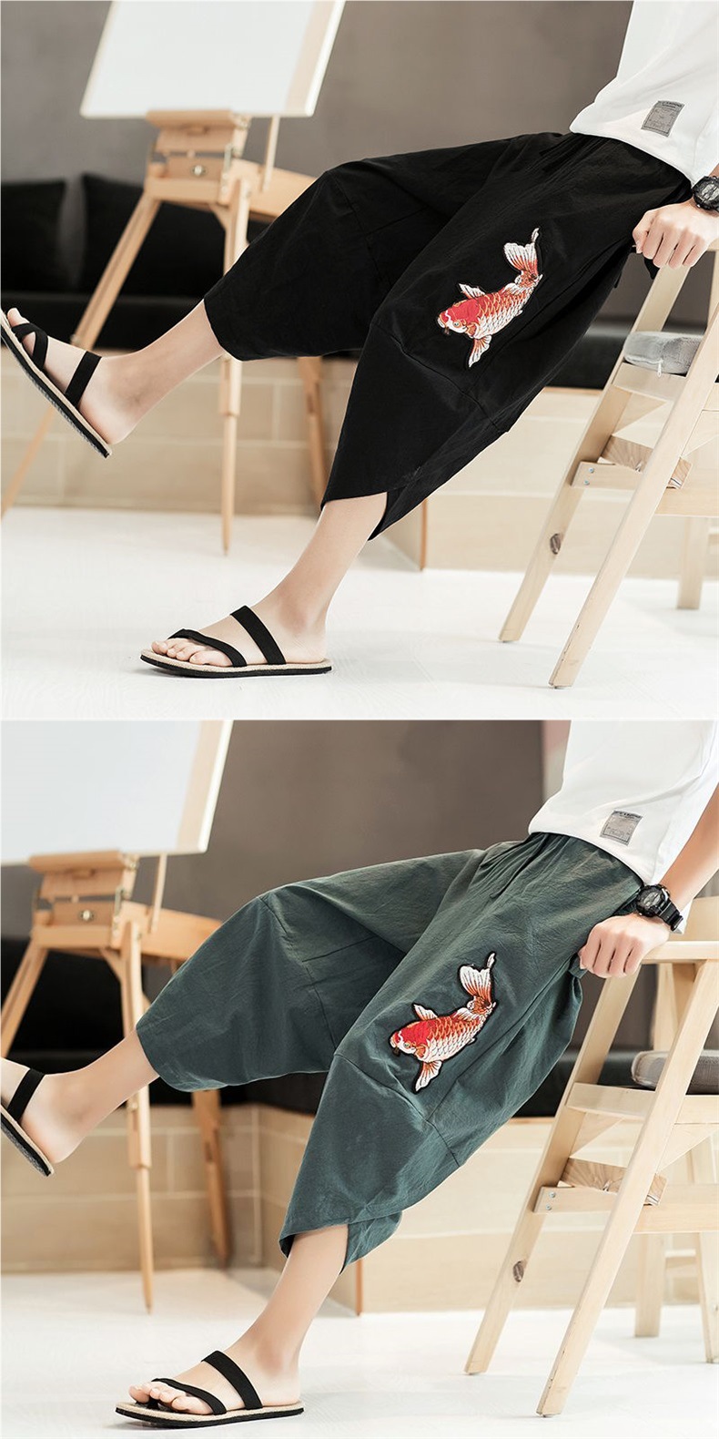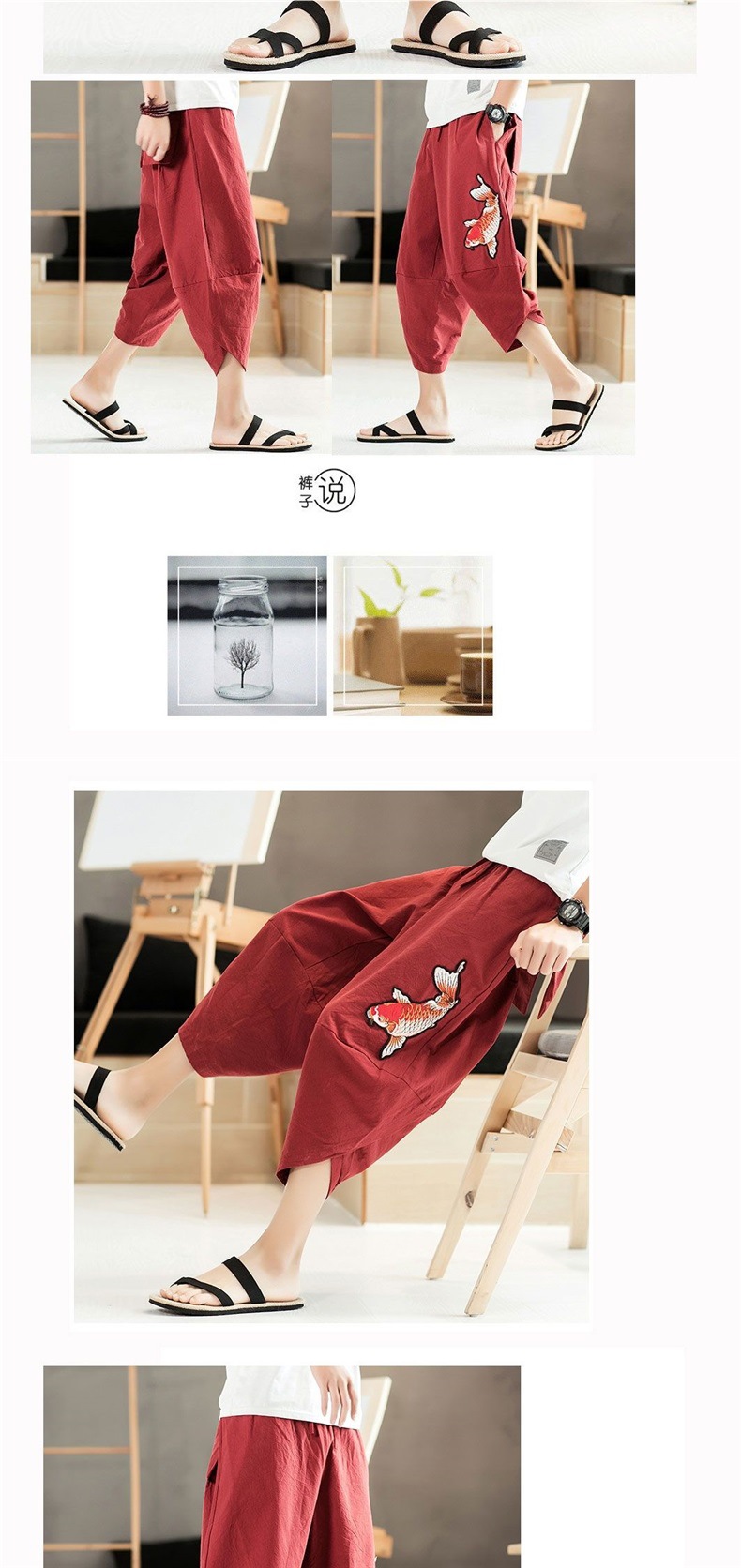 Pantalones cortos, pantalones cortos de lino, pantalones de playa con bordado de carpa suelta de estilo chino para hombres, pantalones de harén de pierna ancha de tendencia, pantalones de linterna