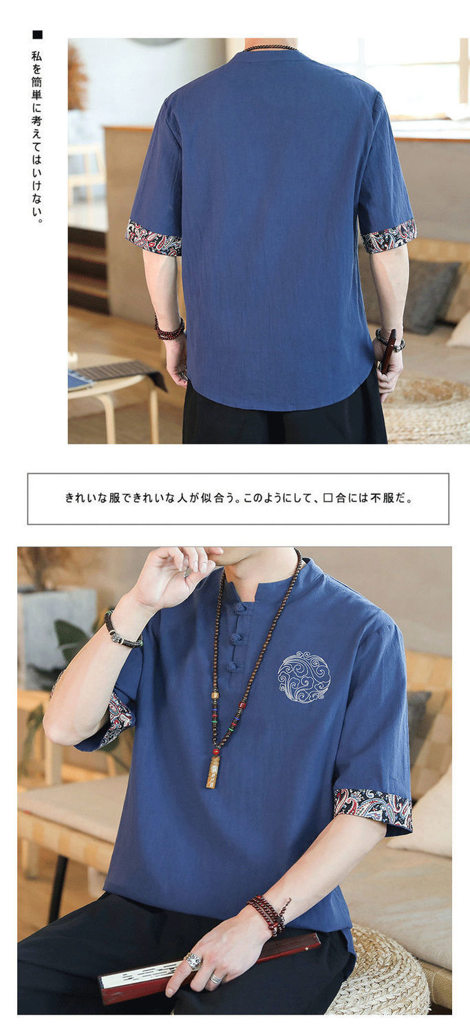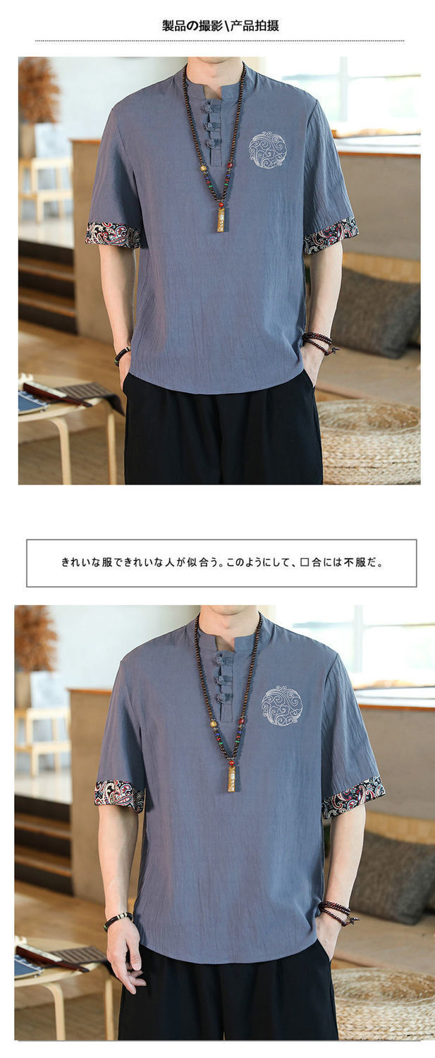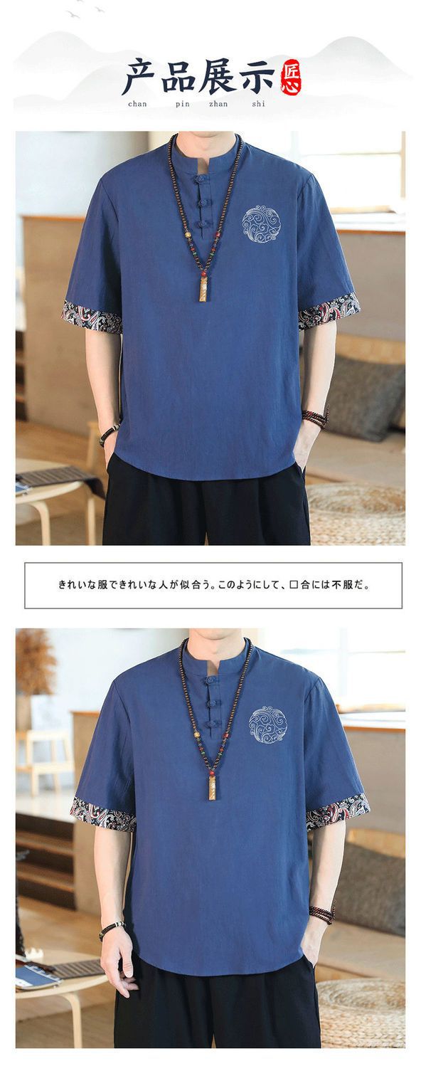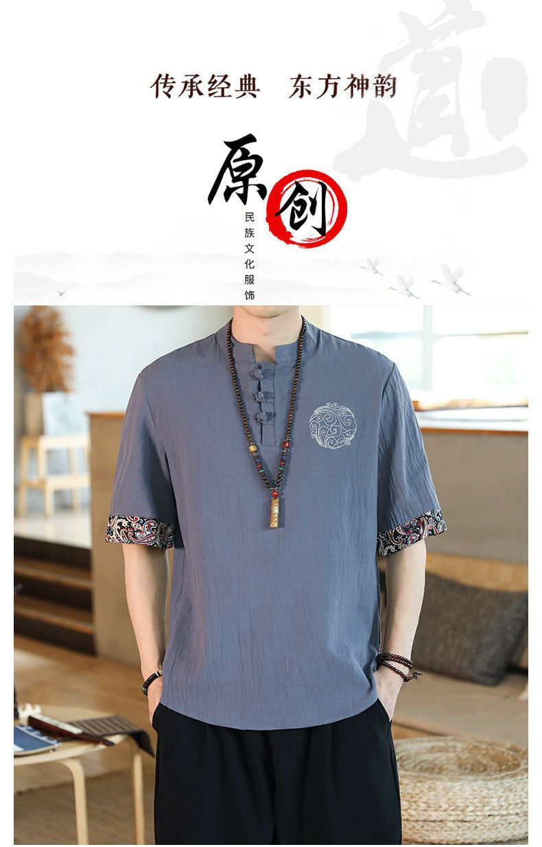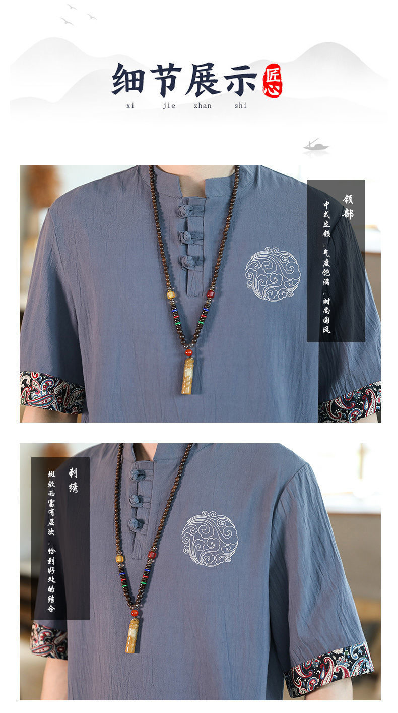 Camiseta de lino de manga corta para hombre Traje Tang de estilo chino Traje de hombre gordo retro de gran tamaño Abrigo de algodón y lino de media manga suelto y delgado