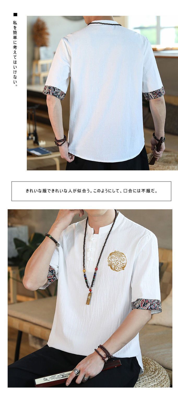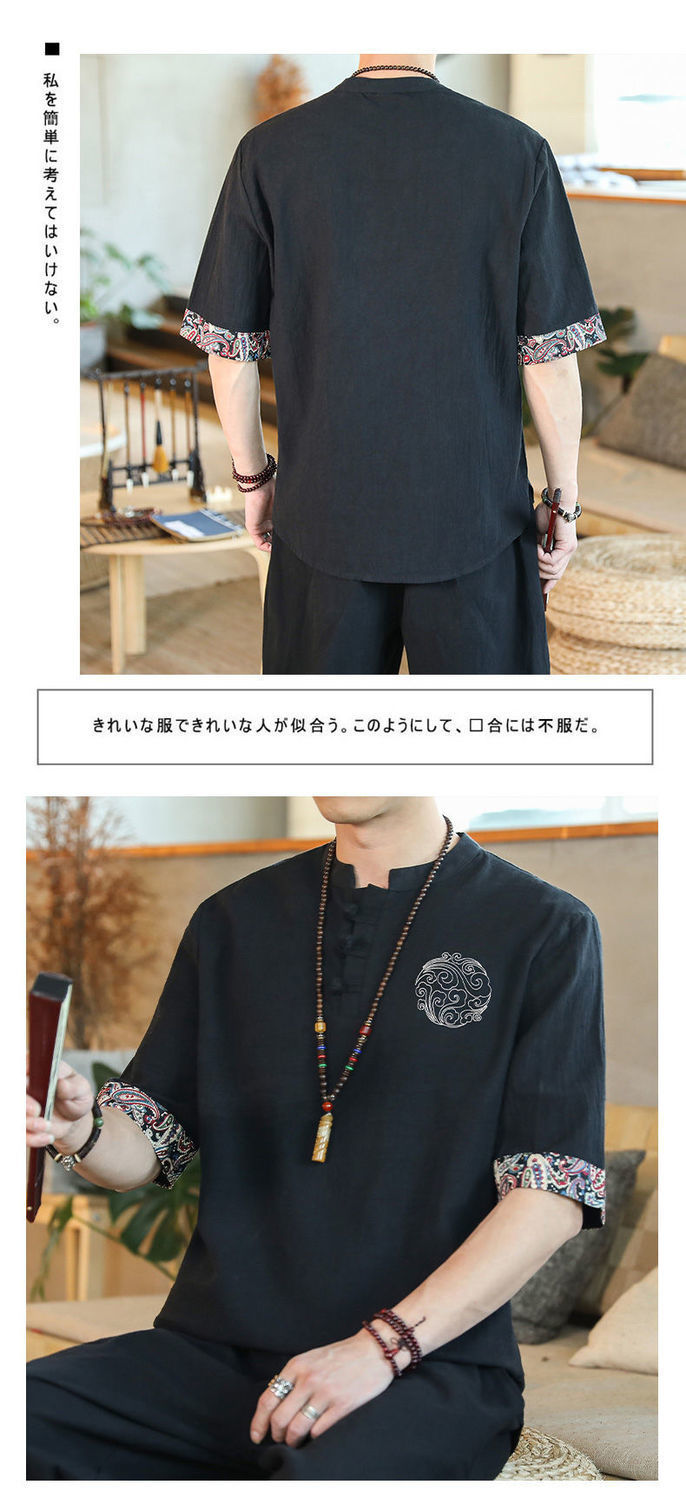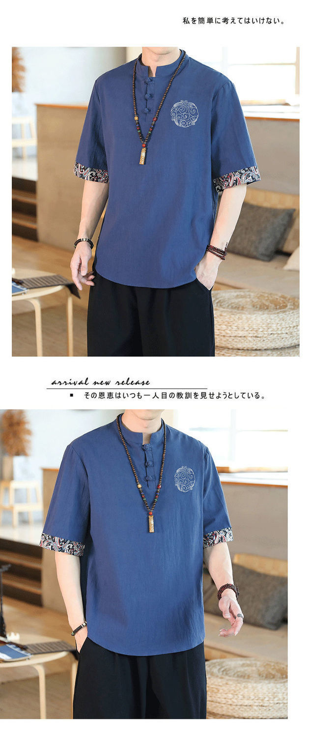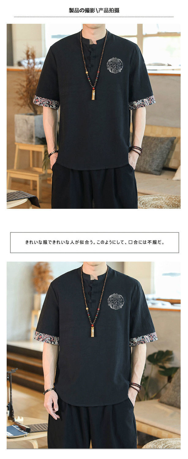Camiseta de lino de manga corta para hombre Traje Tang de estilo chino Traje de hombre gordo retro de gran tamaño Abrigo de algodón y lino de media manga suelto y delgado
