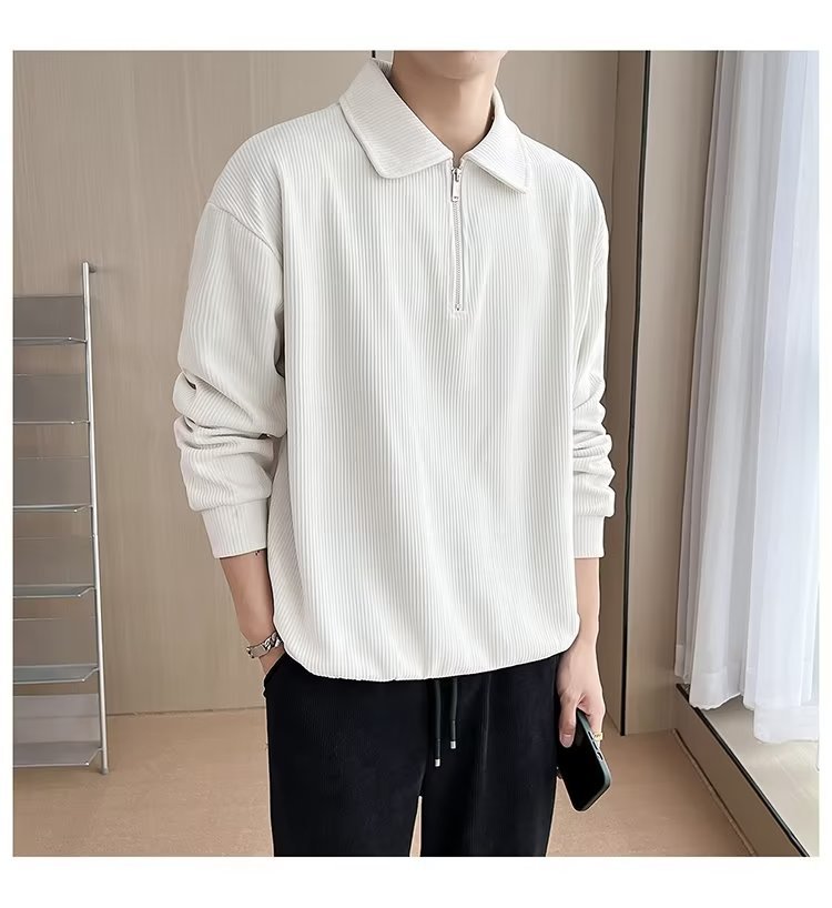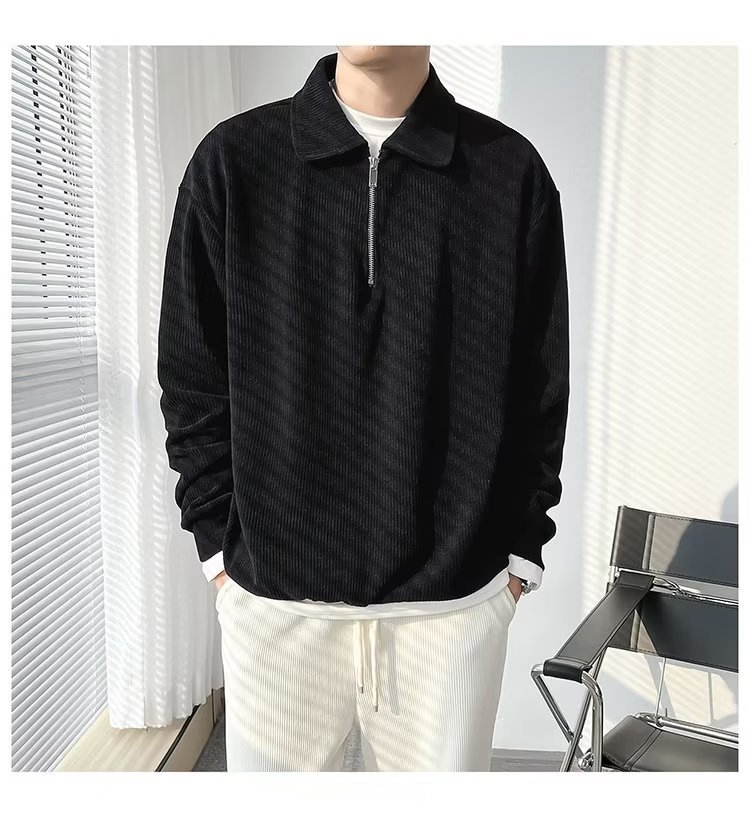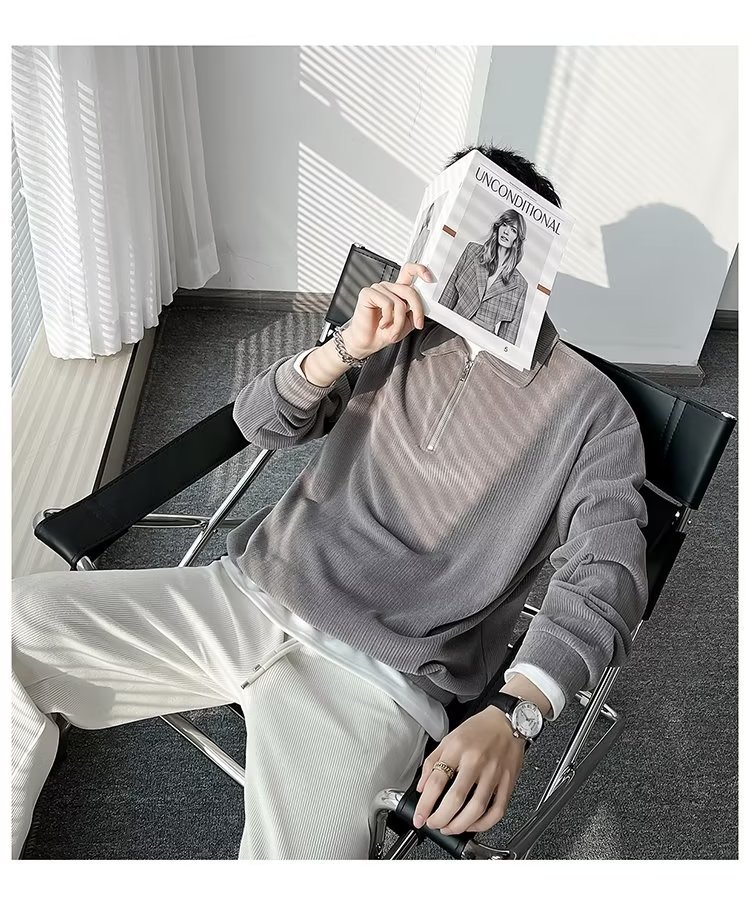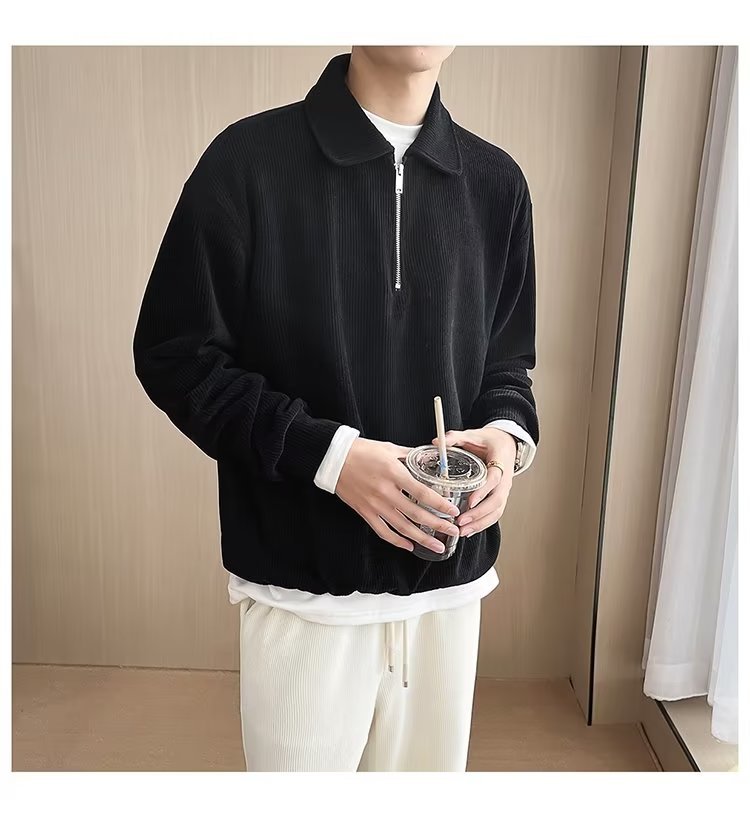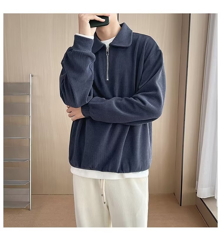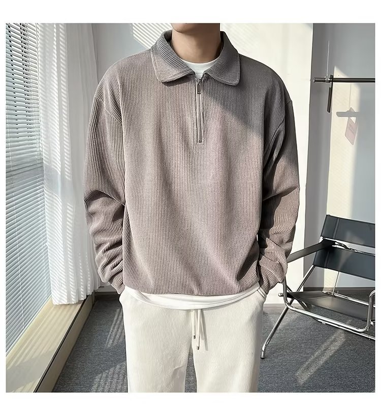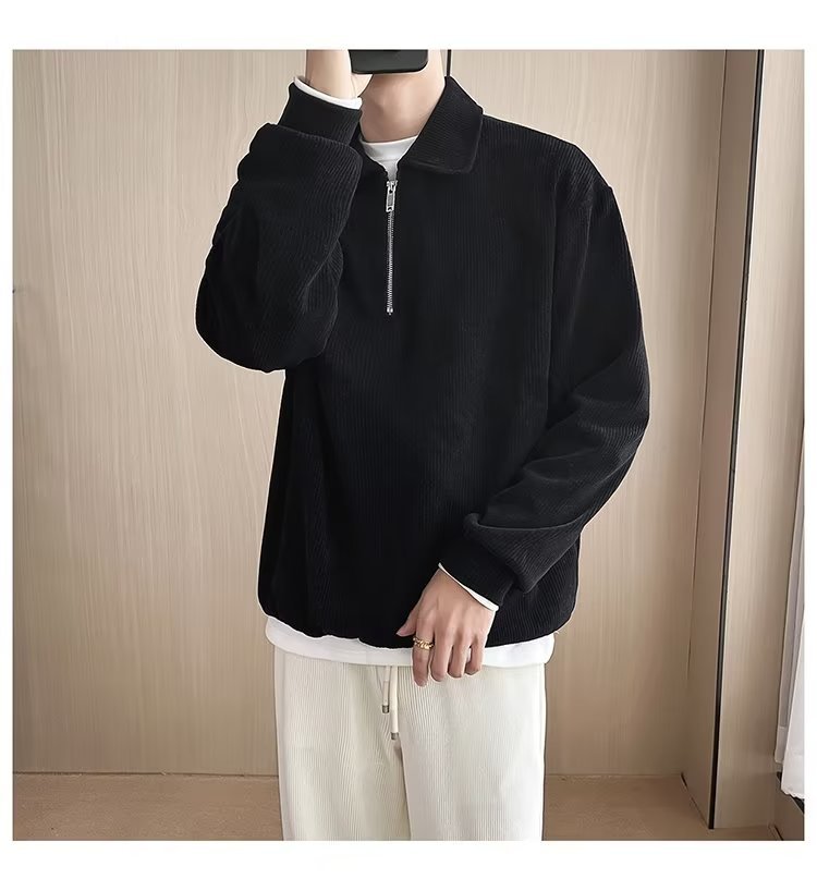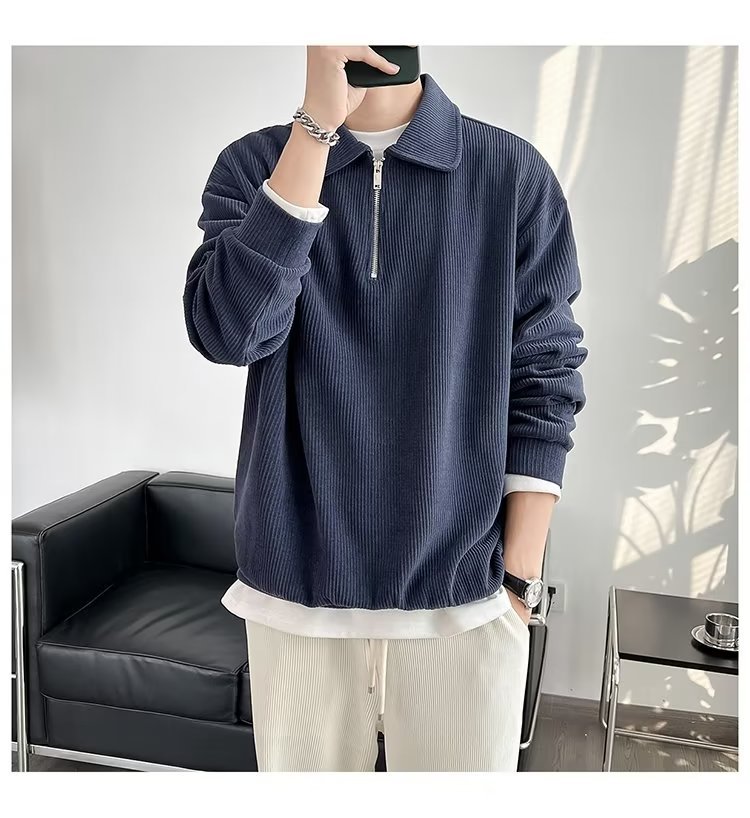 Otoño nuevo estilo semi-cremallera polo para hombre retro suelto diseño casual sentido de nicho top suéter de color sólido