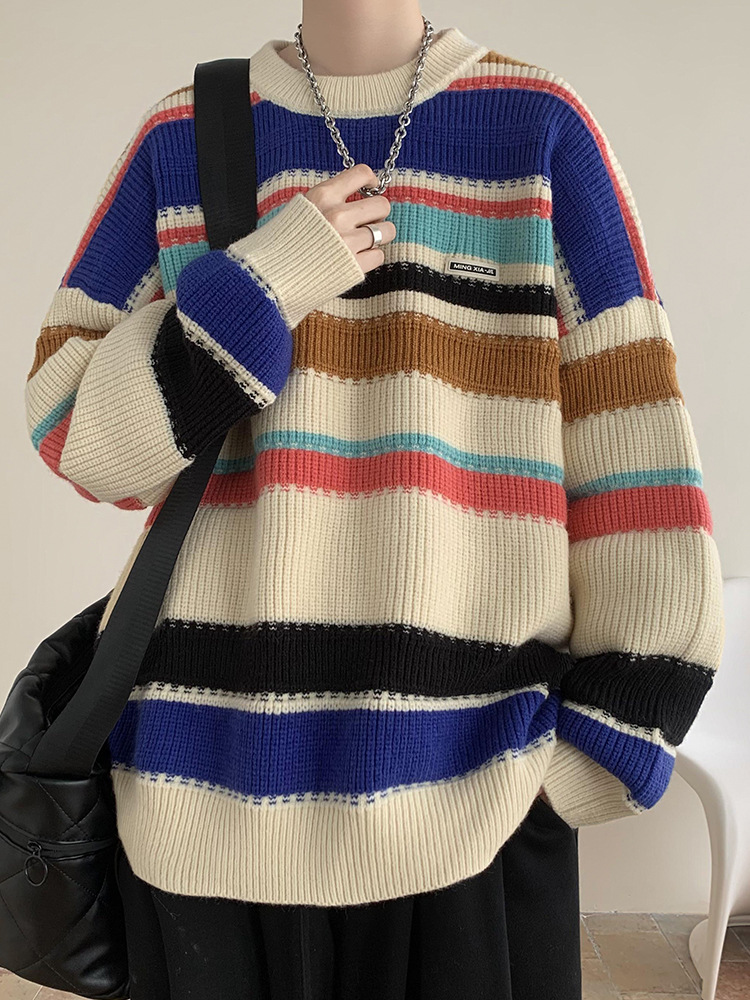 Suéter de punto hueco a rayas de color retro americano otoño e invierno nuevo estilo estilo de Hong Kong solapa suelta tendencia de suéter casual