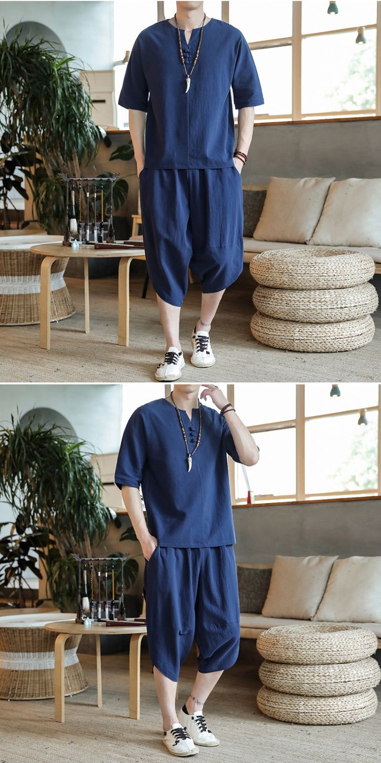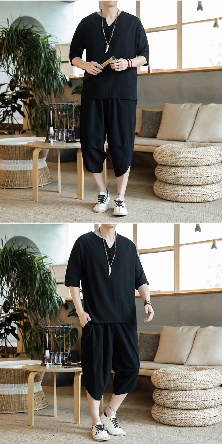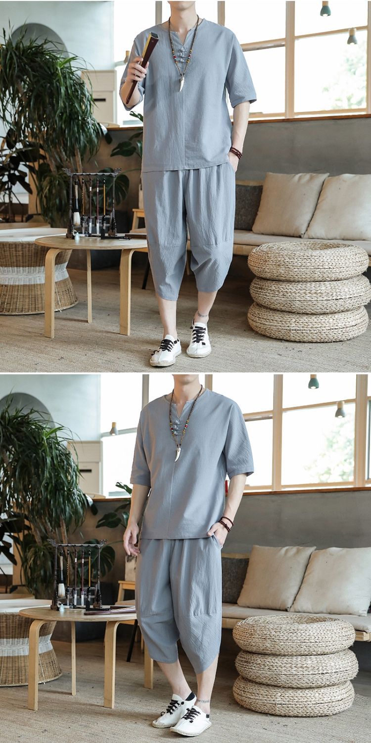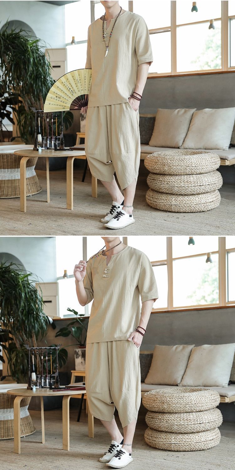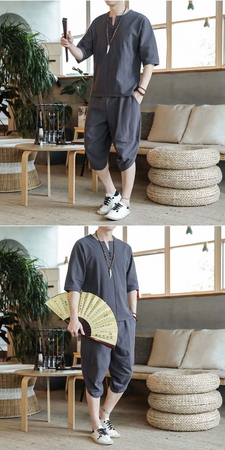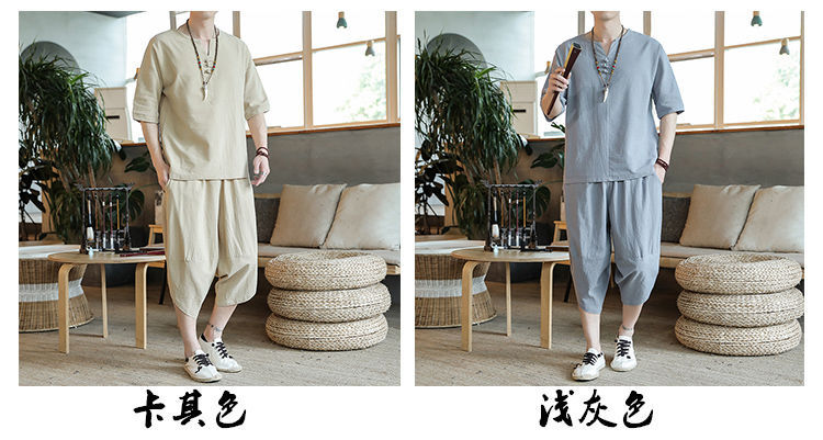 Traje de lino de estilo chino de verano Traje Tang de algodón y lino fino de gran tamaño para hombres Traje Hanfu Traje Zen de manga corta para jóvenes Traje de dos piezas