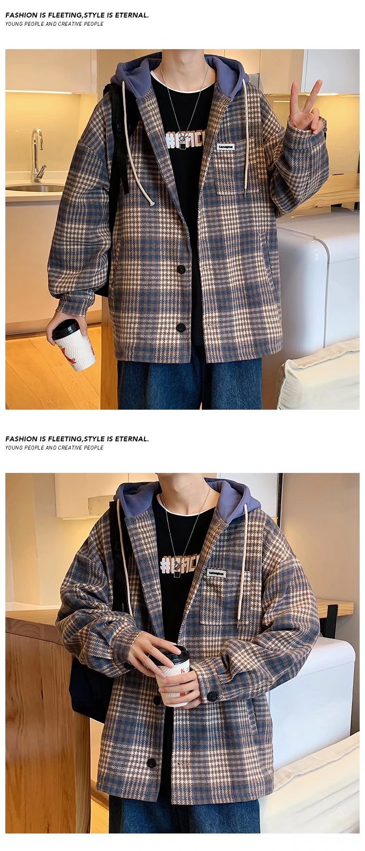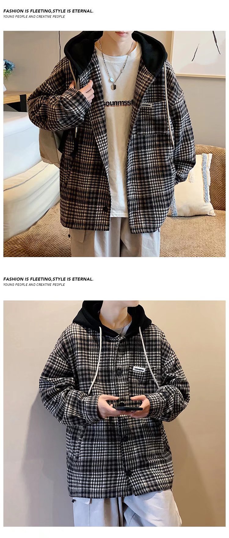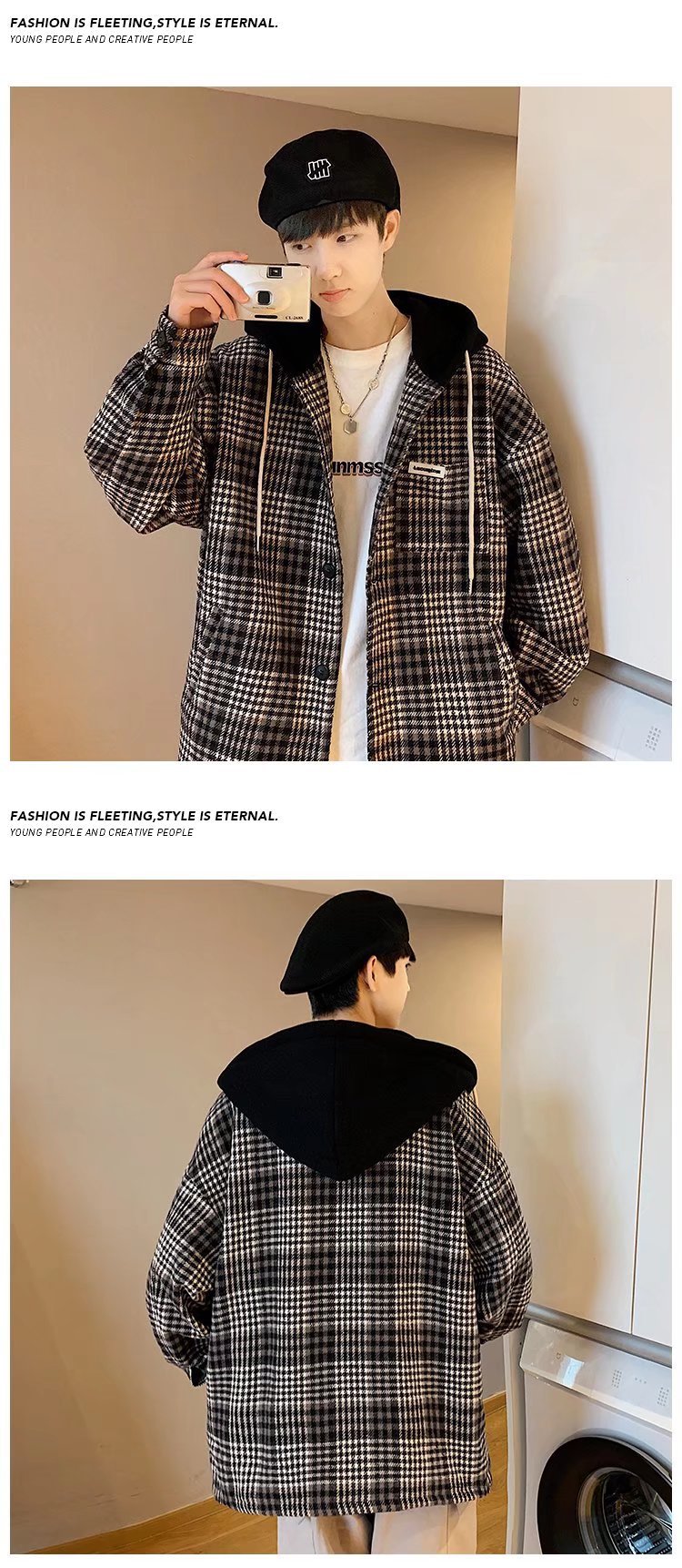 Otoño e invierno nuevo estilo estilo de Hong Kong chaqueta con capucha a cuadros informal suelta, chaqueta de todo fósforo para hombres, vestido de lana de moda