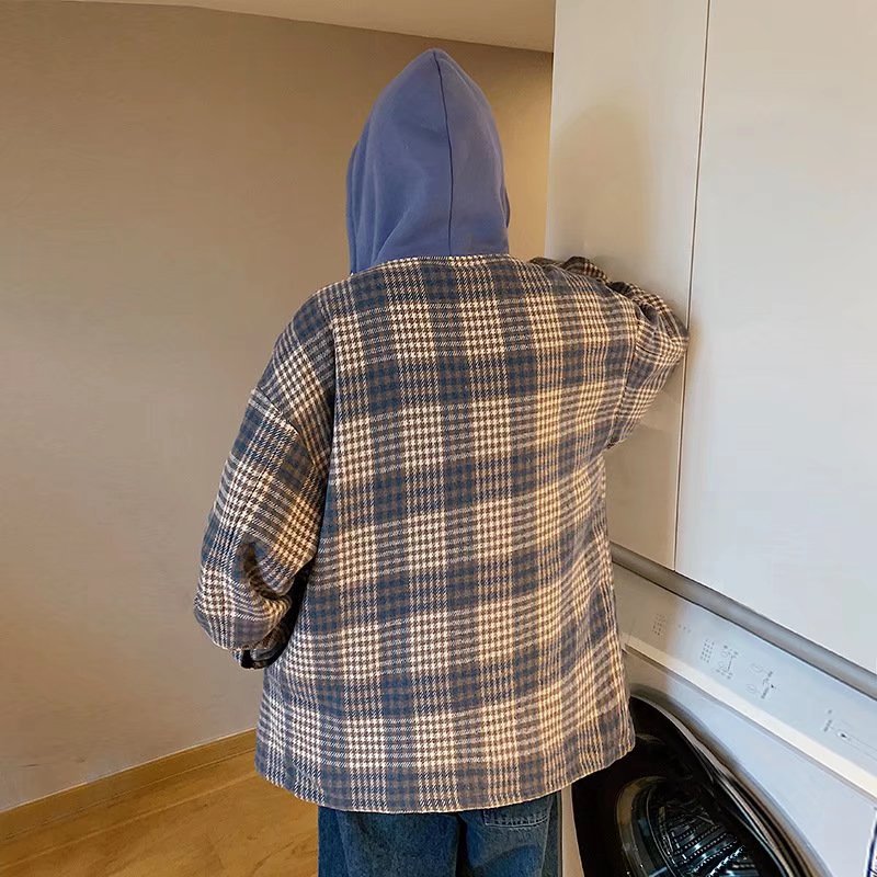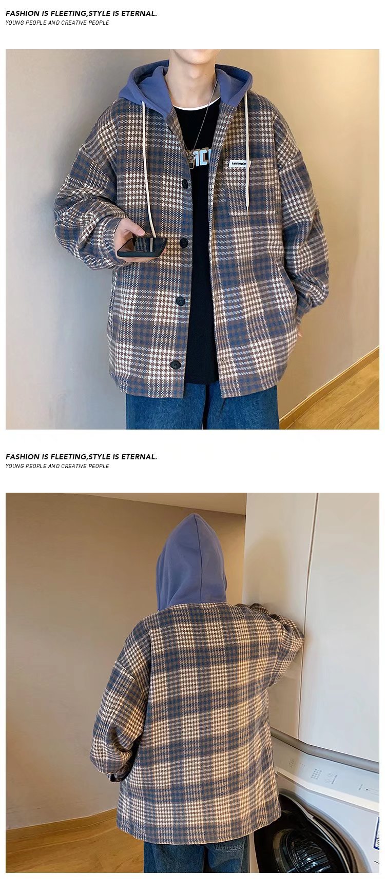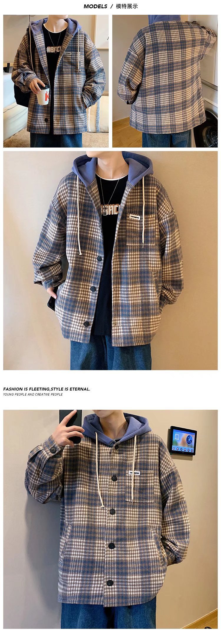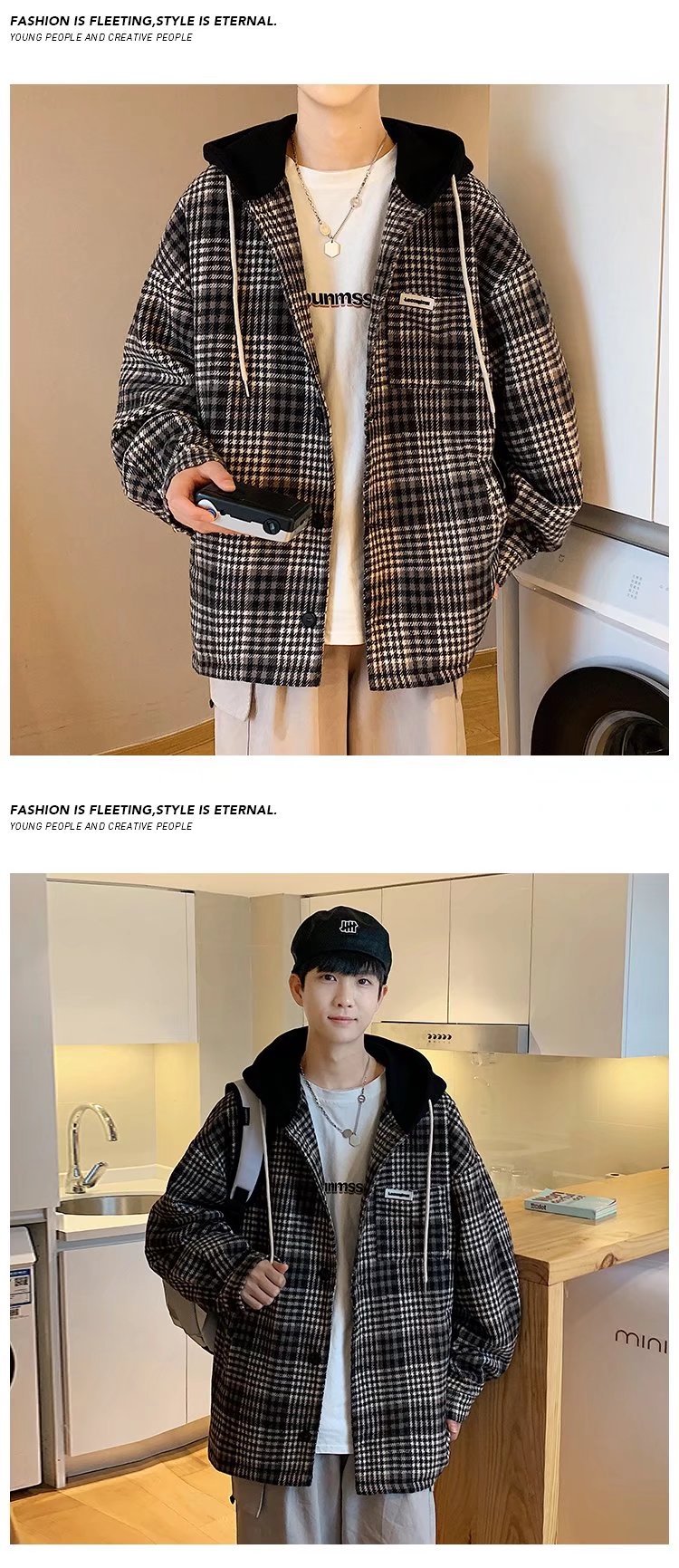 Otoño e invierno nuevo estilo estilo de Hong Kong chaqueta con capucha a cuadros informal suelta, chaqueta de todo fósforo para hombres, vestido de lana de moda