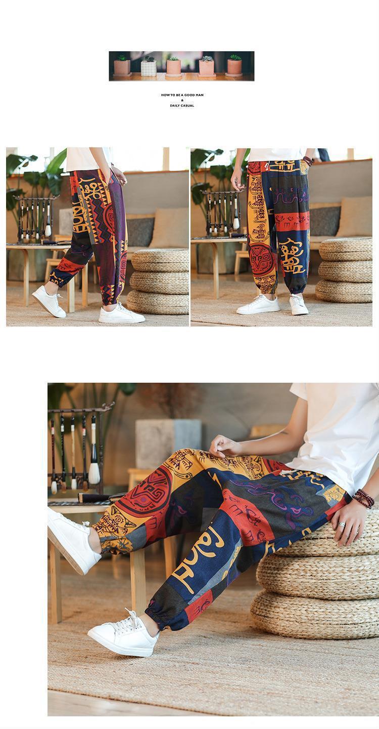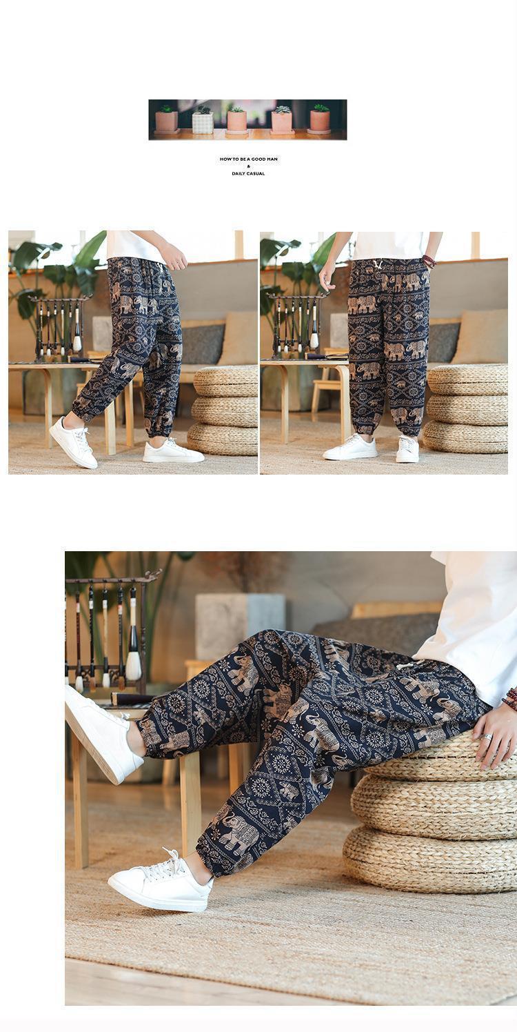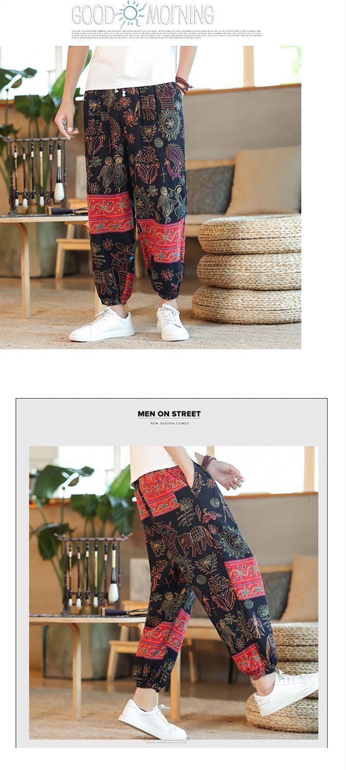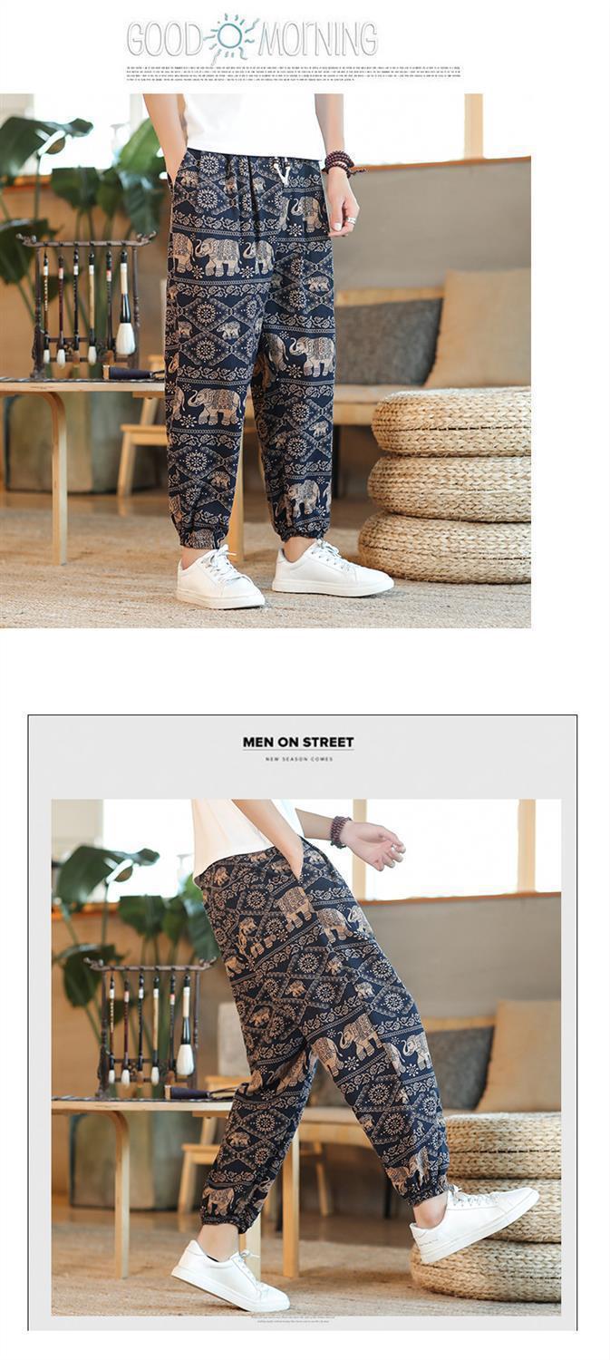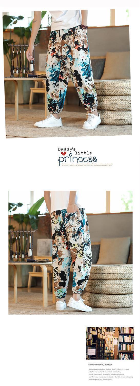 Pantalones tailandeses de flores de anacardo para hombres, pantalones de nueve puntos anchos de lino de estilo chino fino de verano, pantalones de chándal de pies sueltos, marea