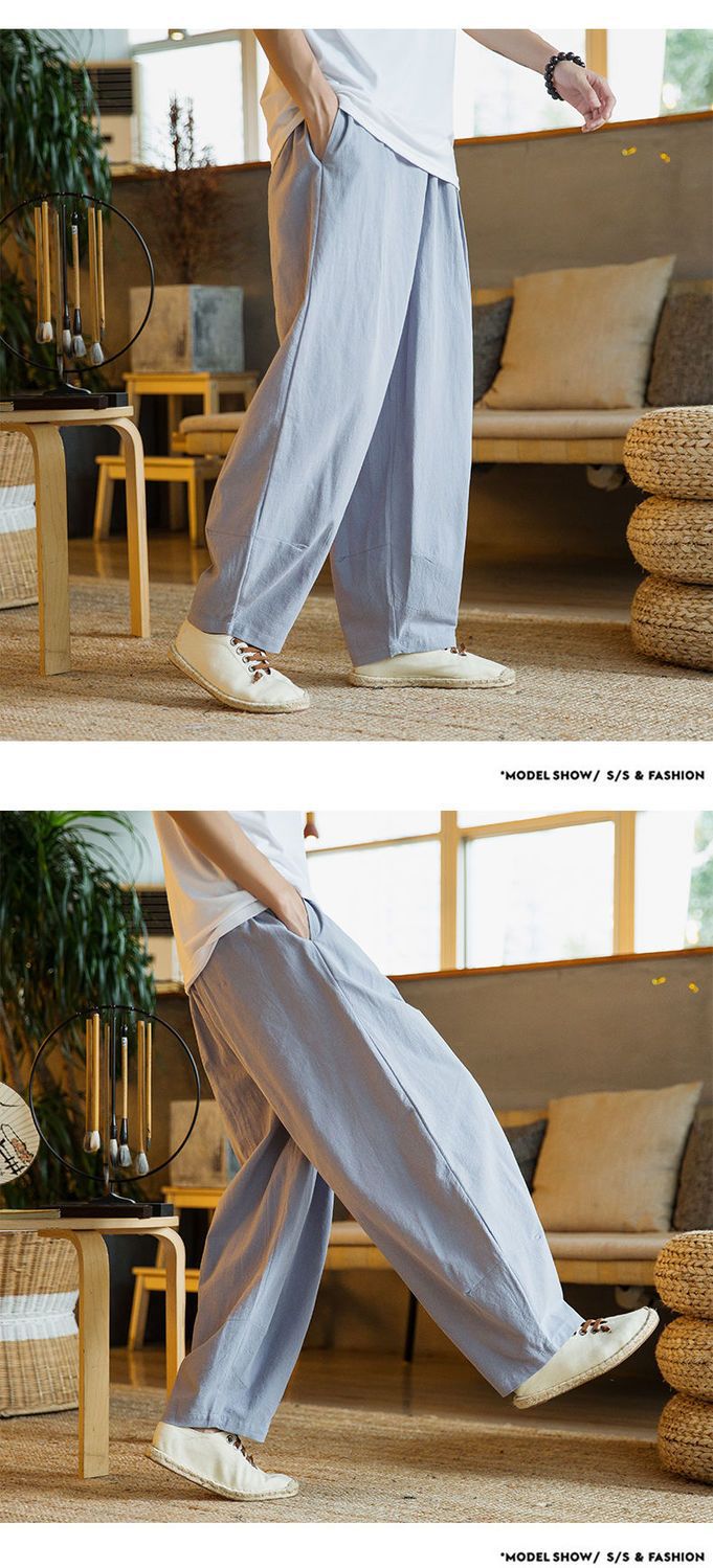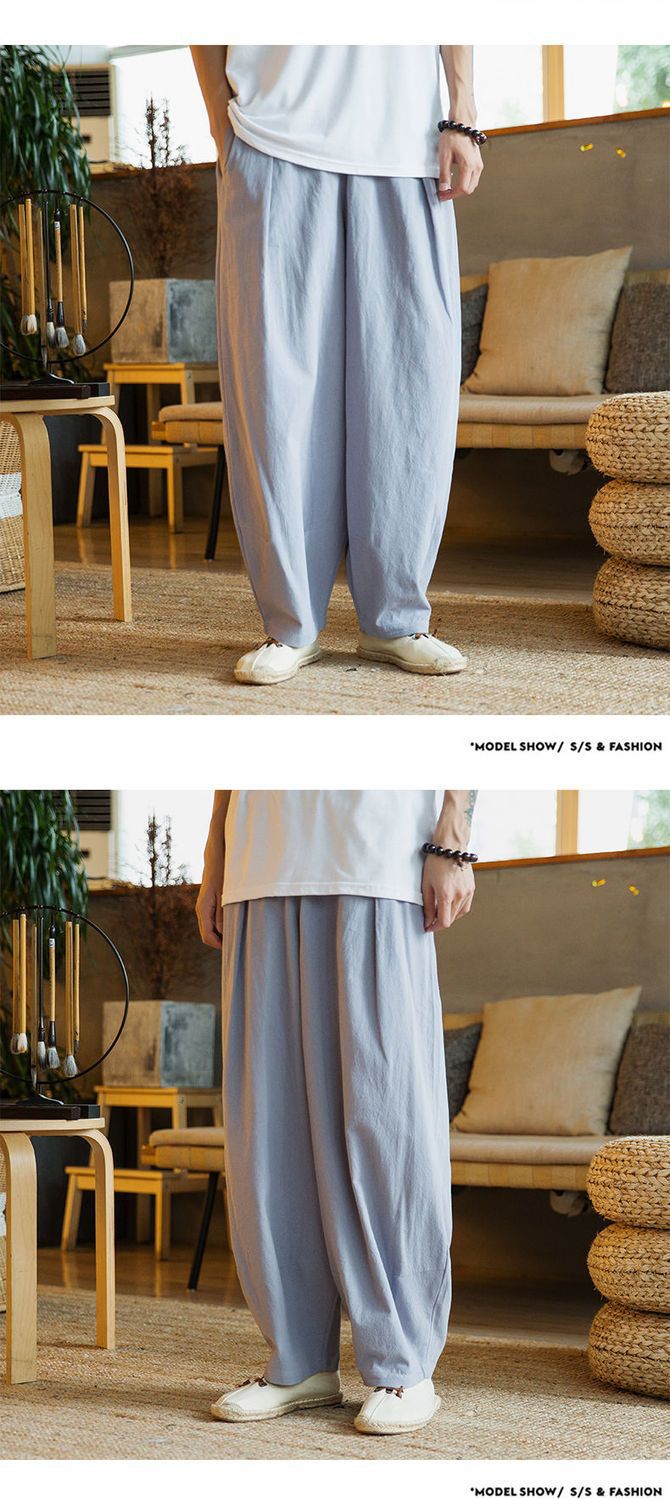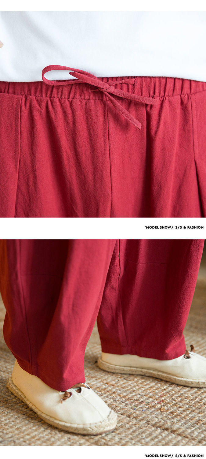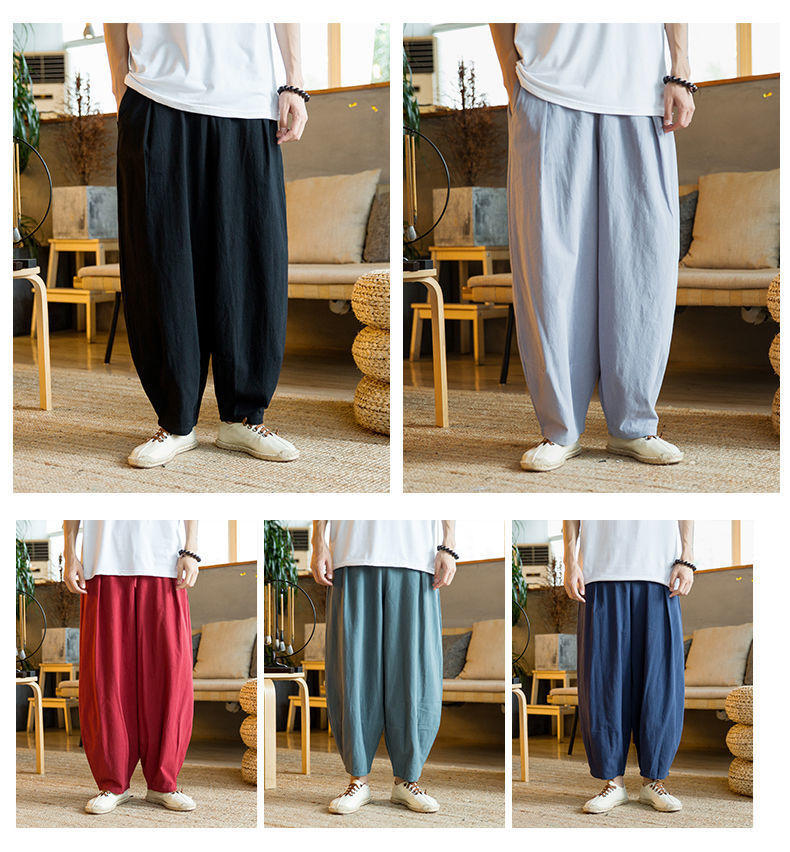 Primavera y verano marea nacional pantalones sueltos hasta el pantalón con pies pequeños, pantalones harem de talla grande más gordos pantalones casuales de algodón y lino de pierna ancha para hombres