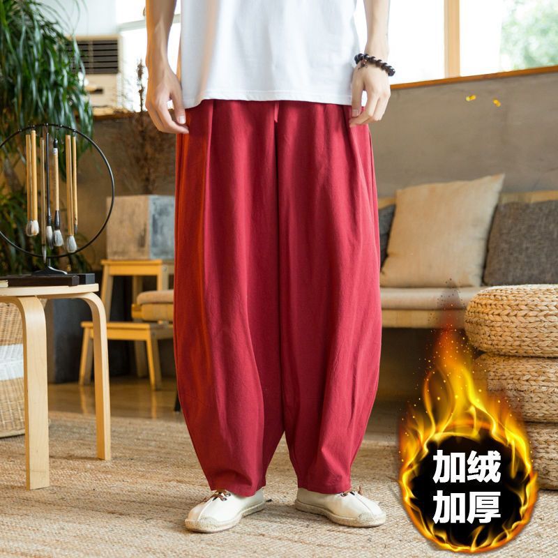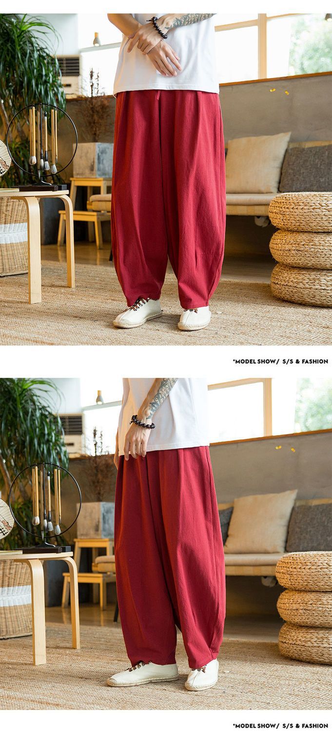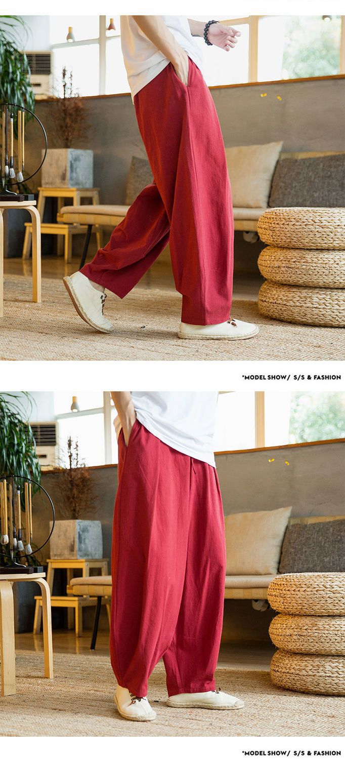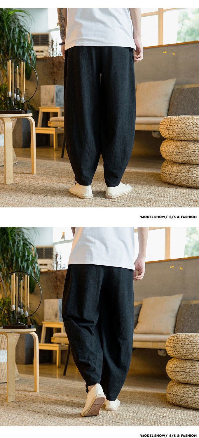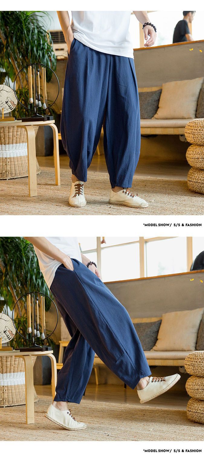 Primavera y verano marea nacional pantalones sueltos hasta el pantalón con pies pequeños, pantalones harem de talla grande más gordos pantalones casuales de algodón y lino de pierna ancha para hombres