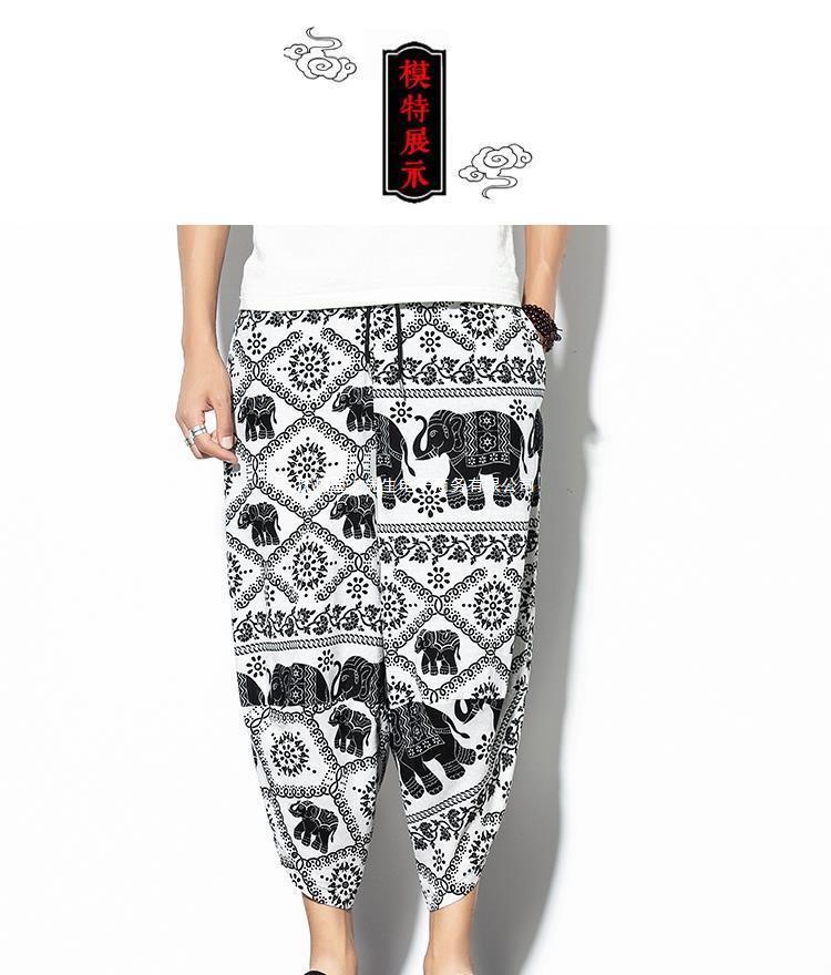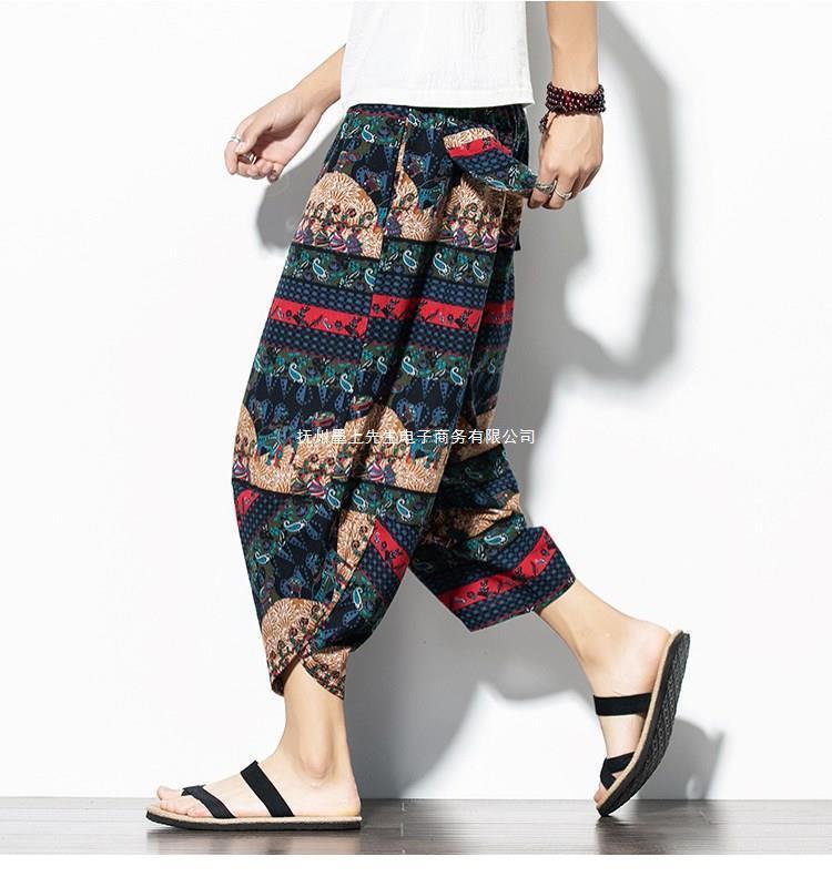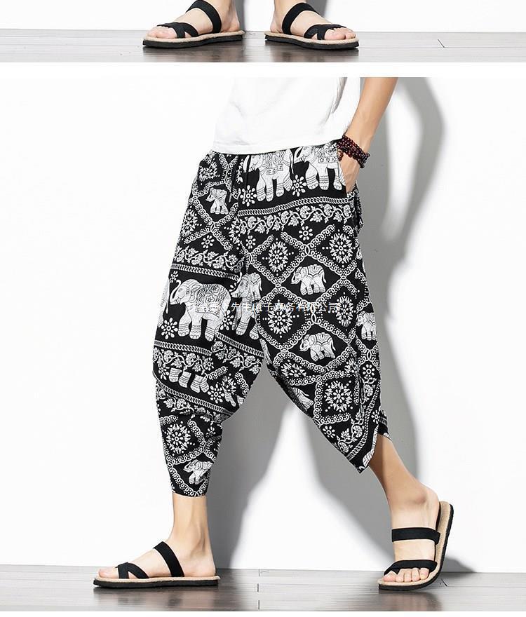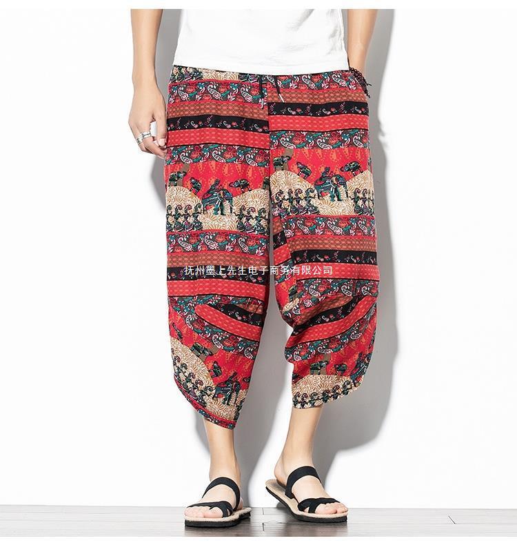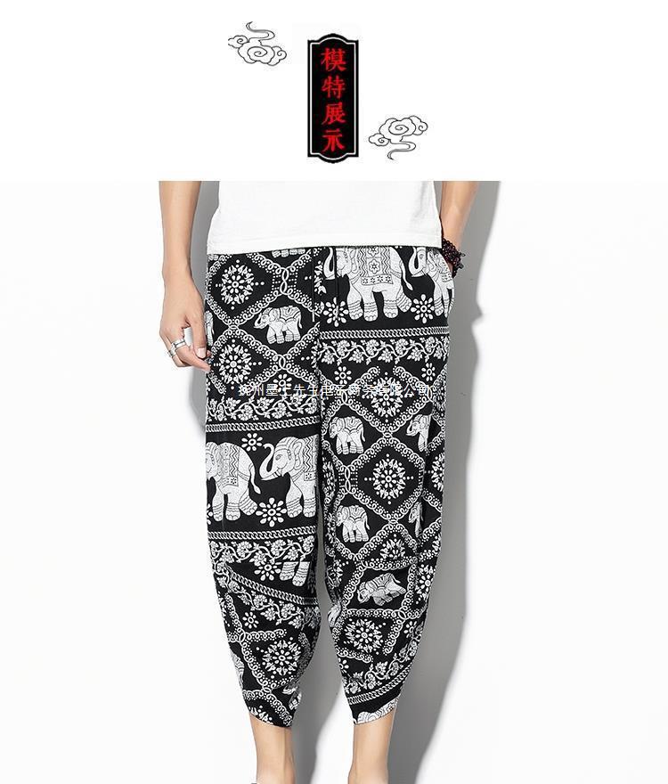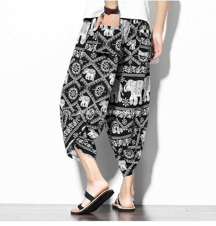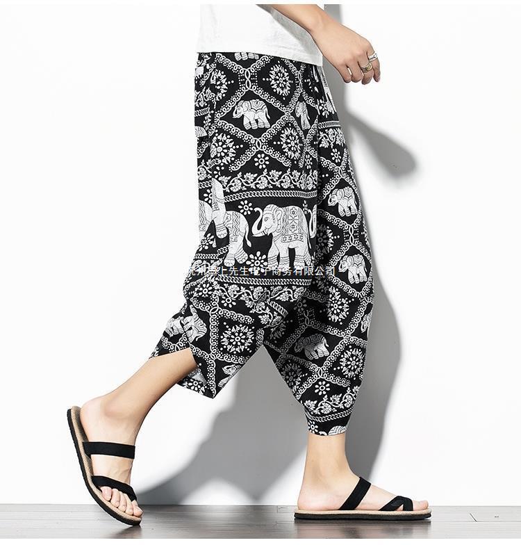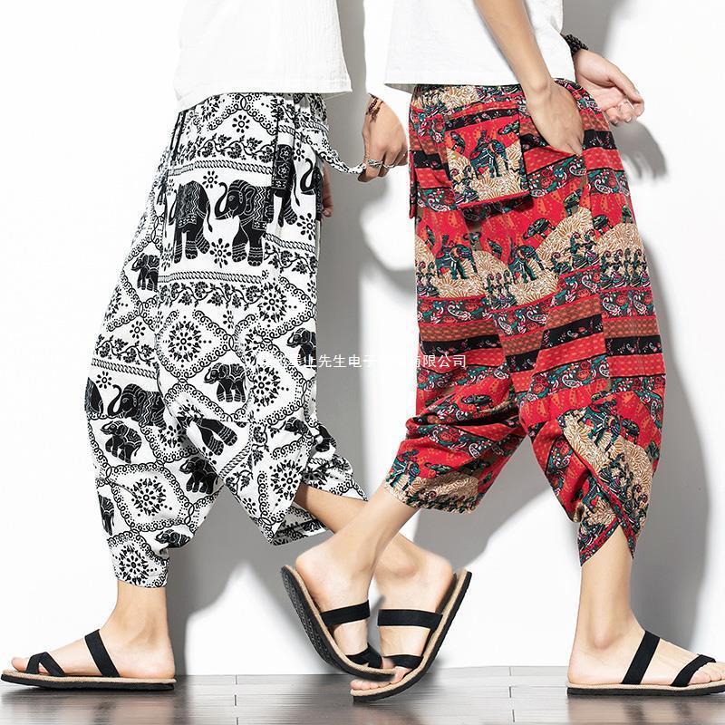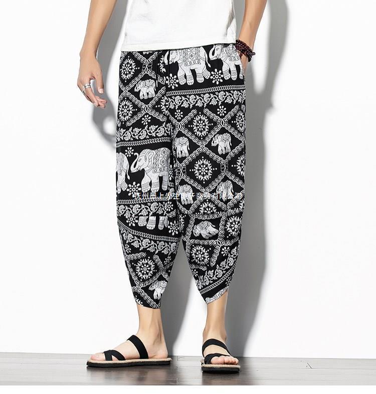 Pantalones anchos de algodón y lino gordo de verano para hombres pantalones de flores recortados sueltos de gran tamaño pantalones de estilo étnico pantalones de elefante tailandés
