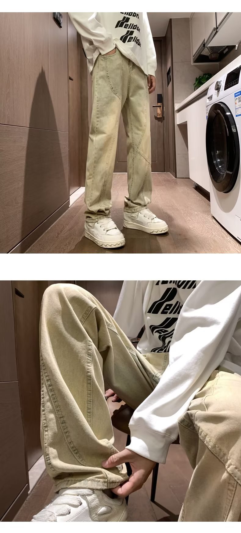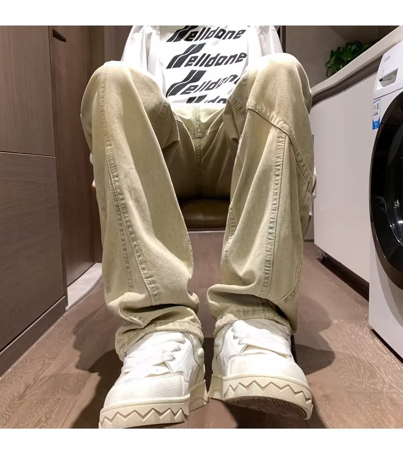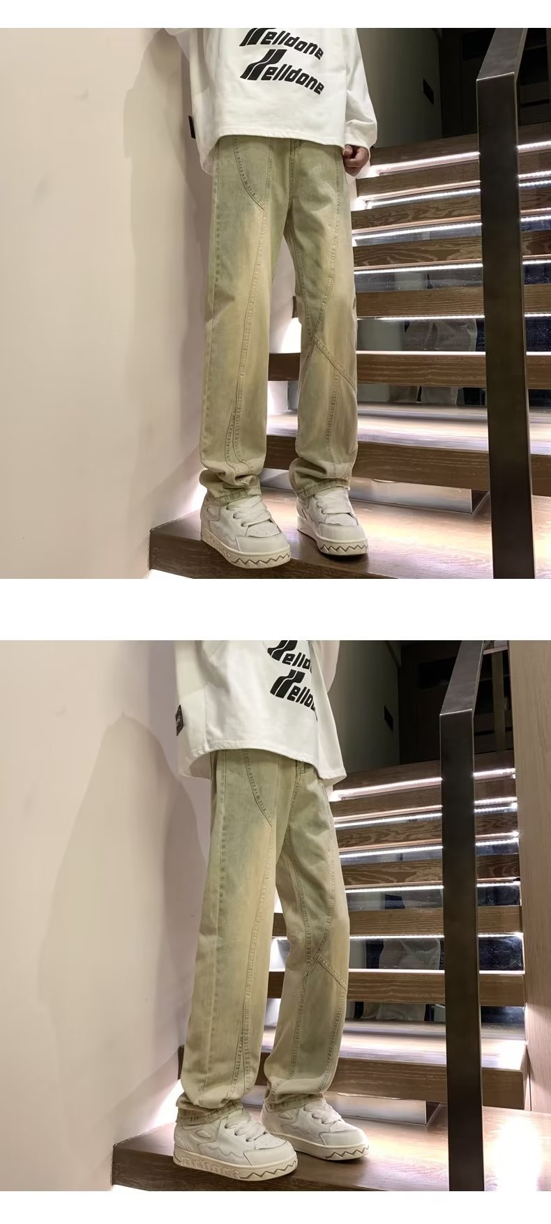Pantalones retro estadounidenses, jeans teñidos de barro amarillo lavados de la marca de moda de la calle alta, jeans rectos delgados para hombres