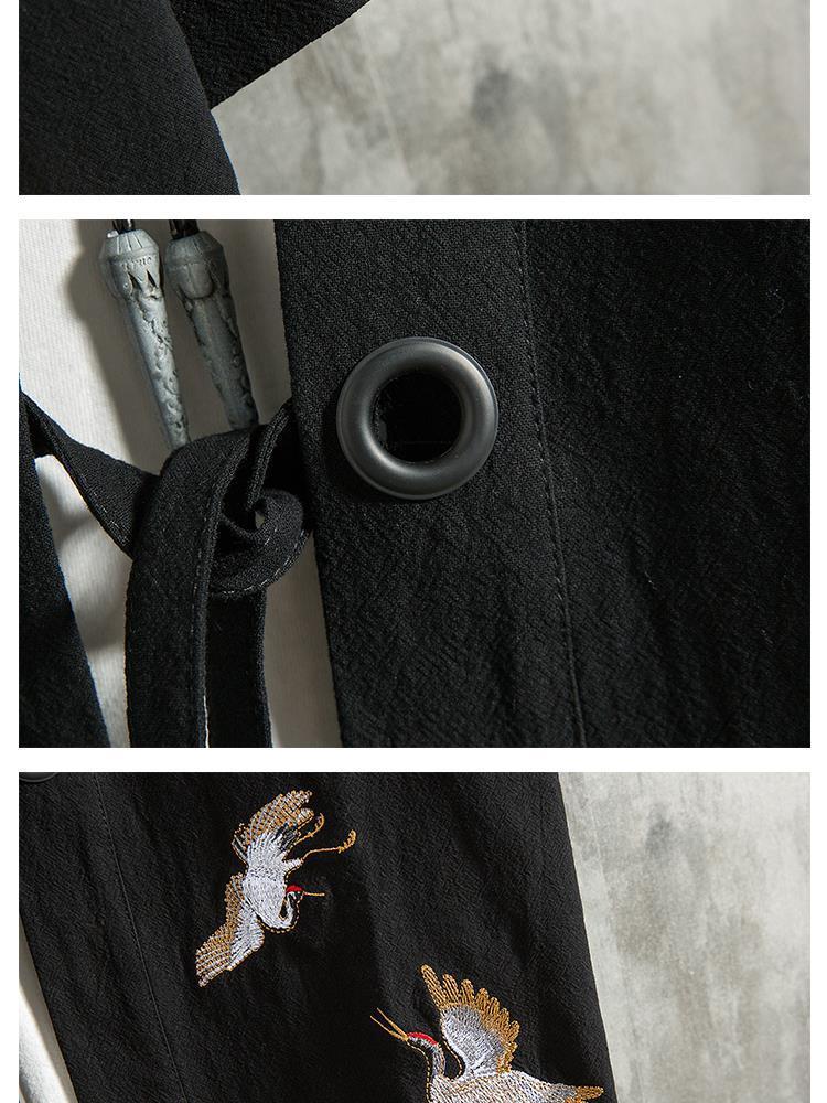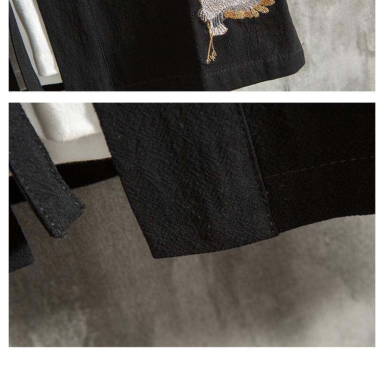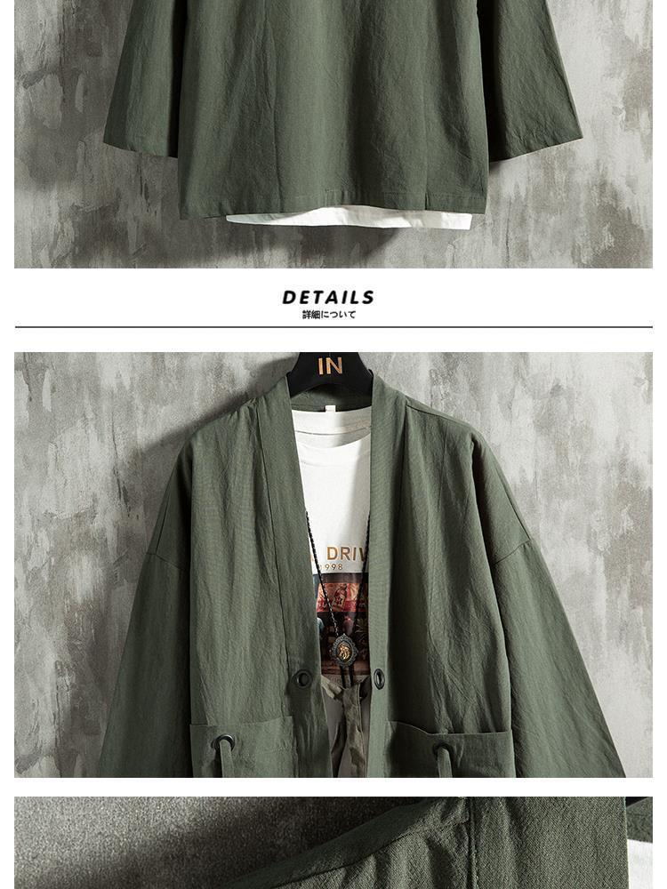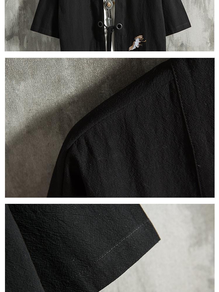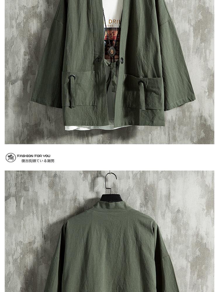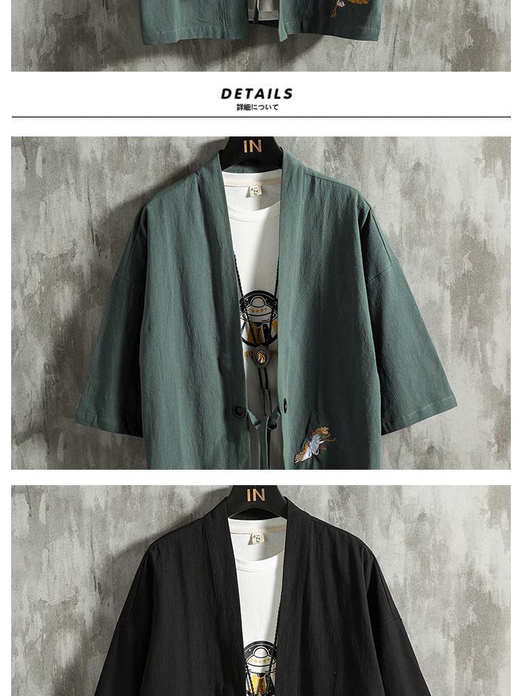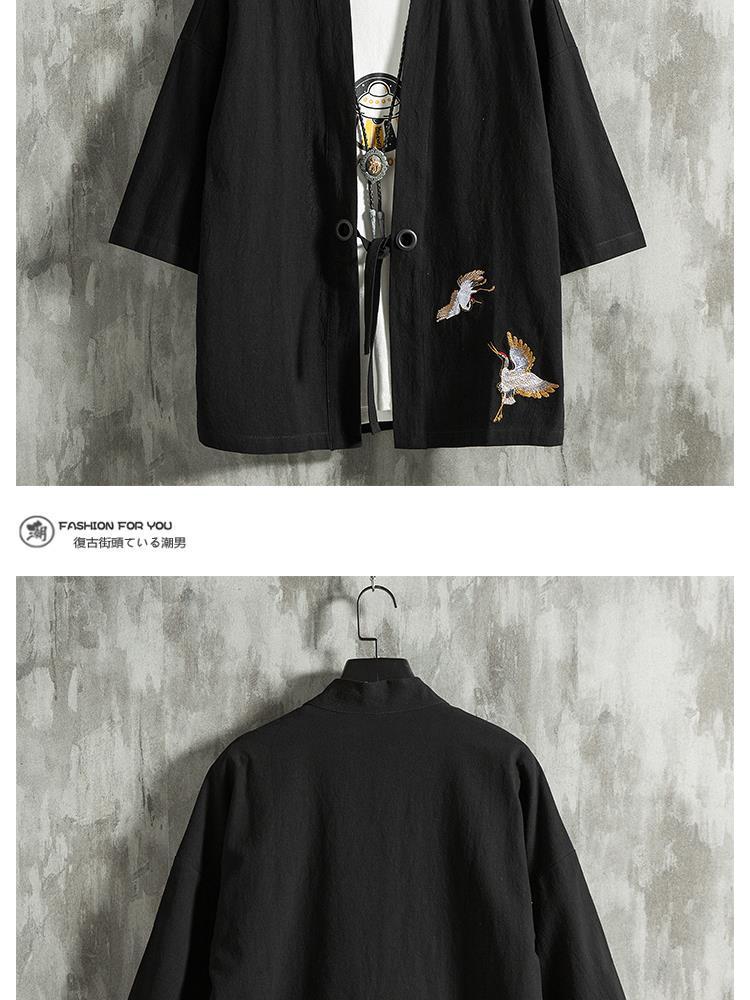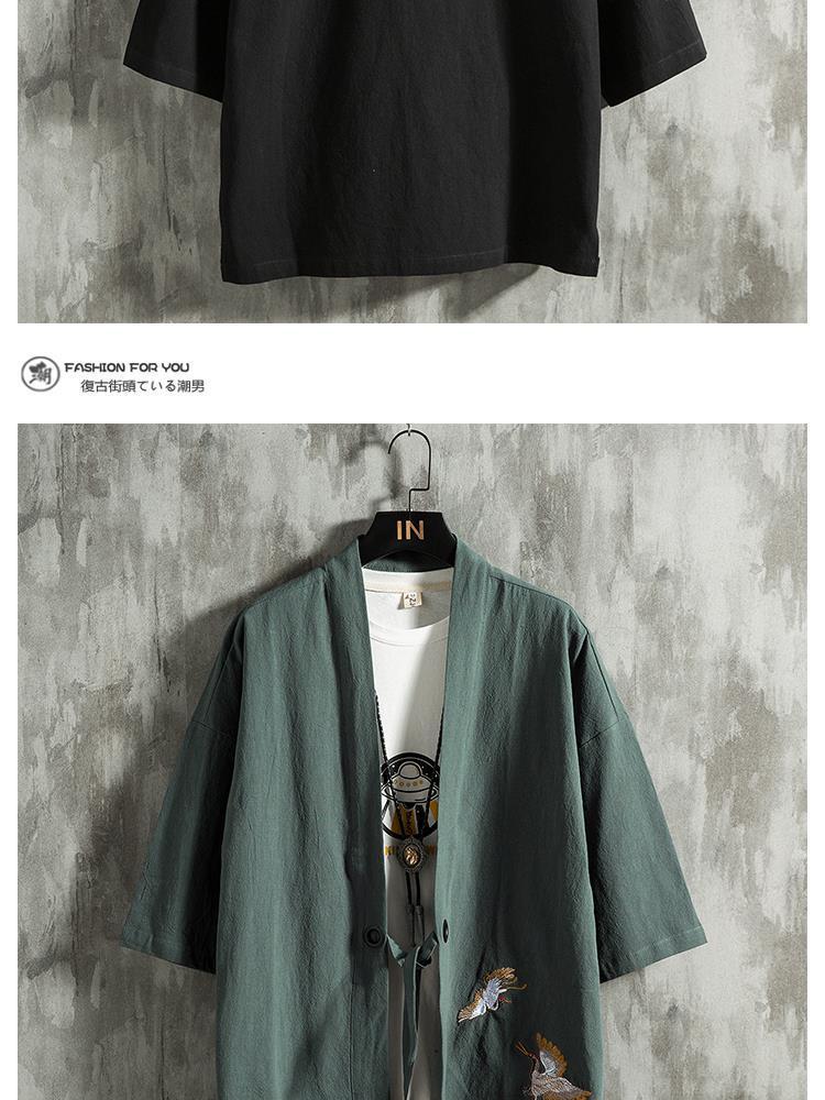 Verano estilo chino pluma tejida túnica Hanfu hombres cárdigan algodón y lino kimono japonés lino camisa de manga tres cuartos