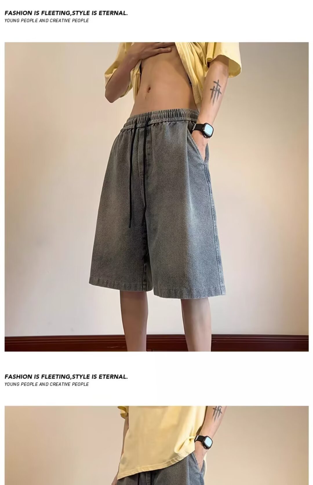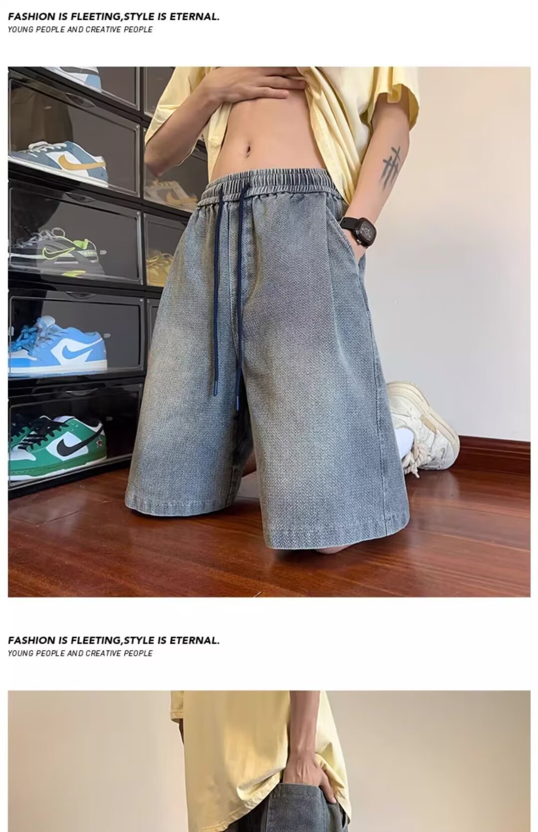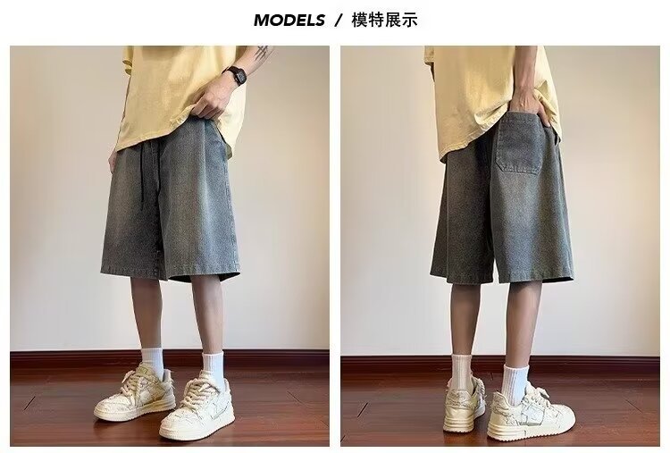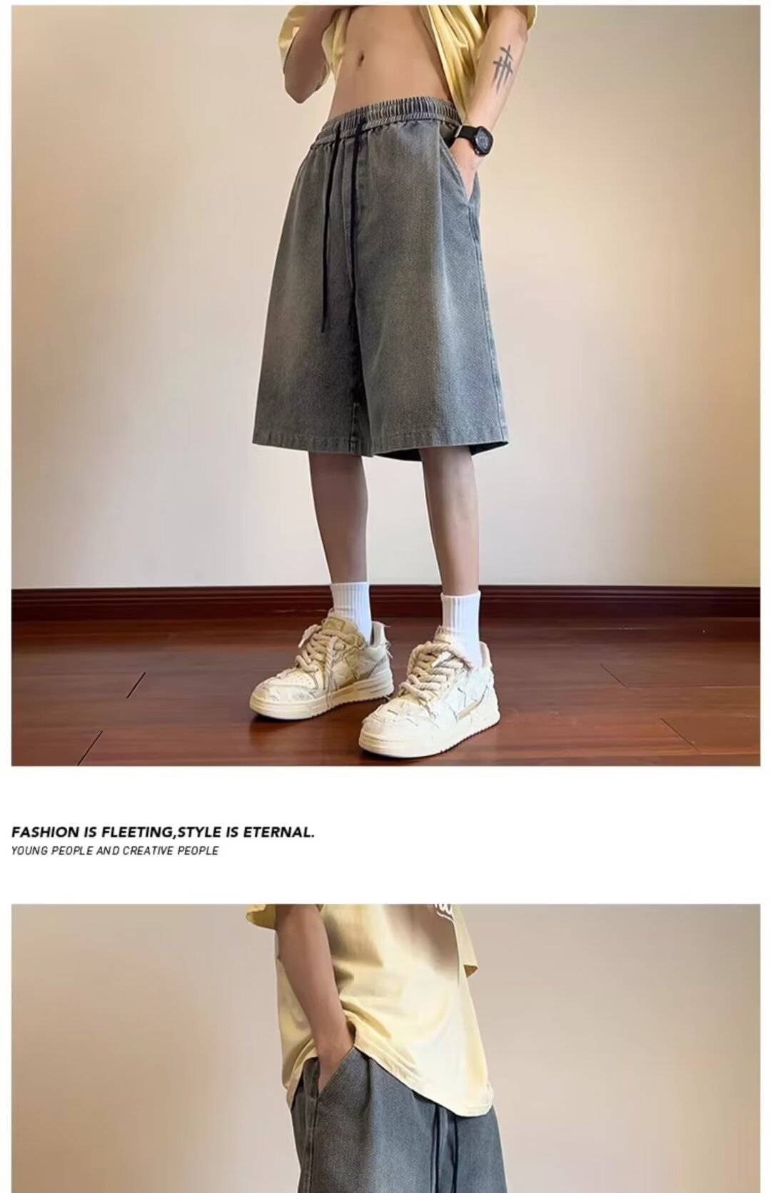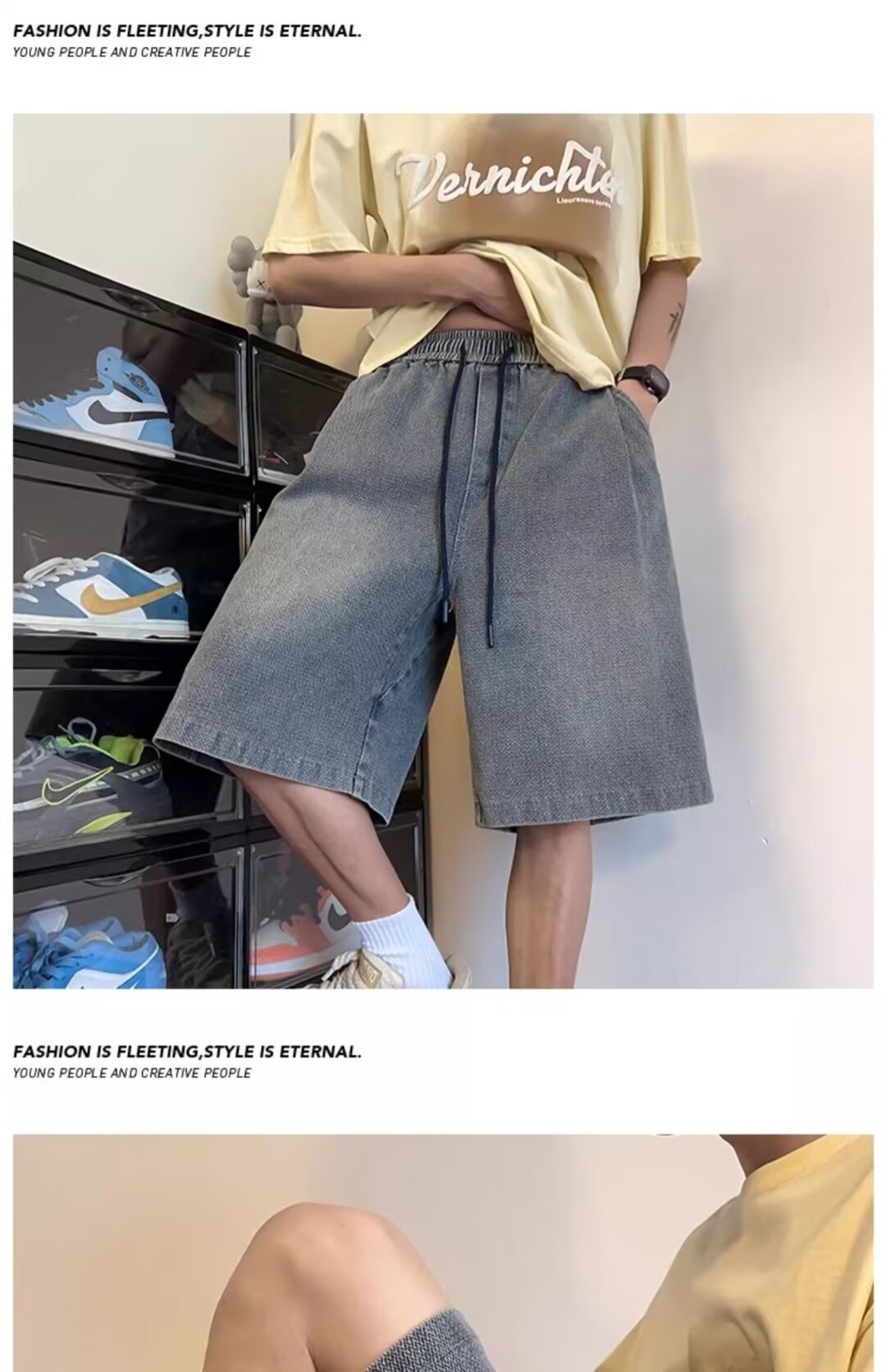 Moda japonesa cityboy pantalones cortos de mezclilla azul de cinco puntos pantalones sueltos rectos de moda de verano para hombres