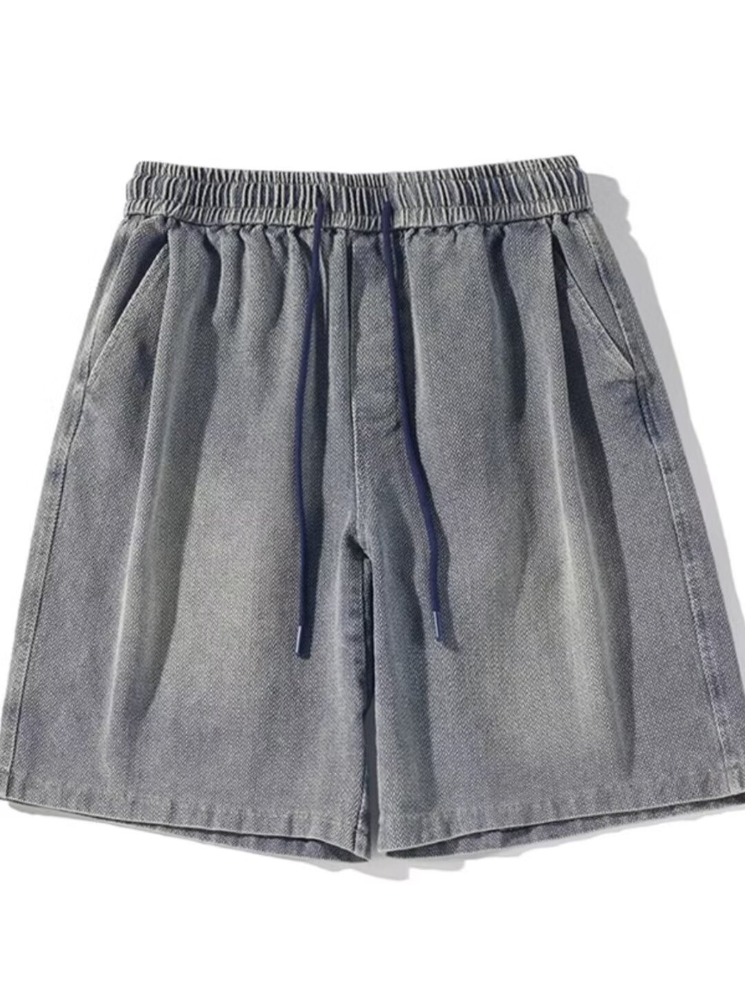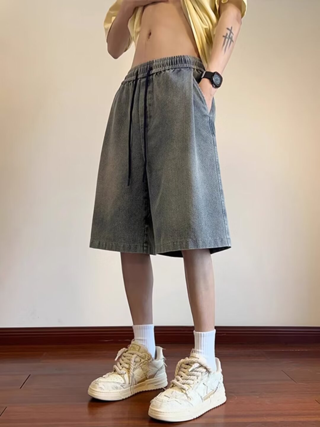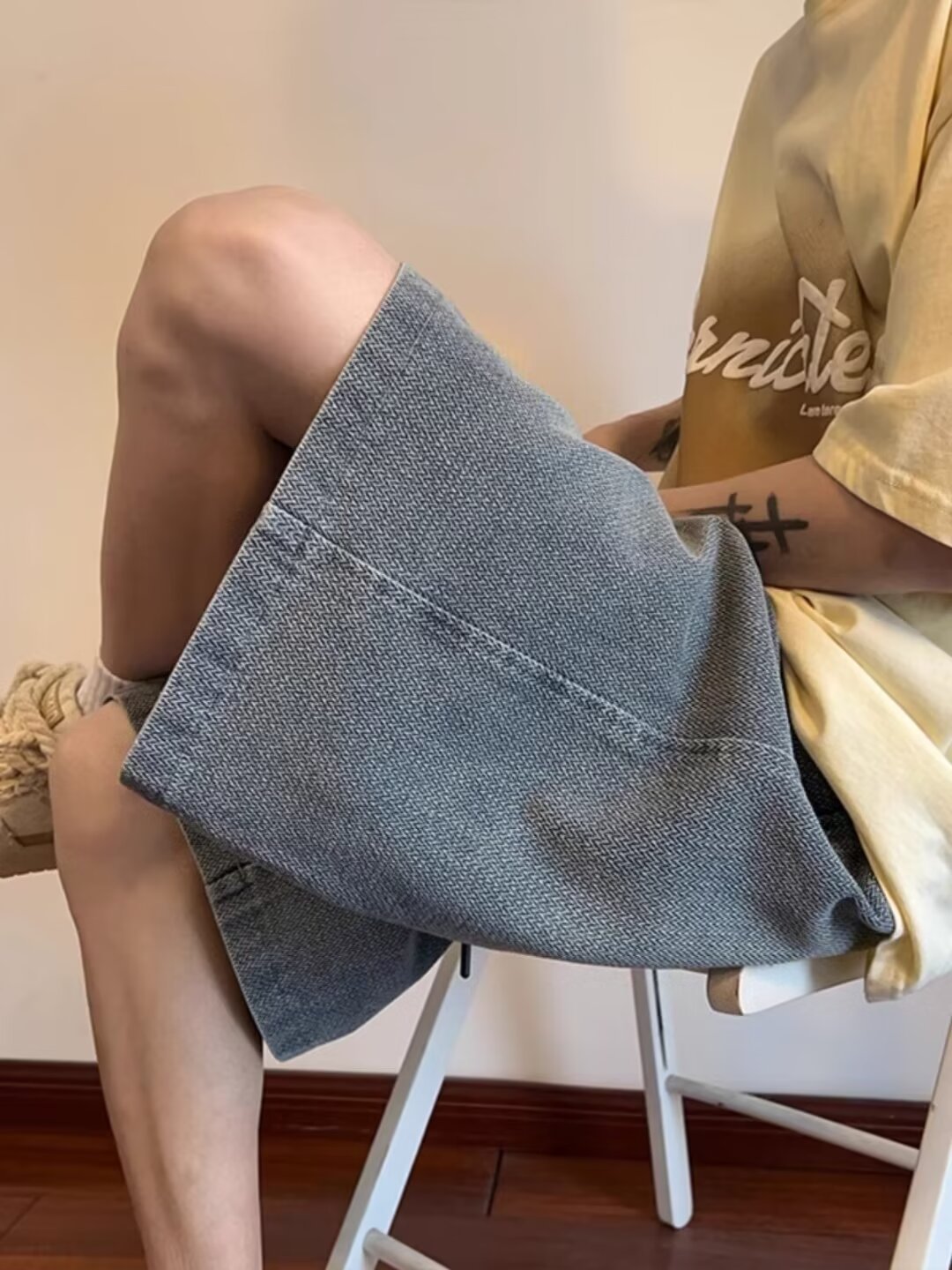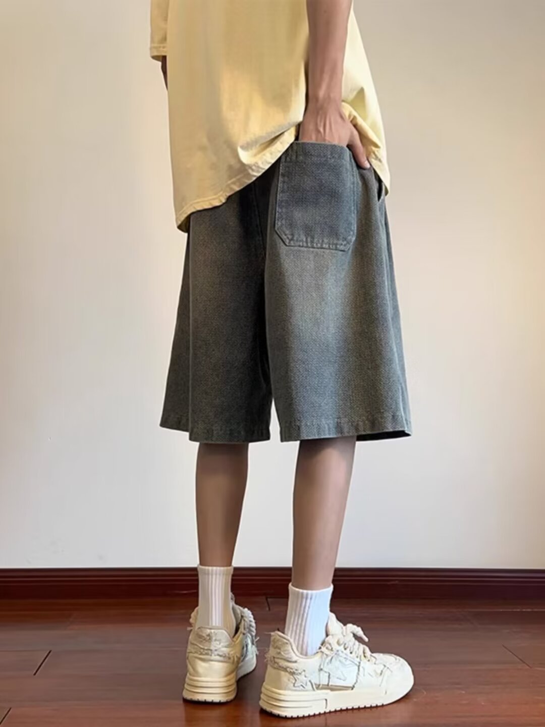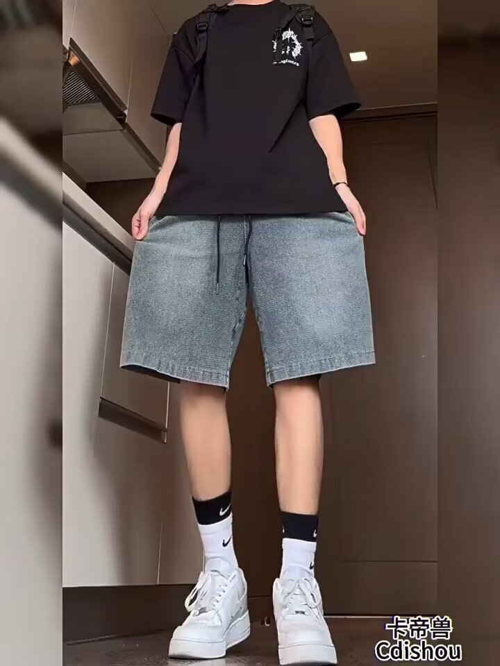Moda japonesa cityboy pantalones cortos de mezclilla azul de cinco puntos pantalones sueltos rectos de moda de verano para hombres
