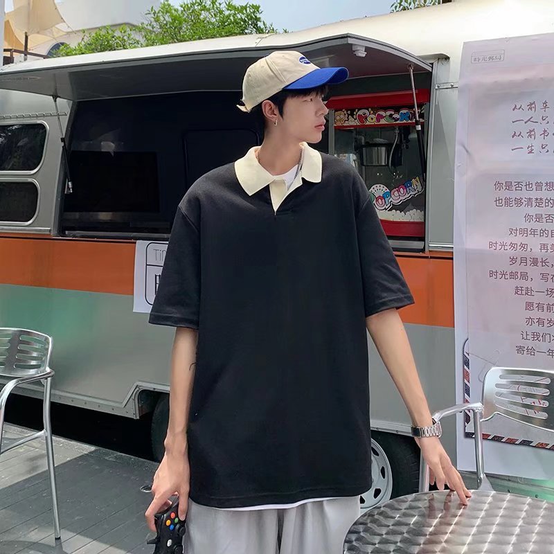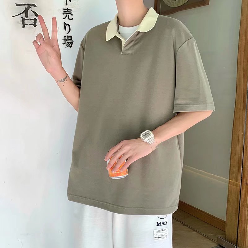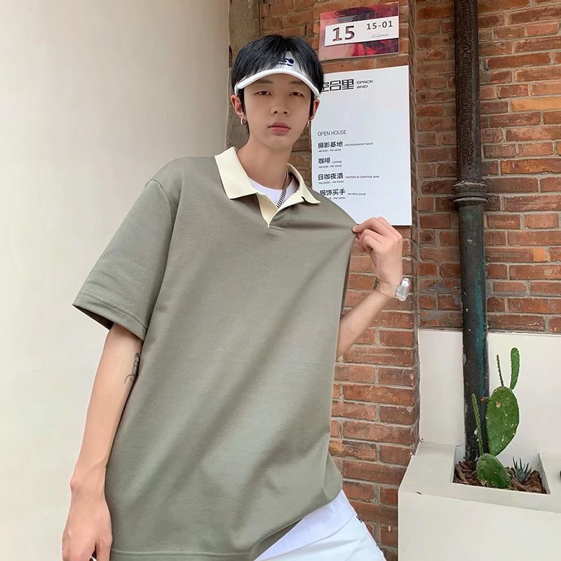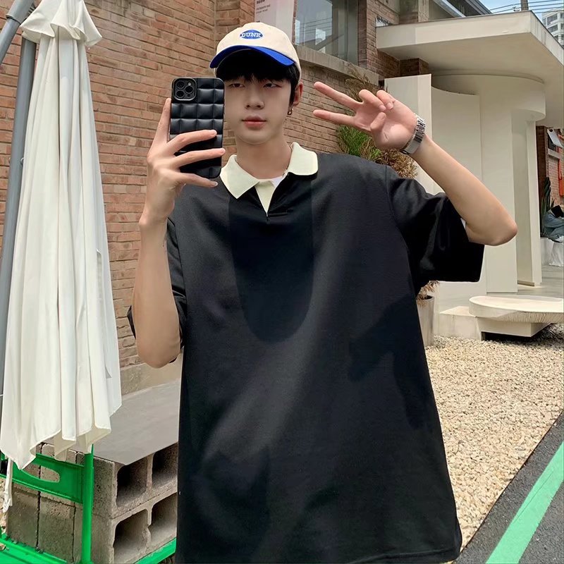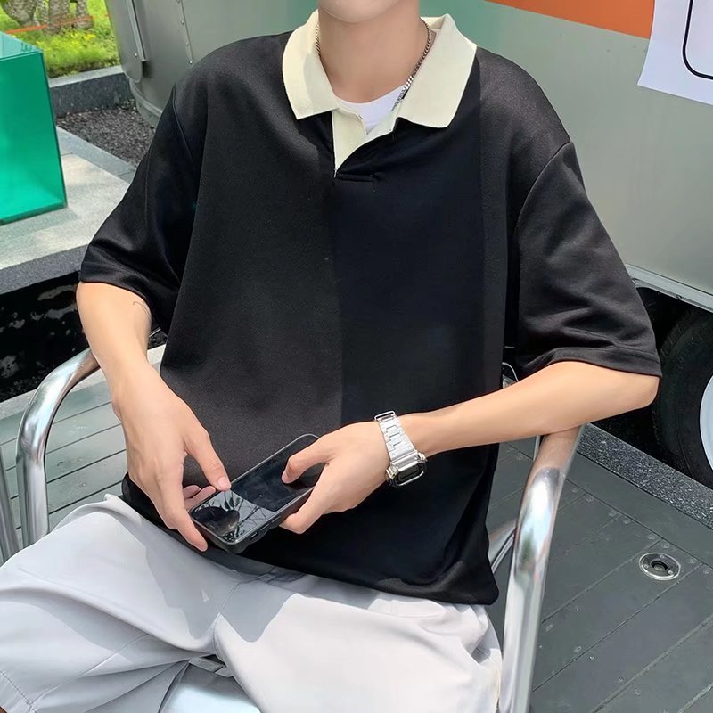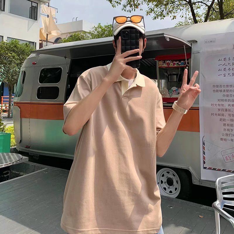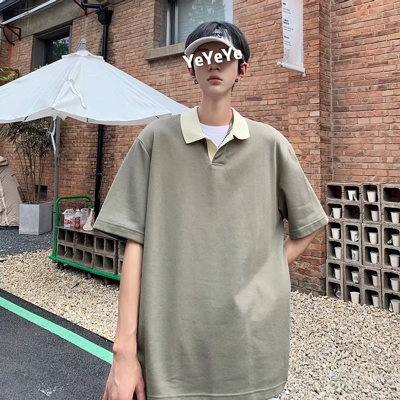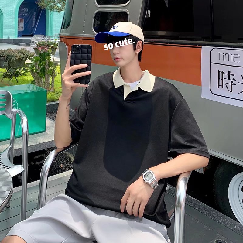Los polos de manga corta de moda de verano de la marca de moda ins, estilo de Hong Kong masculino, celebridad de Internet suelta japonesa, hermosa camiseta de media manga con cuello giratorio