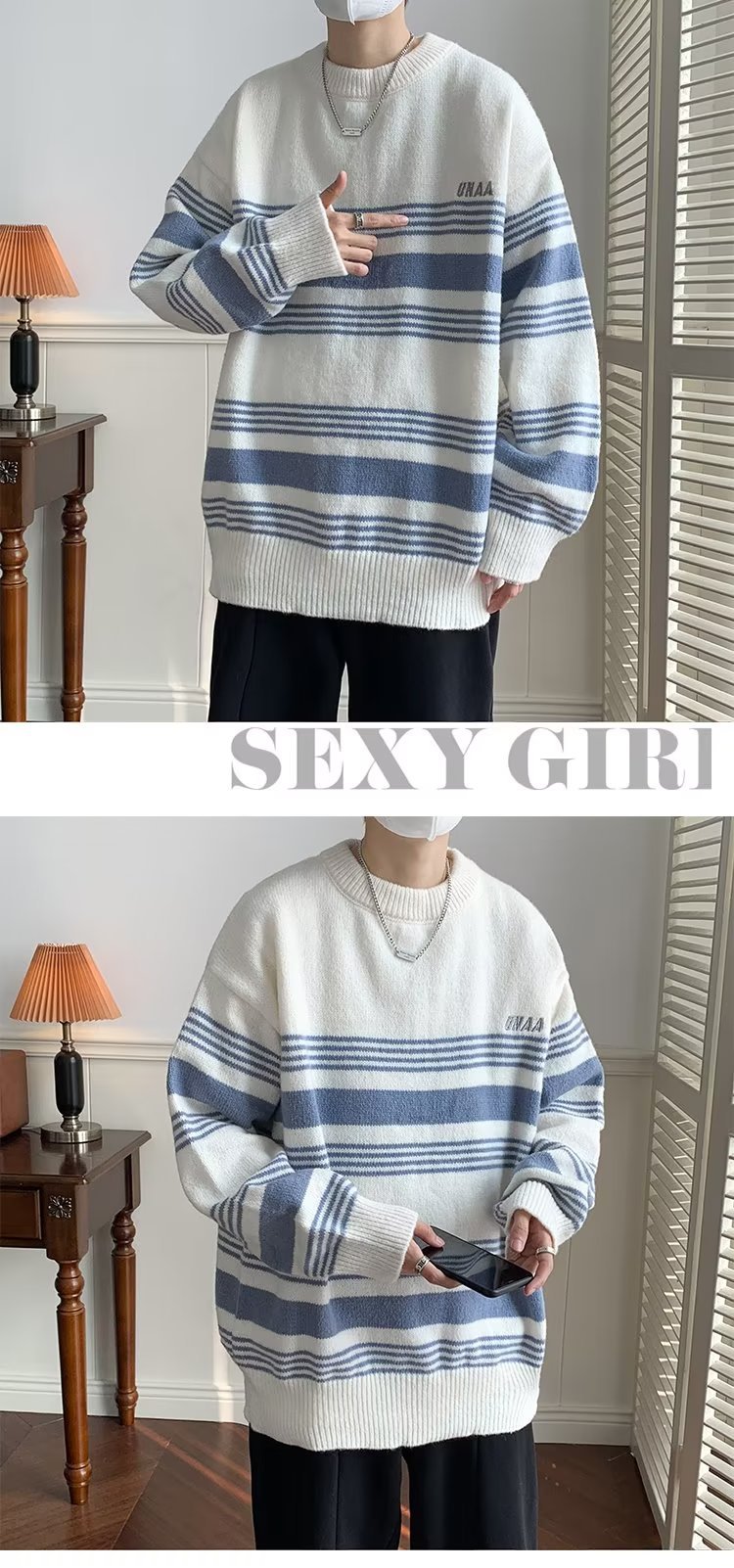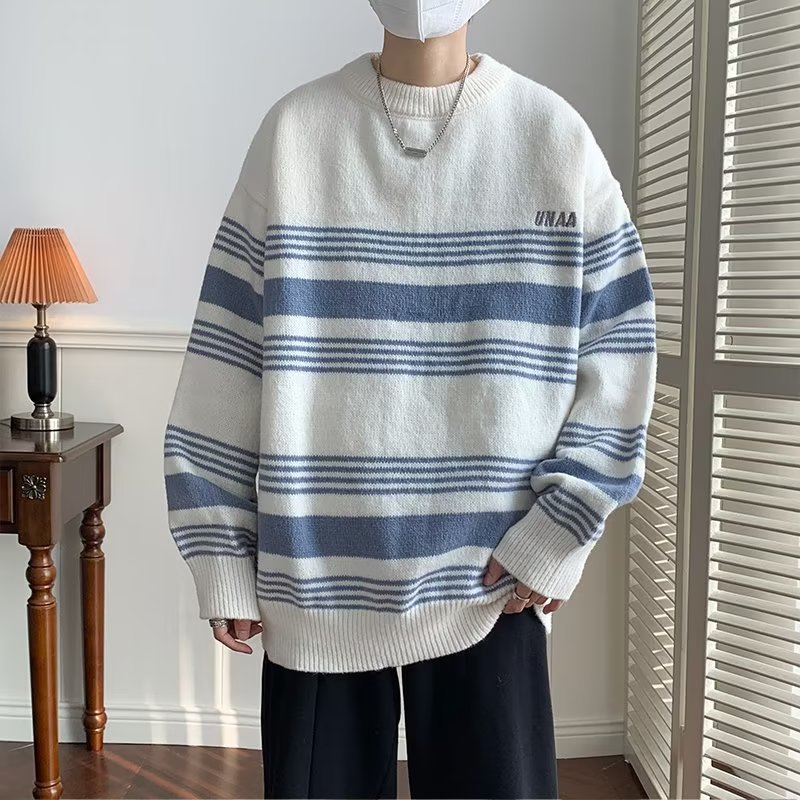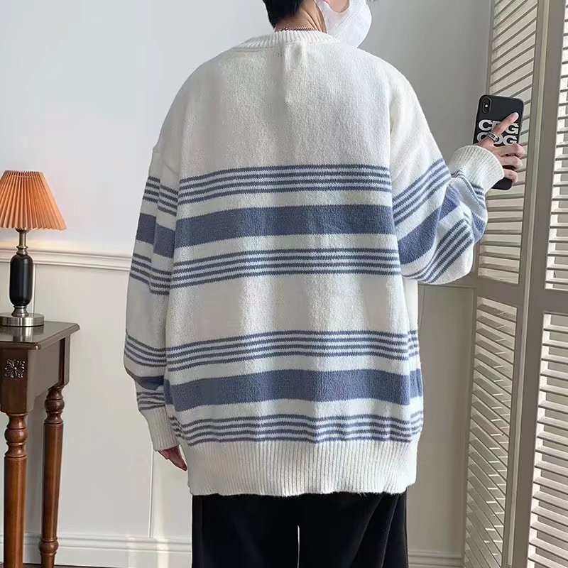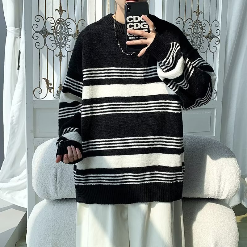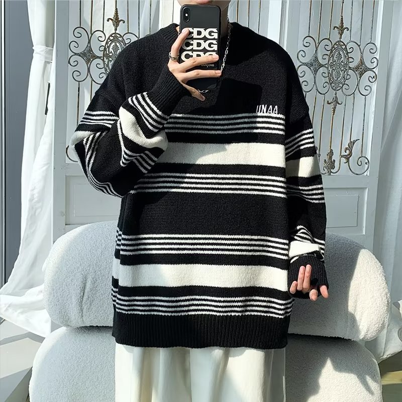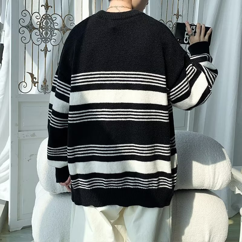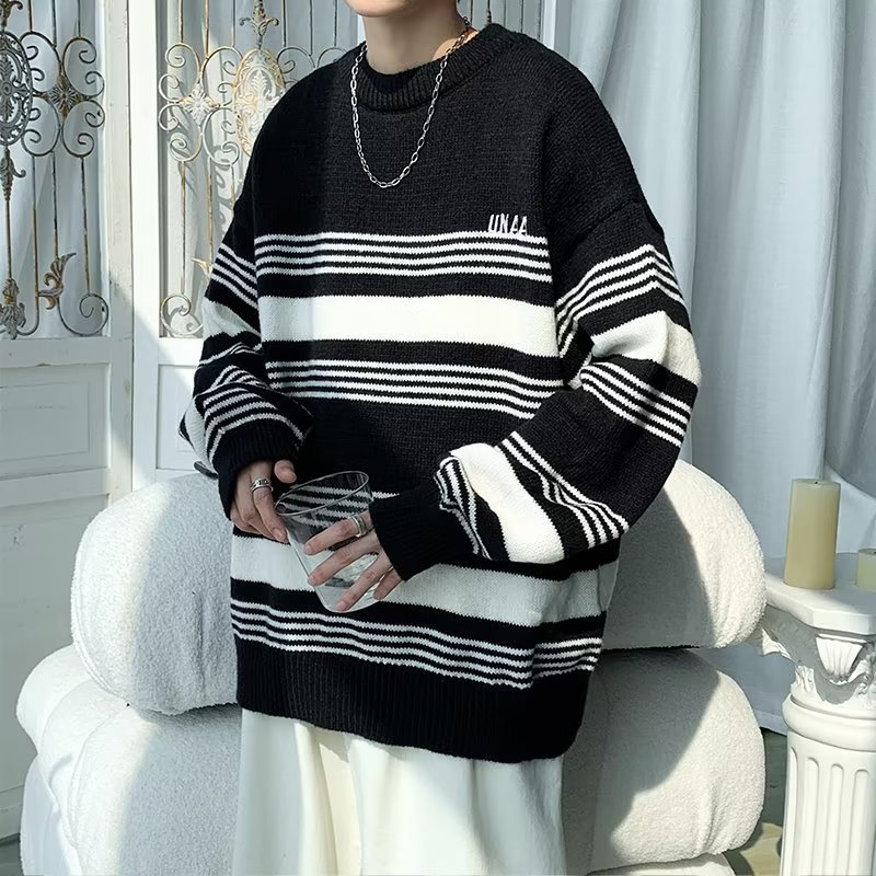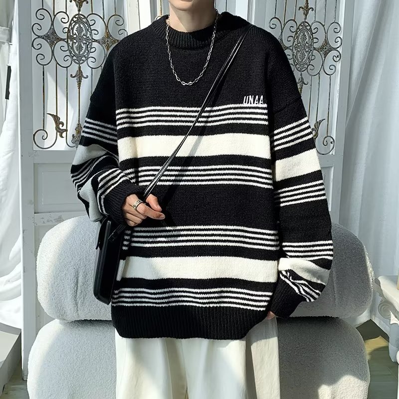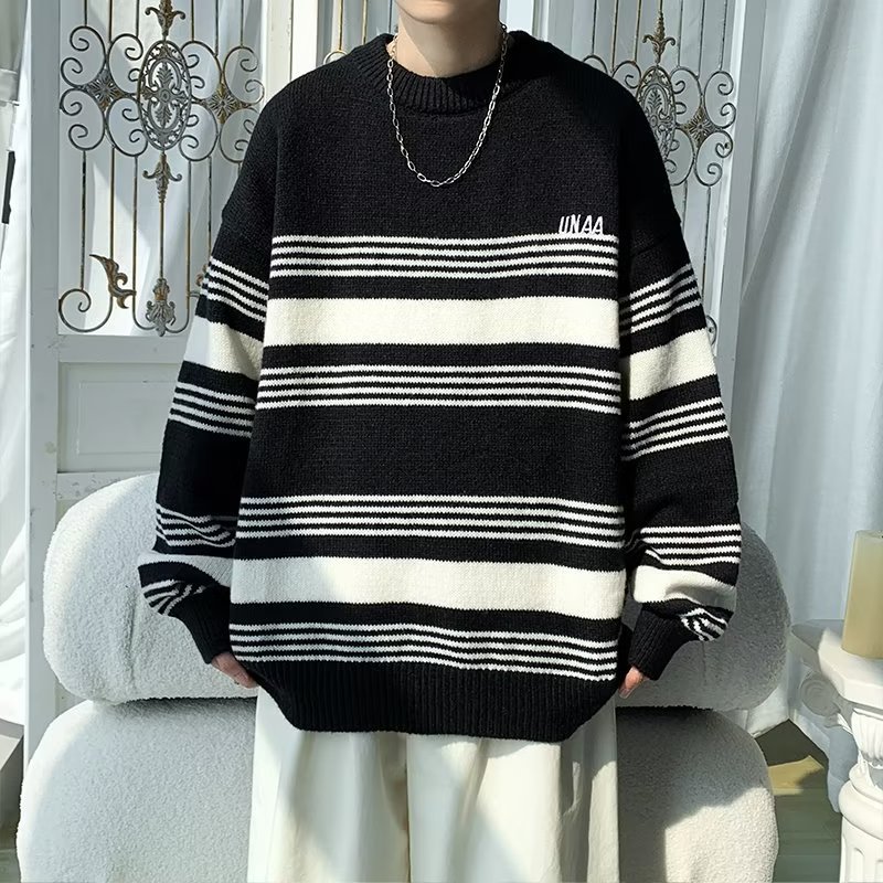 Suéter a rayas de moda en blanco y negro retro japonés de estilo perezoso, hombres y mujeres, sentido del diseño de otoño e invierno, suéter de punto de nicho