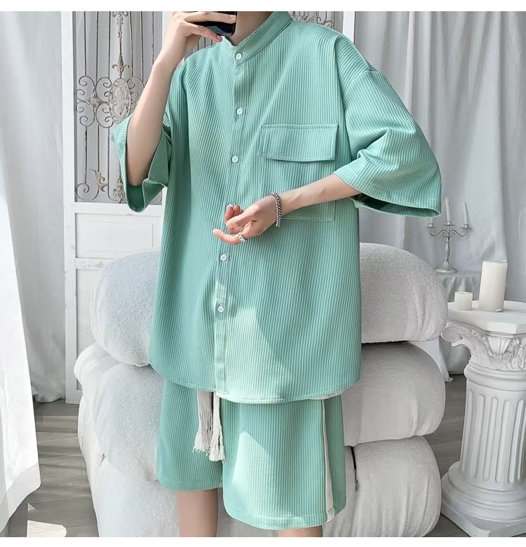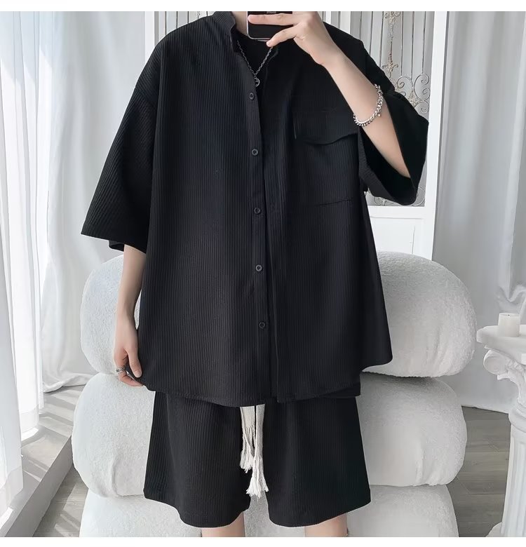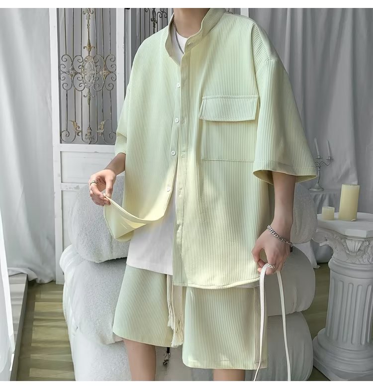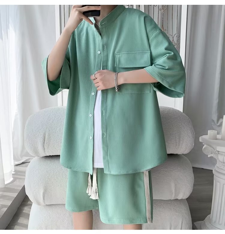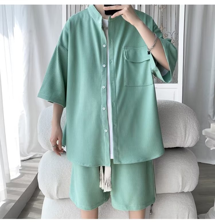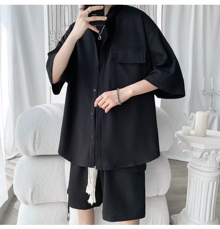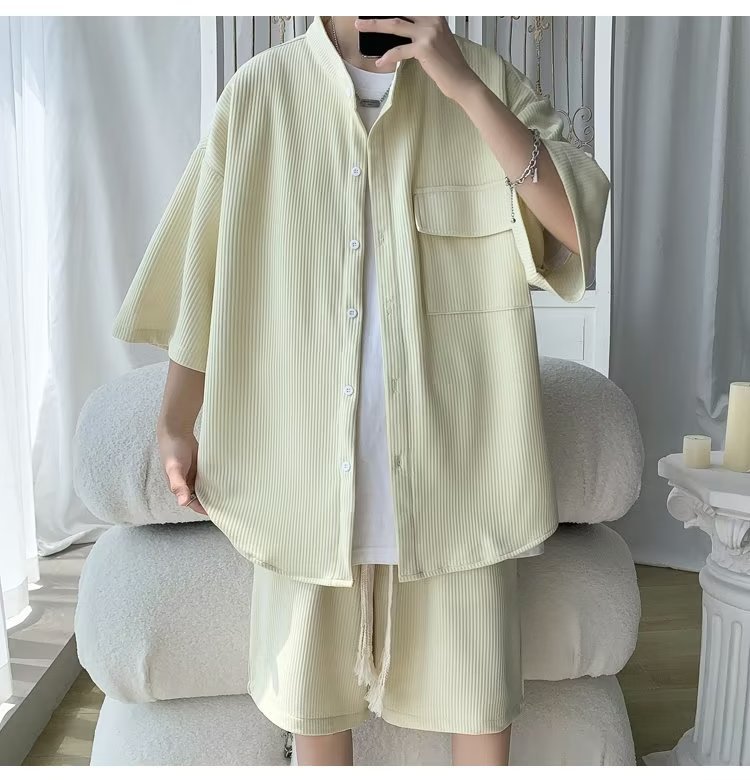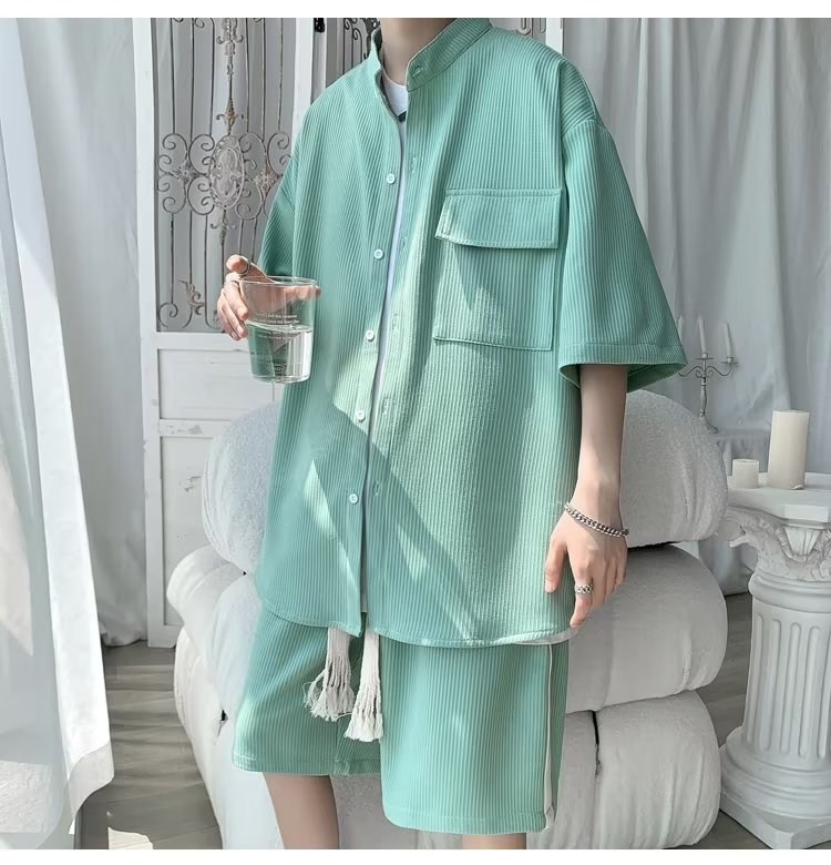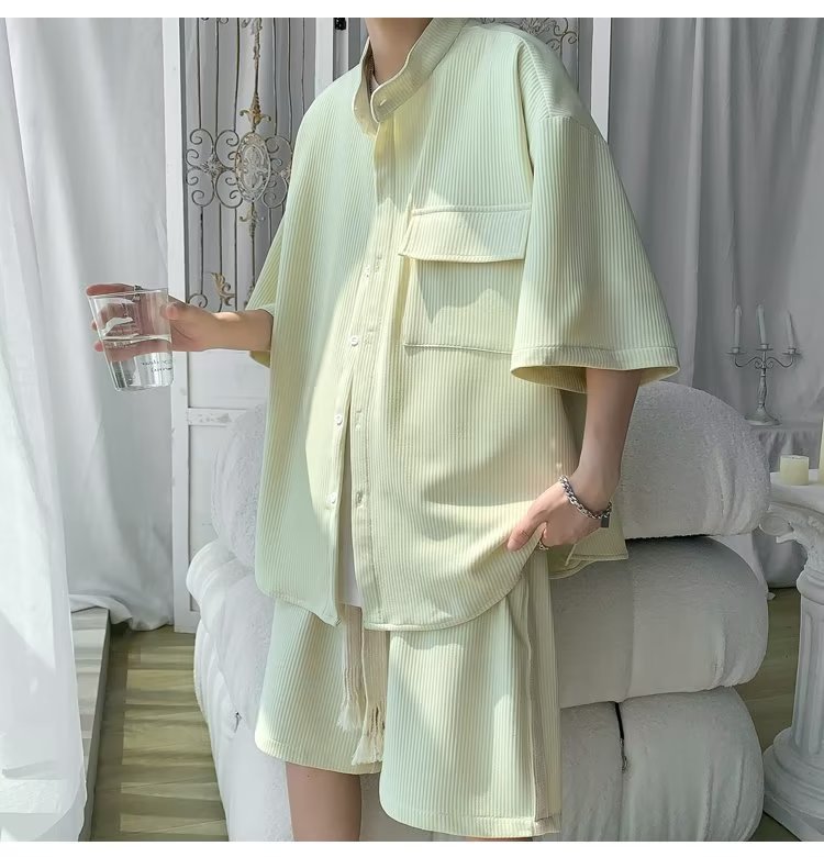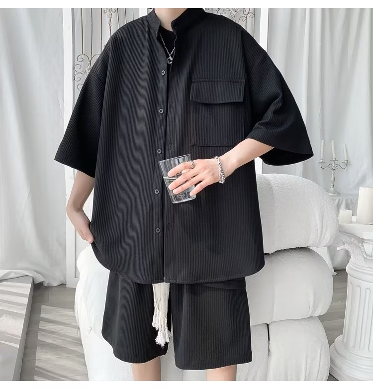 2024 nuevo estilo de moda estilo de Hong Kong de alta calidad traje de caída de seda de hielo pantalones cortos de camisa de manga corta para hombres control de dos piezas para hombres