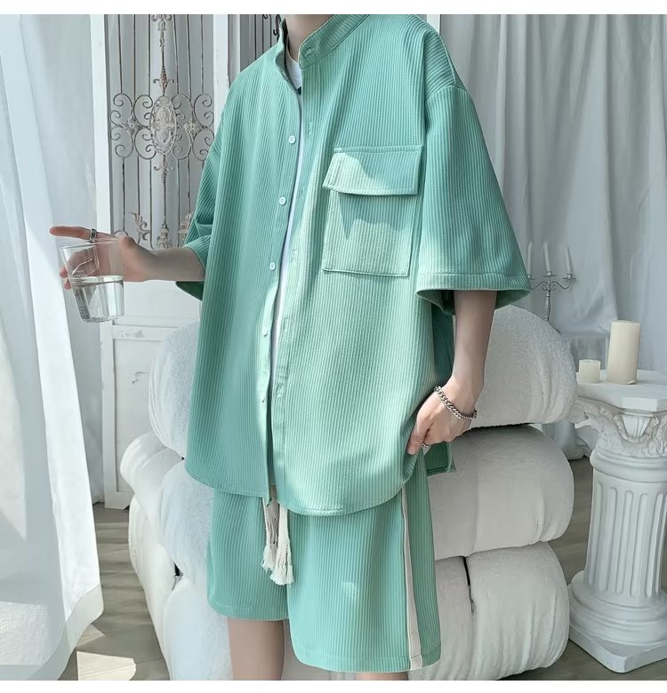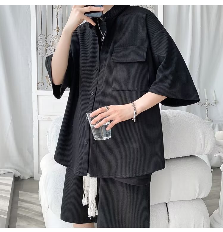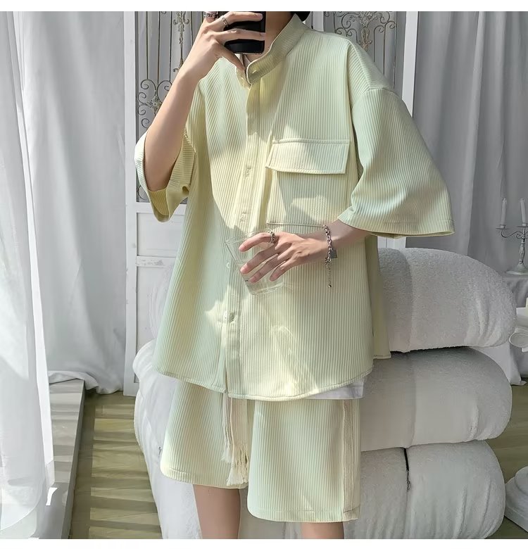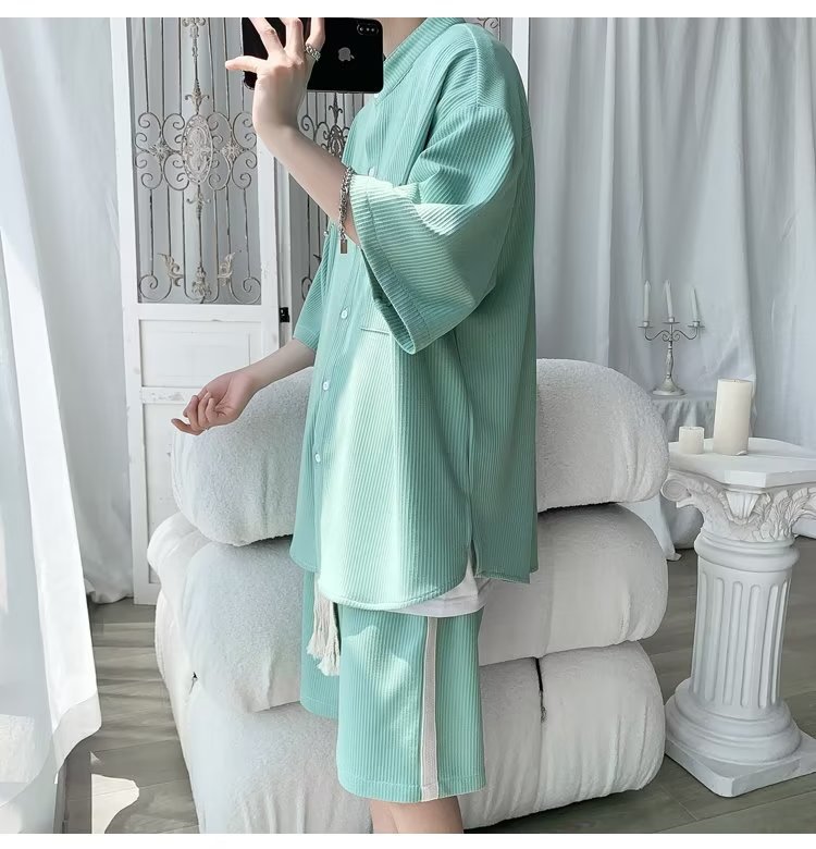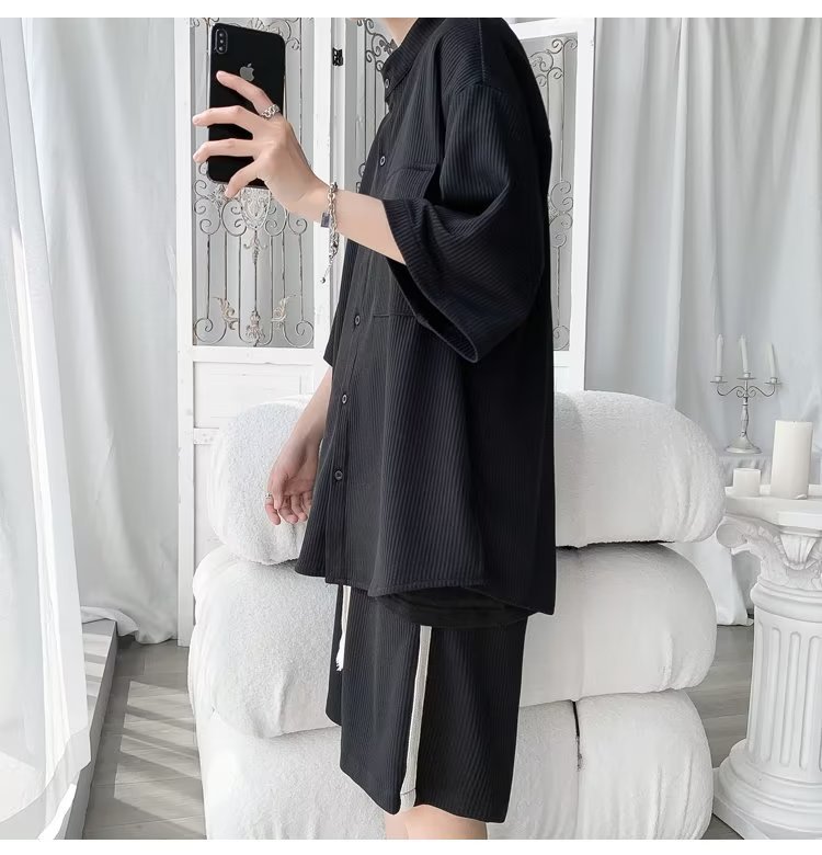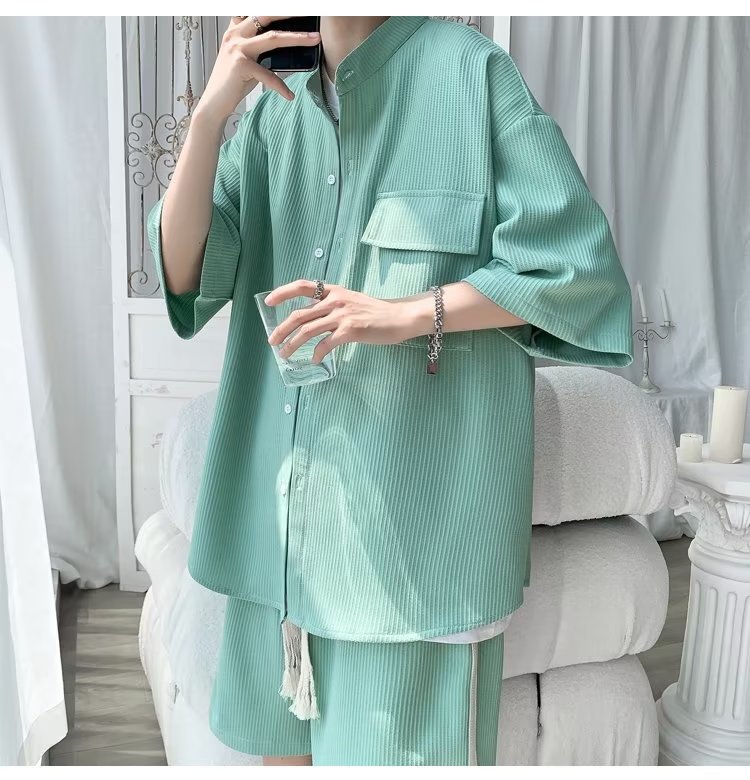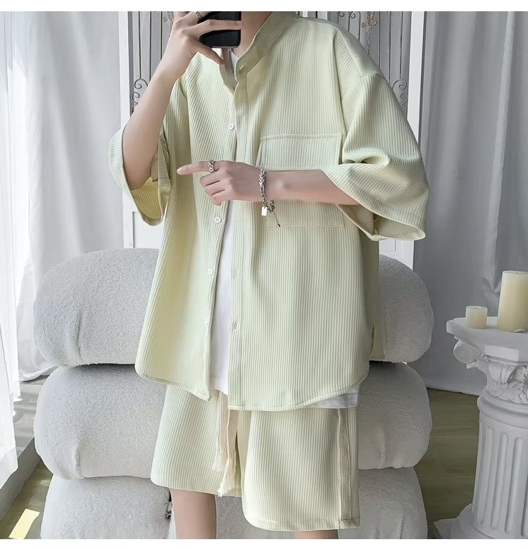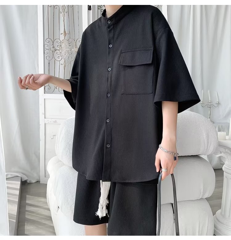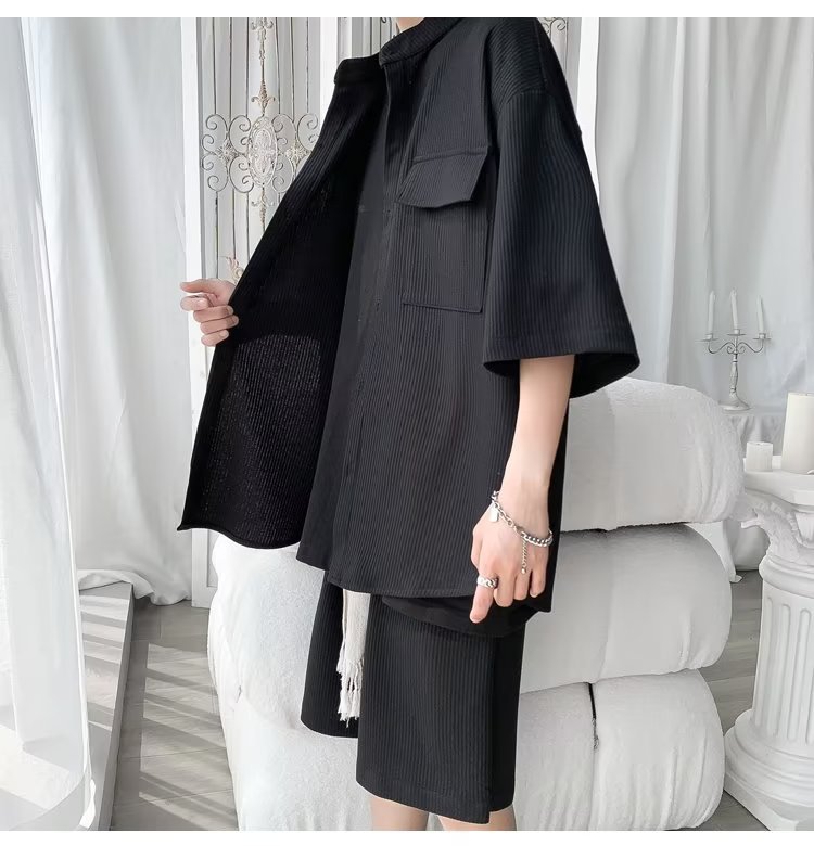 2024 nuevo estilo de moda estilo de Hong Kong de alta calidad traje de caída de seda de hielo pantalones cortos de camisa de manga corta para hombres control de dos piezas para hombres