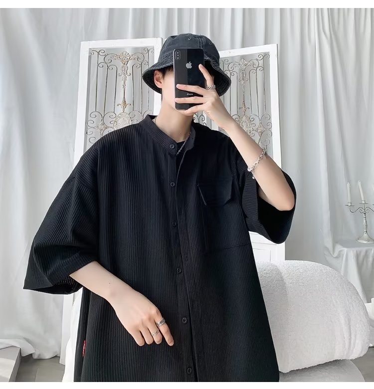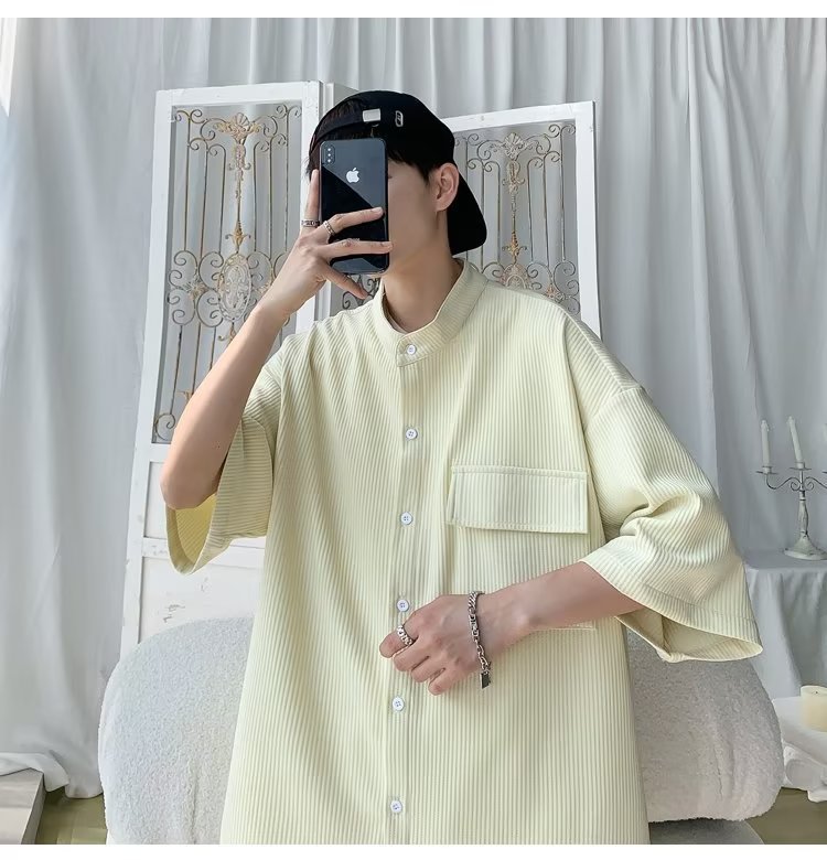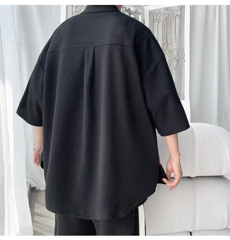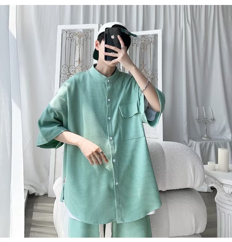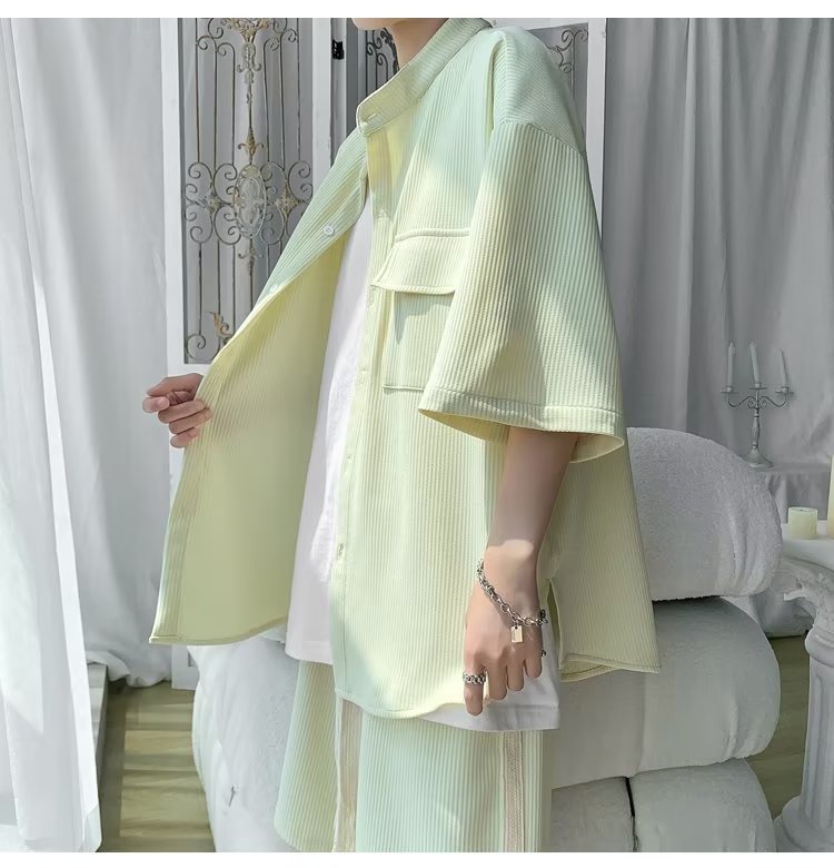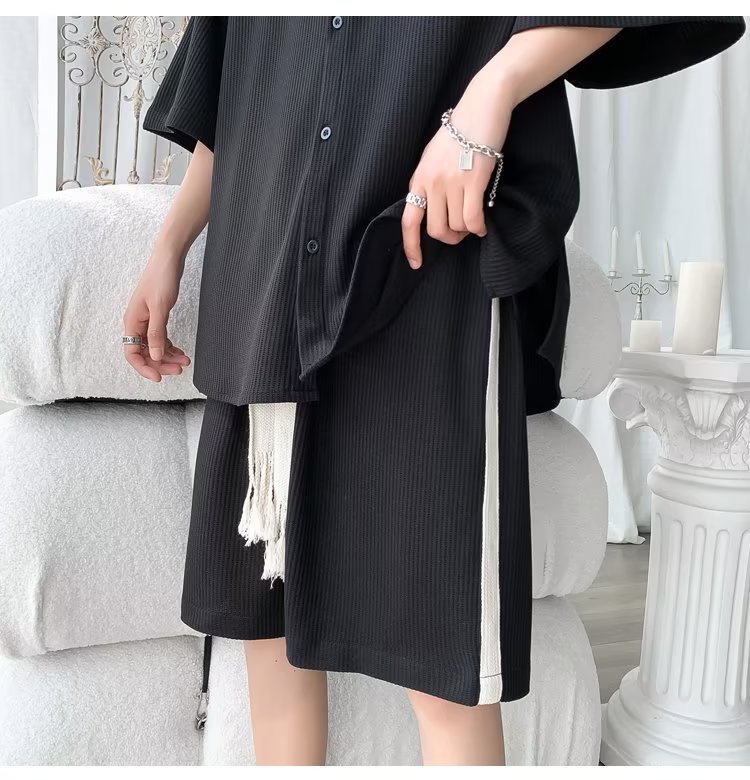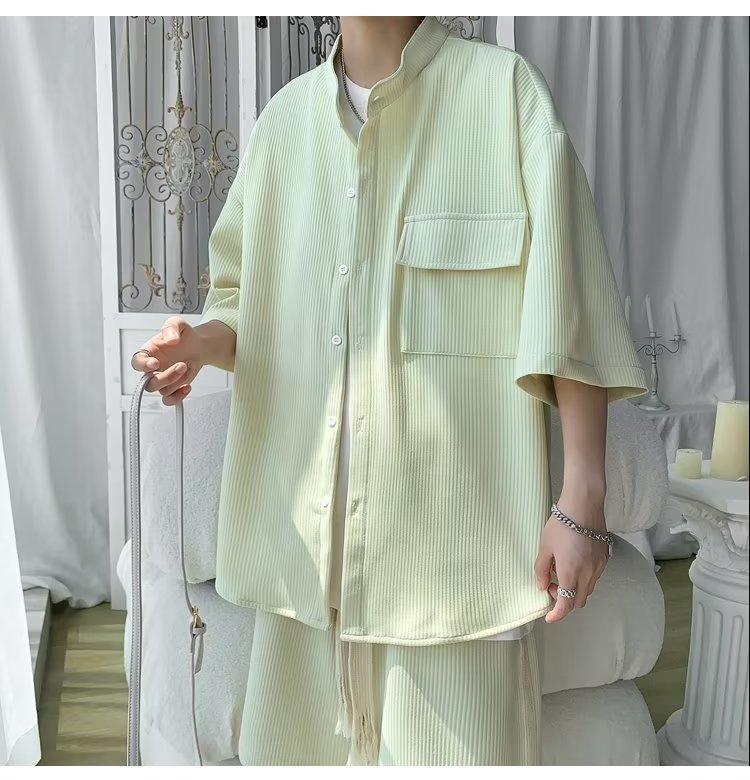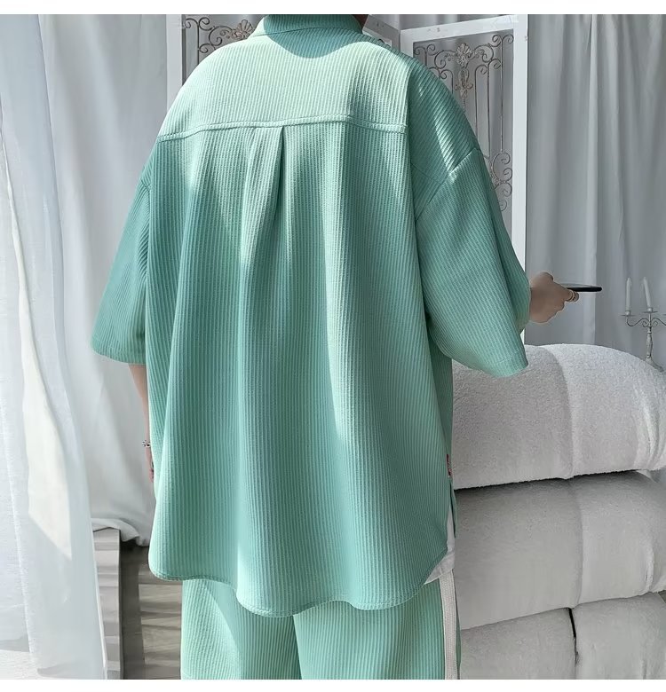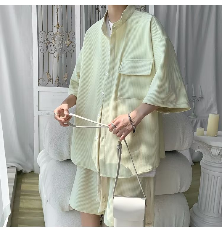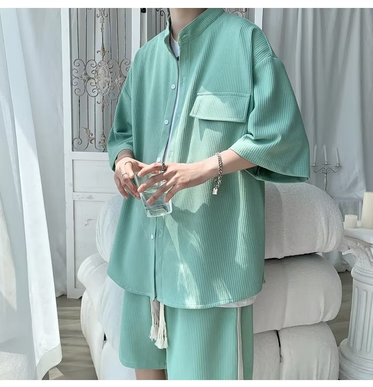 2024 nuevo estilo de moda estilo de Hong Kong de alta calidad traje de caída de seda de hielo pantalones cortos de camisa de manga corta para hombres control de dos piezas para hombres