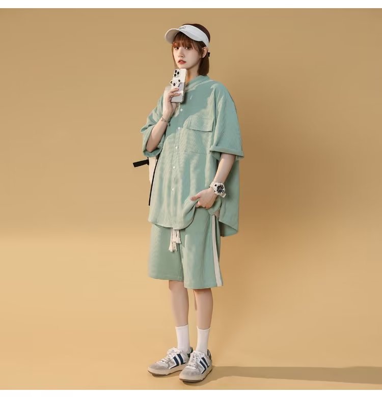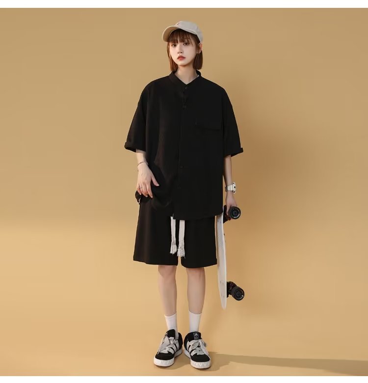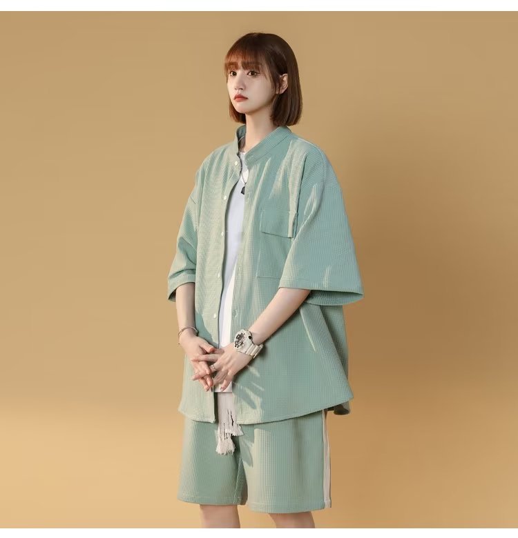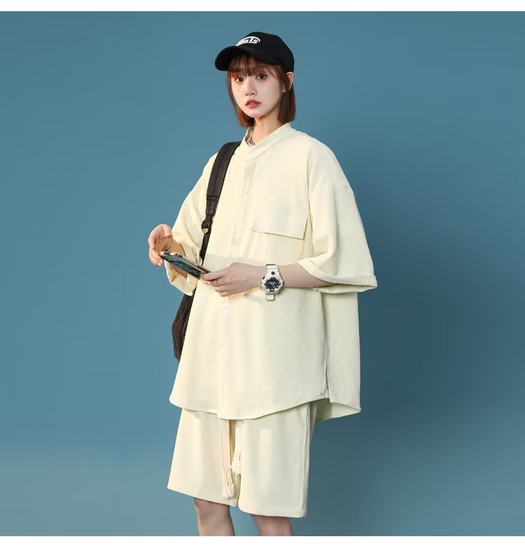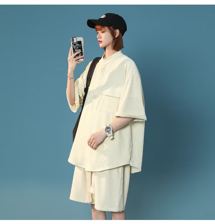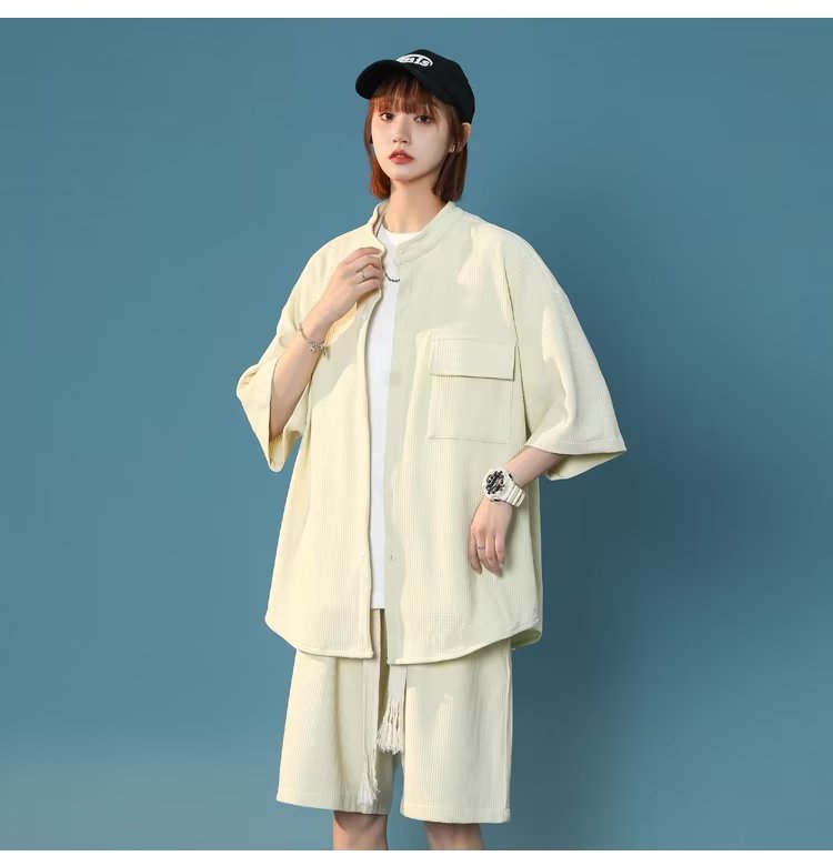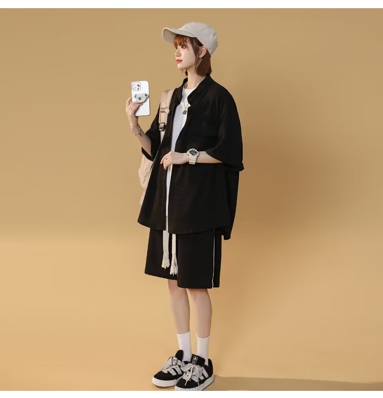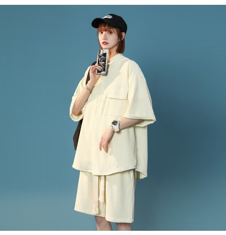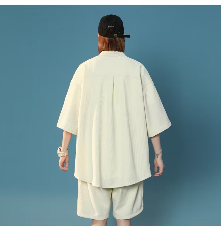 Moda 2024 nuevo estilo de Hong Kong traje de caída de seda de hielo de alta calidad pantalones cortos de camisa de manga corta para hombre estilo de tendencia de control de conjunto para hombre