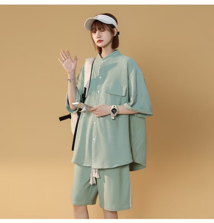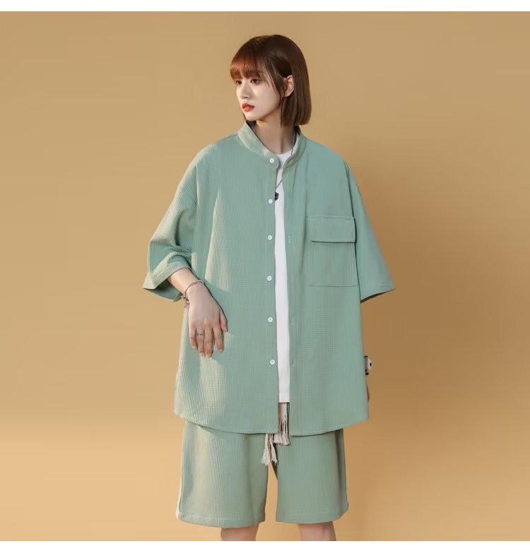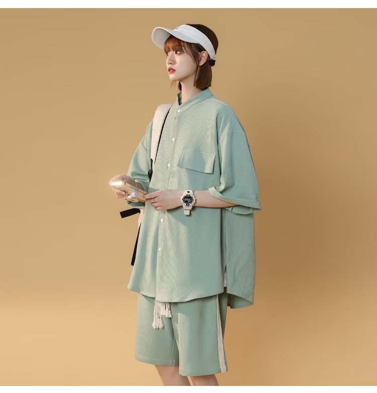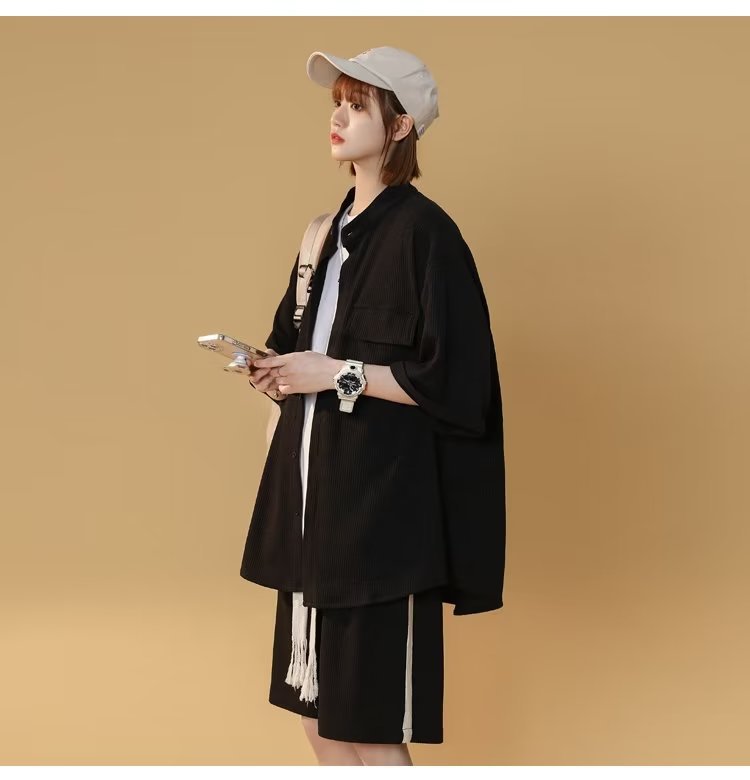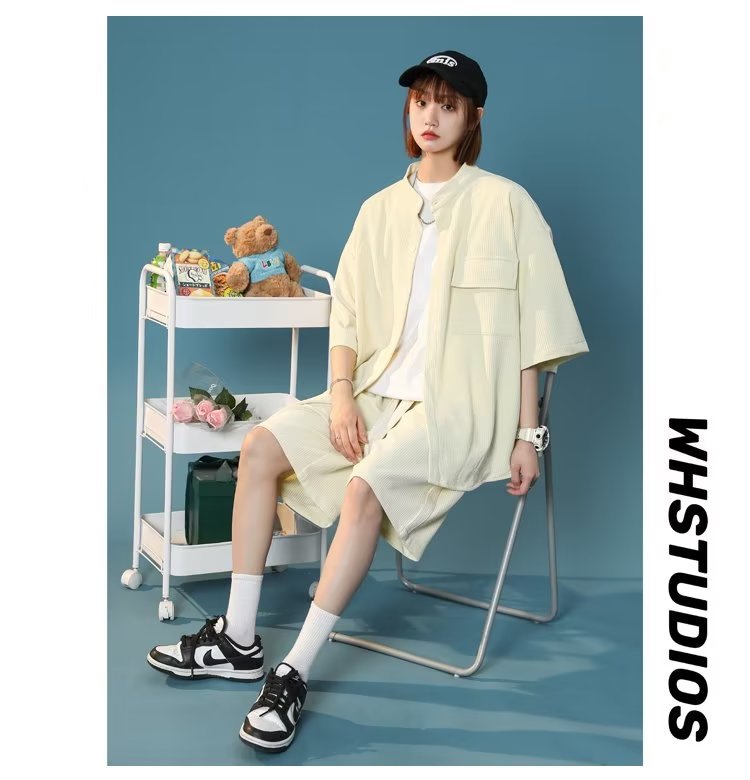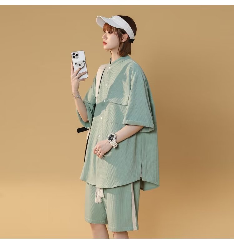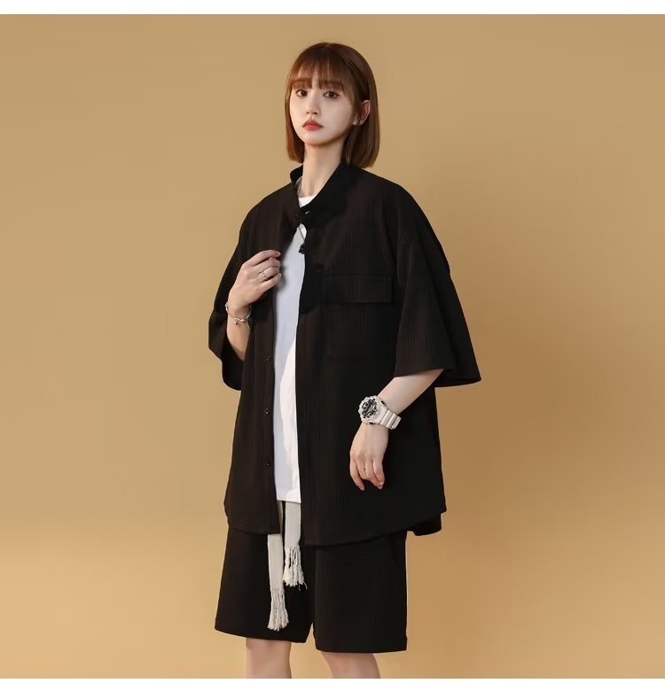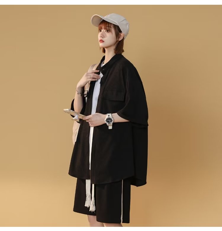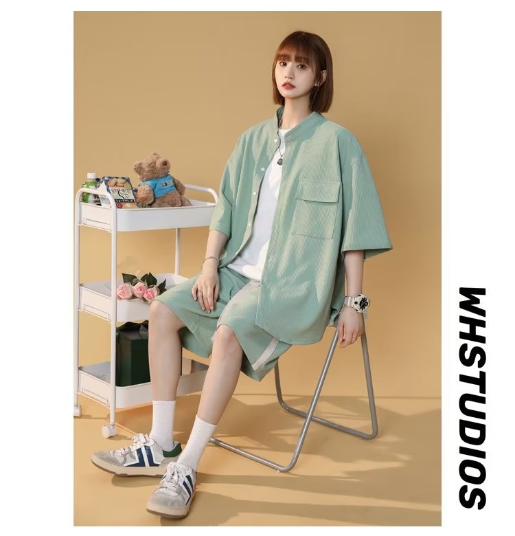 Moda 2024 nuevo estilo de Hong Kong traje de caída de seda de hielo de alta calidad pantalones cortos de camisa de manga corta para hombre estilo de tendencia de control de conjunto para hombre