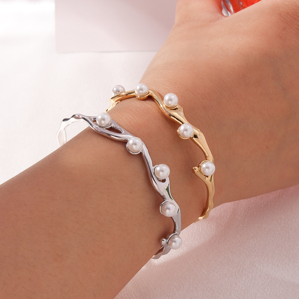 Venta caliente transfronteriza francés retro 18K chapado en oro, perlas de imitación onduladas irregulares, pulsera abierta que no se desvanece