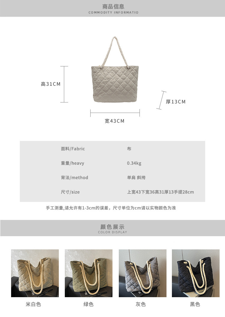 Otoño e invierno nuevo estilo ropa de algodón, bolso de hombro de trabajo de ocio simple de gran capacidad, bolso de viaje, bolso de mano, bolso de axila, mujer