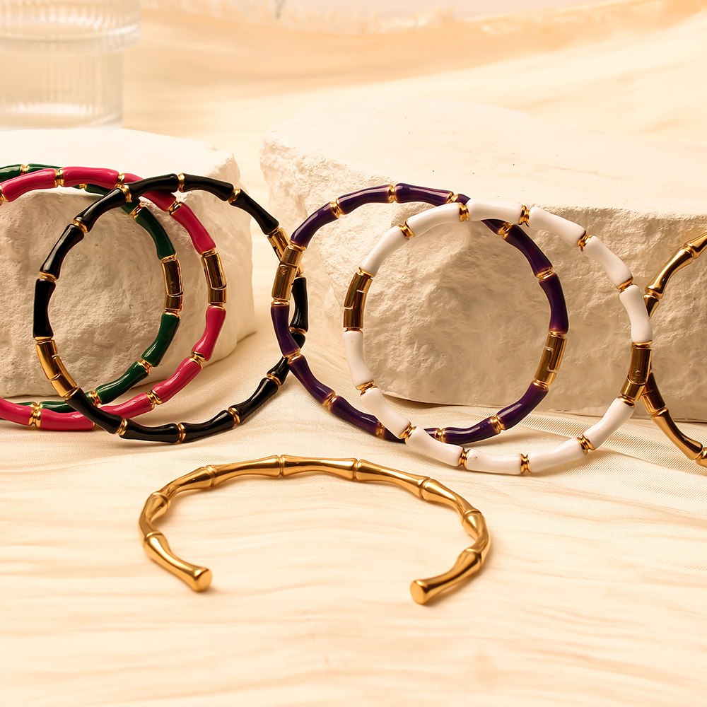 Venta caliente transfronteriza titanio acero bambú color goteo de aceite oro real 18K hebilla de galvanoplastia pulsera de mujer joyería fresca y dulce